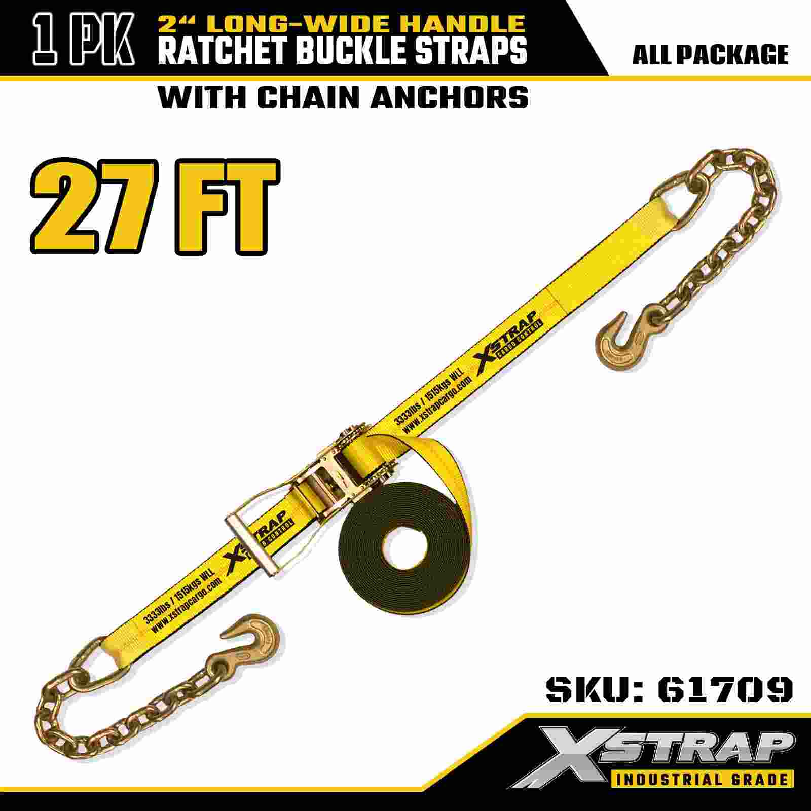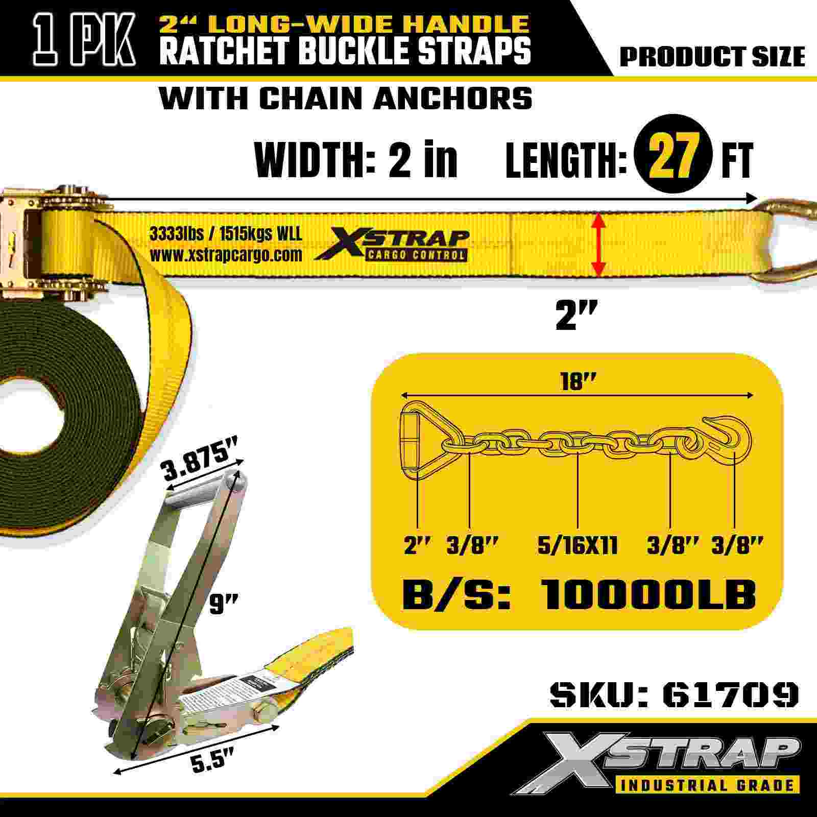 Xstrap 61709 Lange, brede håndtak skrallespennestropper 2" x 27 fot (1-pakke) med Kjedekroker, 10 000 lbs bruddstyrke, kraftig festestrop for sikker transport