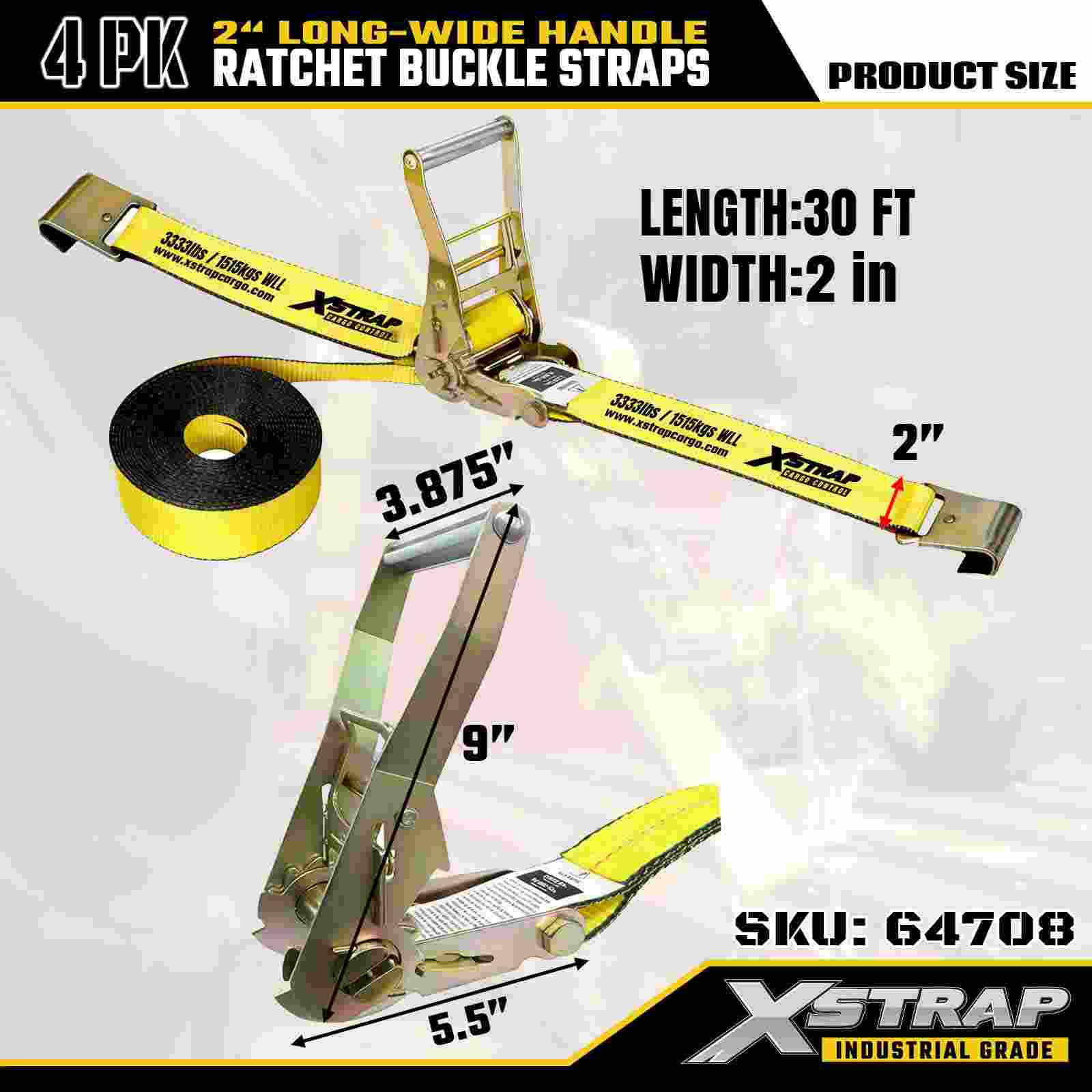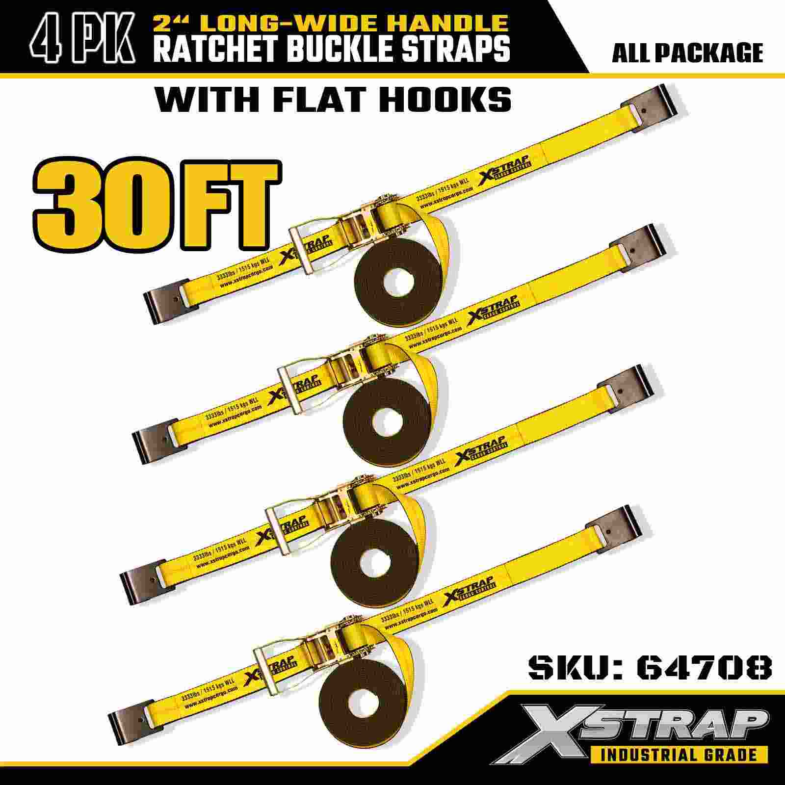 Xstrap 64708 2" x 30 fot utvidet håndtak med skrallespenne (4-pakning) – flate kroker, 10 000 lbs nominell styrke, industriell lastkontrollløsning