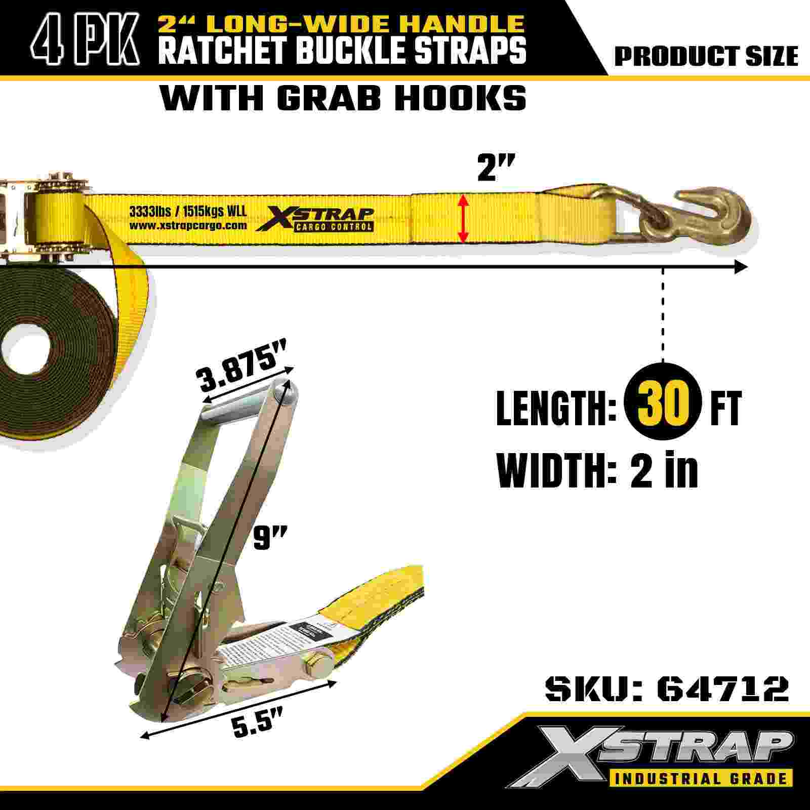 Xstrap 64712 2" x 30 fot lange, brede håndtak skrallespennestropper (4-pack) – gripekroker, 10 000 lbs kapasitet, kraftig feste for transport av stort utstyr