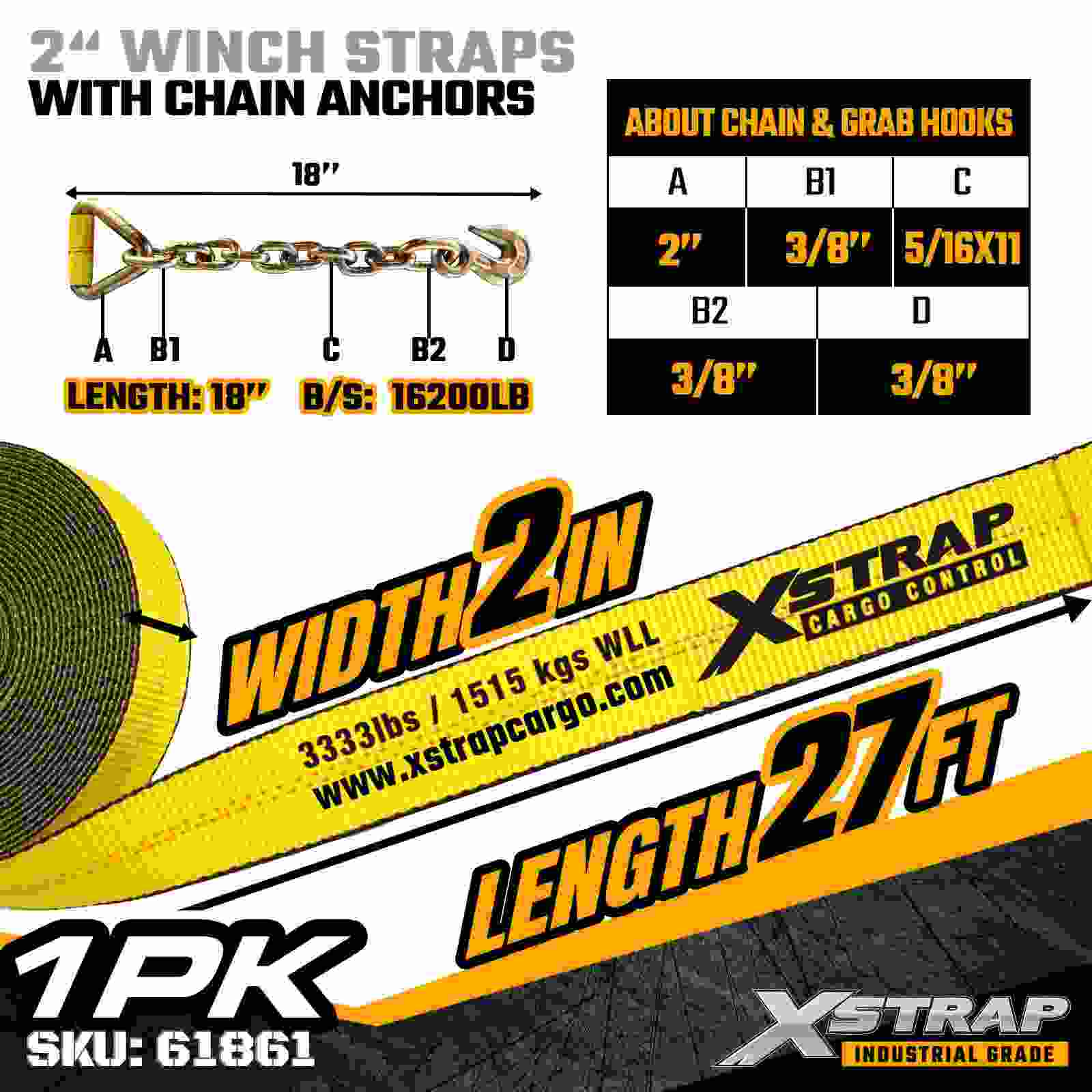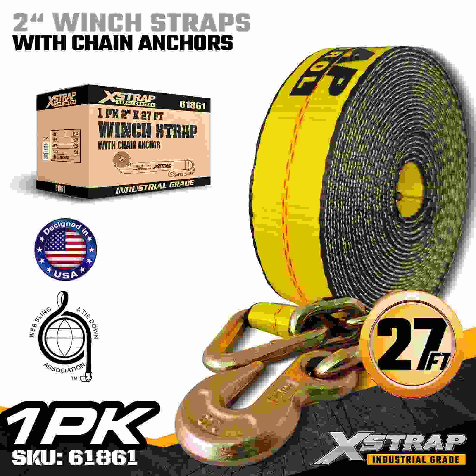 Xstrap 61861 2" × 27 fot standard vinsjstropp er bygget for pålitelig lastsikring i flatbed, med slitesterke kjedeankere og høystyrke polyesterbånd. Med en arbeidsbelastningsgrense på 3333 lbs og 10 000 lbs bruddstyrke, gir den pålitelig ytelse, daglig last, last, lasterør og generell last på paller, lasterør og lastrør. logistikkapplikasjoner.