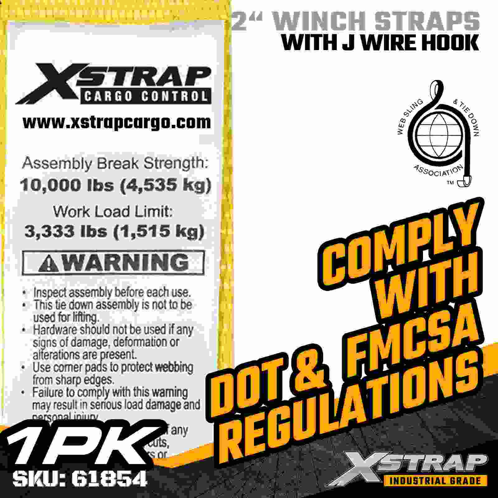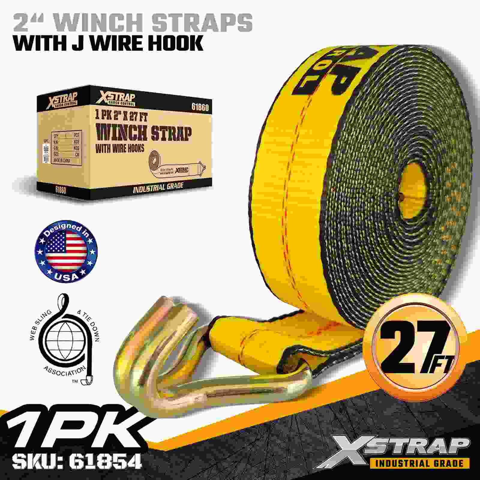 Xstrap 61854 2" × 27 fot Standard Winch Strap er en slitesterk og pålitelig lastsikringsløsning designet for planhengere og profesjonell transport. Med en sterk Trådkrok og høystyrke polyesterbånd, gir denne 2-tommers vinsjstroppen en 3333 lbs arbeidslastgrense og 1000 lbs. paller, trelast, rør, maskineri og generell frakt under daglige transporter.