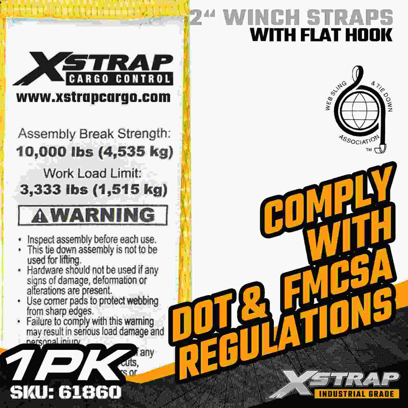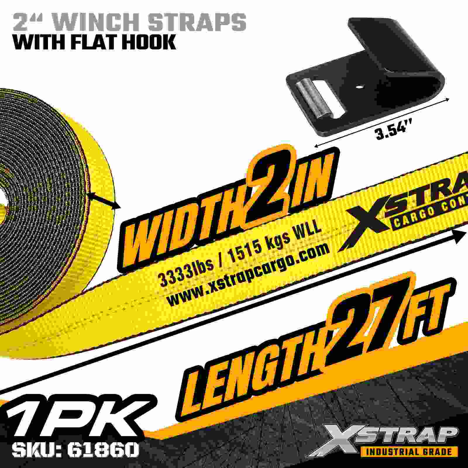Xstrap 61860 2" × 27 fot standard vinsjstropp er bygget for pålitelig lastsikring i flatbed, med en forsterket flat krok og høystyrke polyesterbånd. Med en arbeidsbelastningsgrense på 3333 lbs og 10 000 lbs bruddstyrke, gir den pålitelig ytelse for godstransport, daglig godslast og generell last på paller og paller. applikasjoner