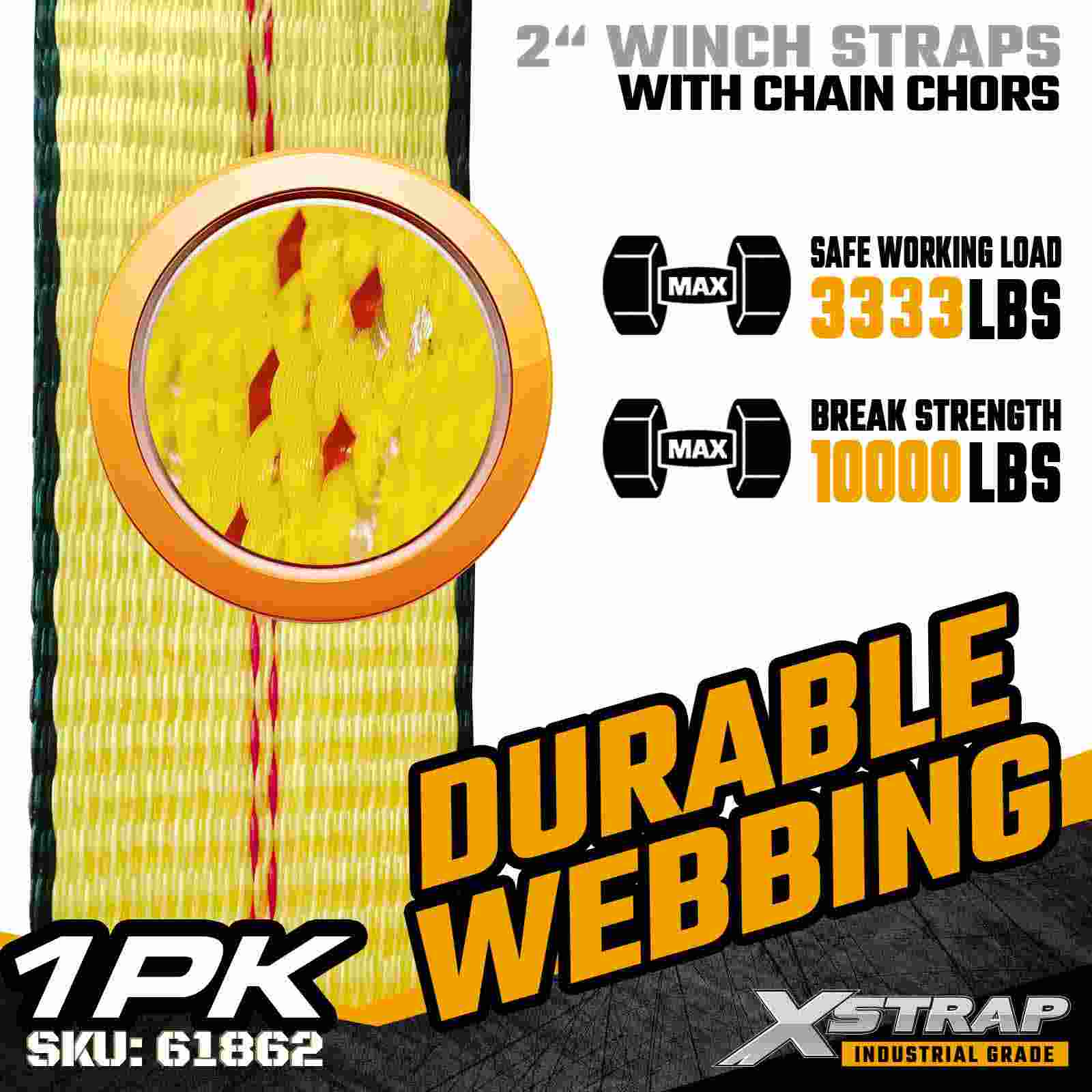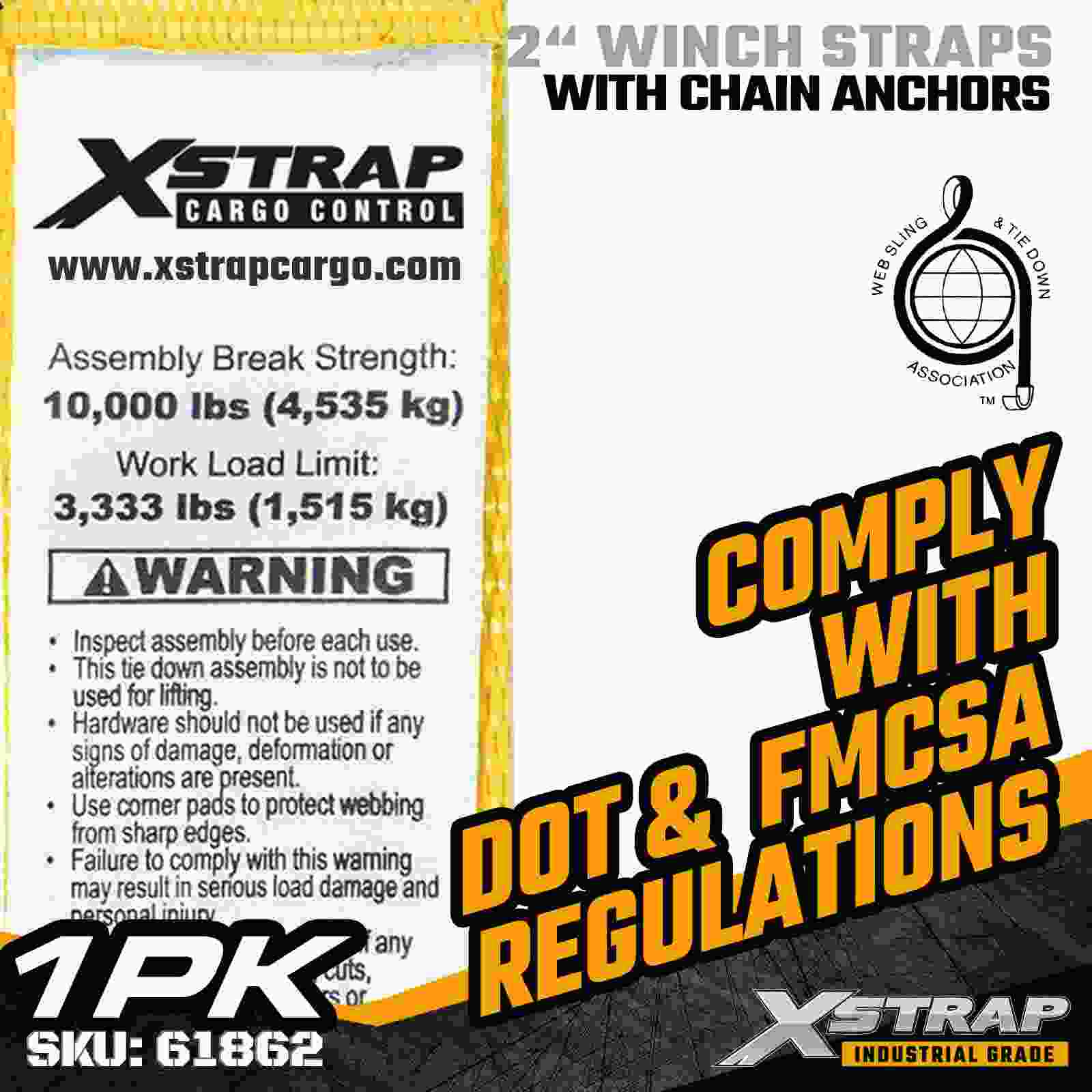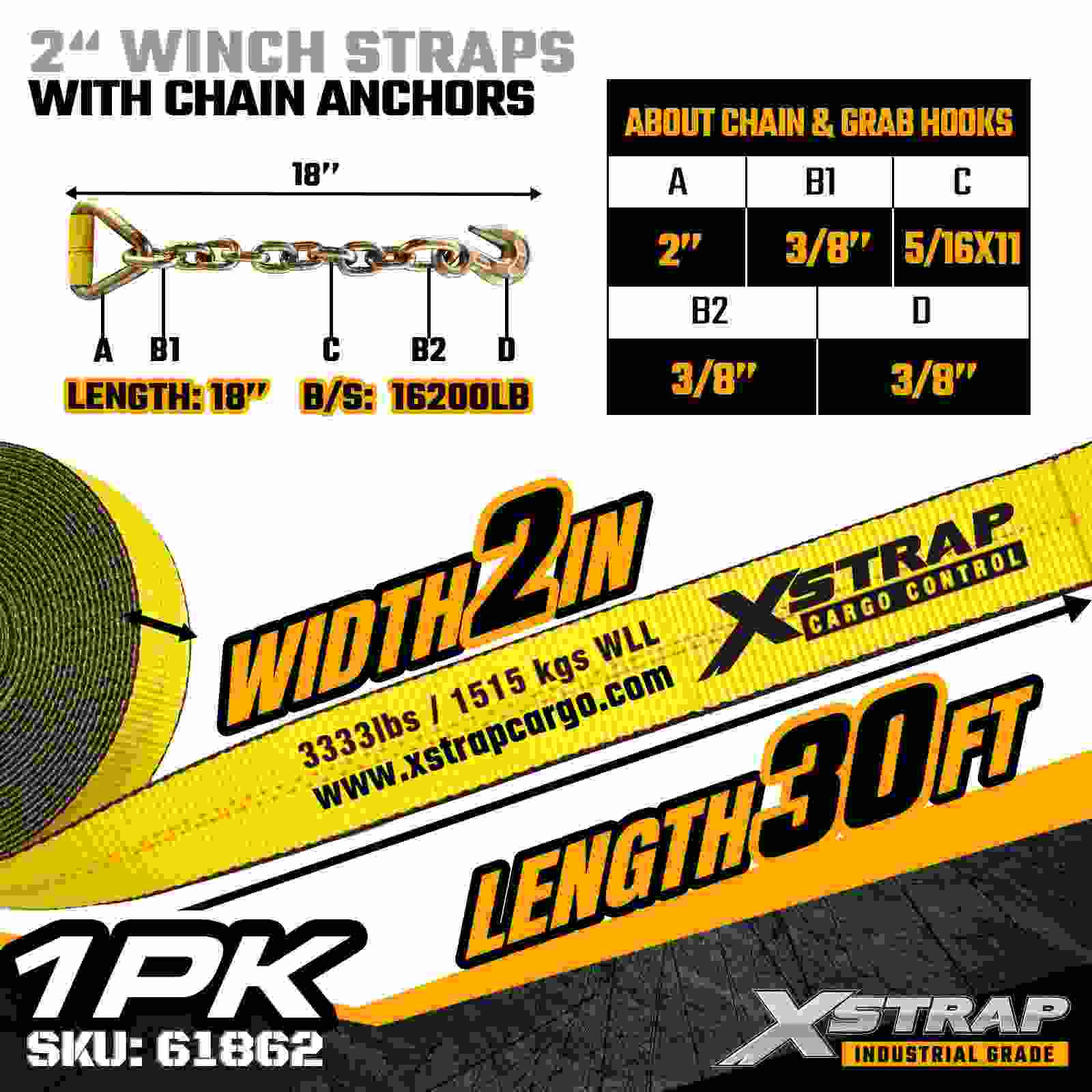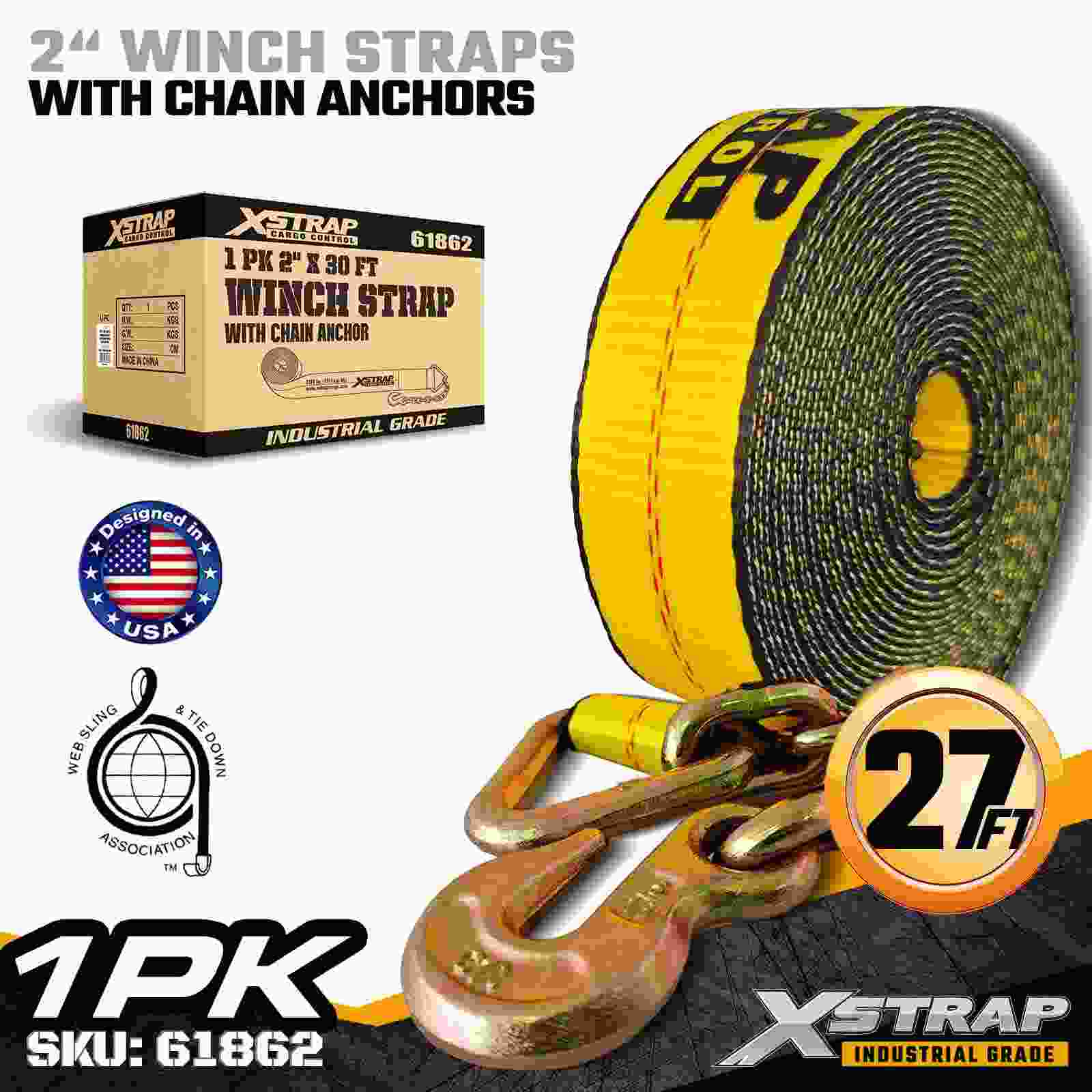 Xstrap 61862 2" × 30 fot standard vinsjstropp er bygget for pålitelig lastsikring i flatbed, med slitesterke kjedeankere og høystyrke polyesterbånd. Med en arbeidsbelastningsgrense på 3333 lbs og 10 000 lbs bruddstyrke, gir den pålitelig ytelse for daglig last, paller, lasterør og generell belastning på paller, lasterør og generell last. logistikkapplikasjoner.