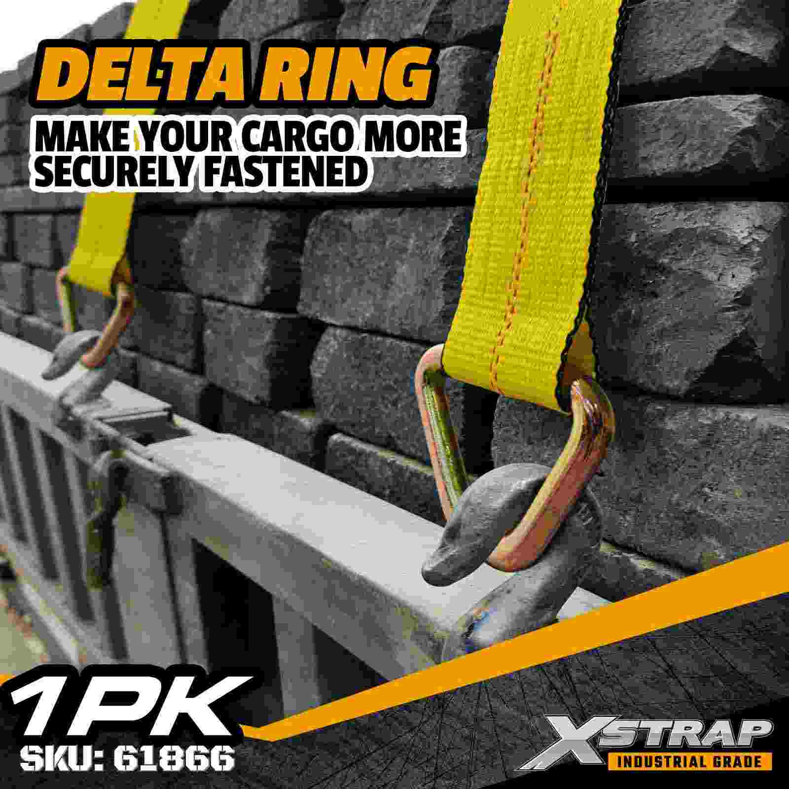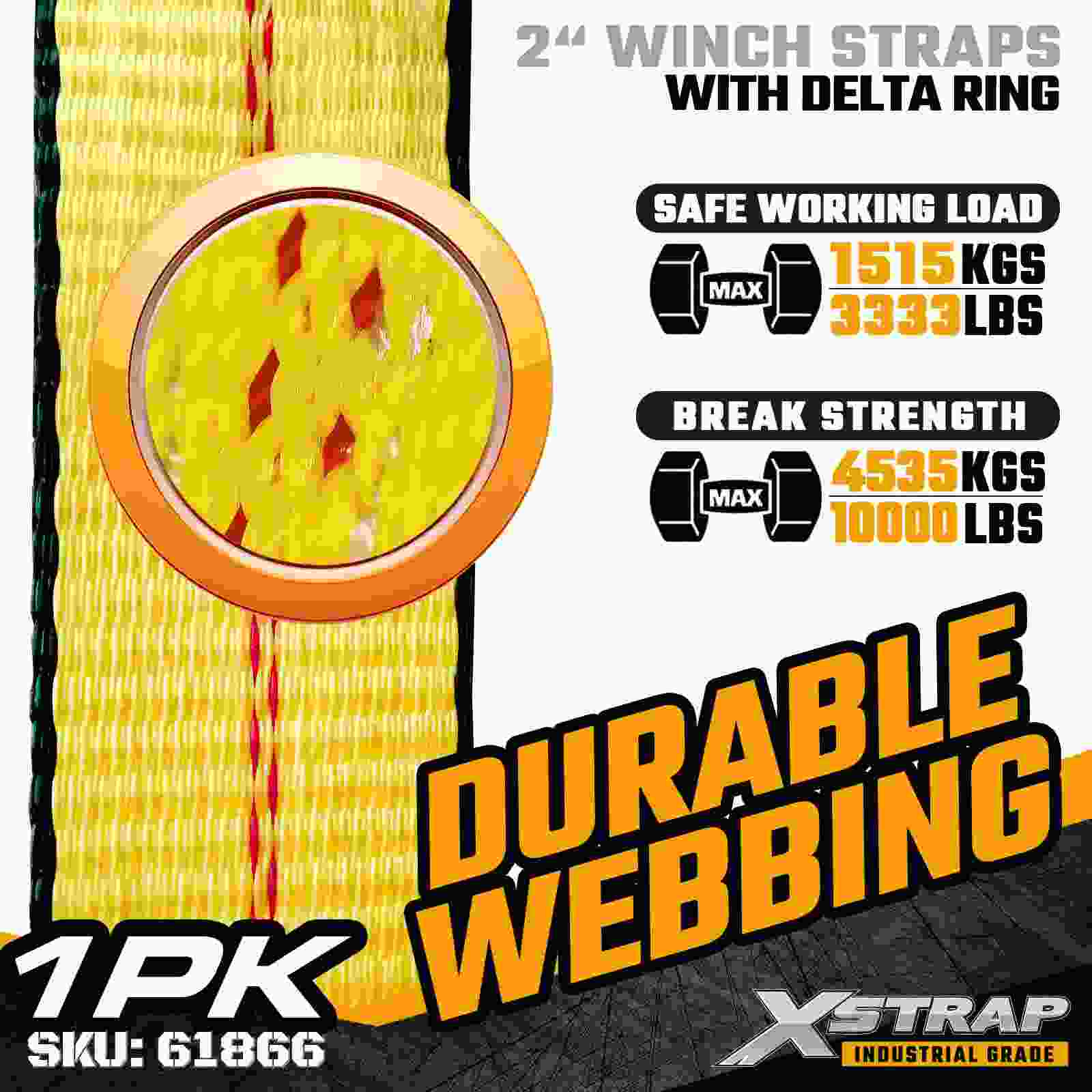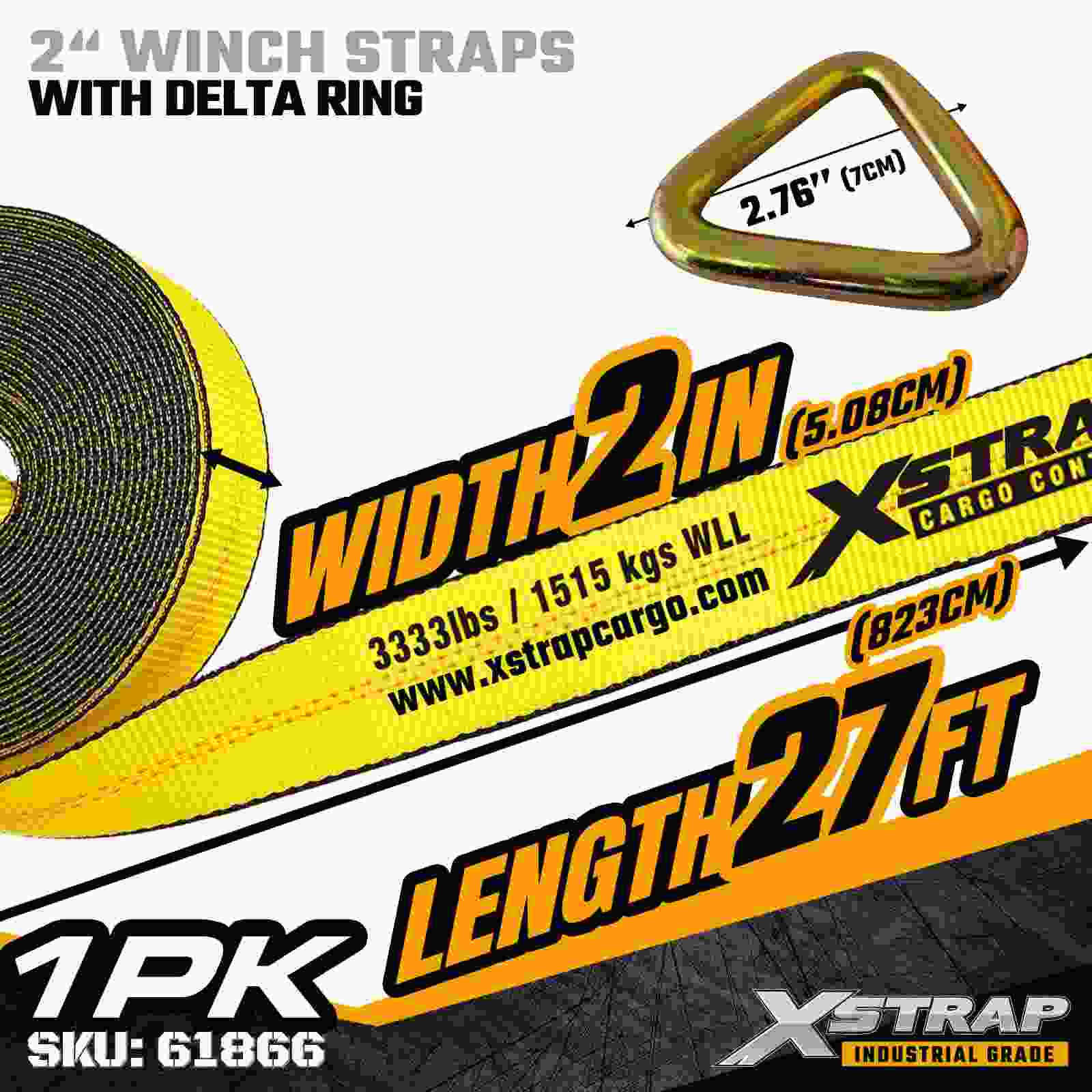 Xstrap 61866 2" × 27 fot Standard Winch Strap er en slitesterk og pålitelig lastsikringsstropp designet for planhengere og profesjonell transport. Med en sterk Delta-ring og høystyrke polyesterbånd gir denne 2-tommers vinsjstroppen en 3333 lbs arbeidslastgrense og 10,00 paller er ideell for 10,00 paller. trelast, rør, maskineri og generell gods under daglige transporter.