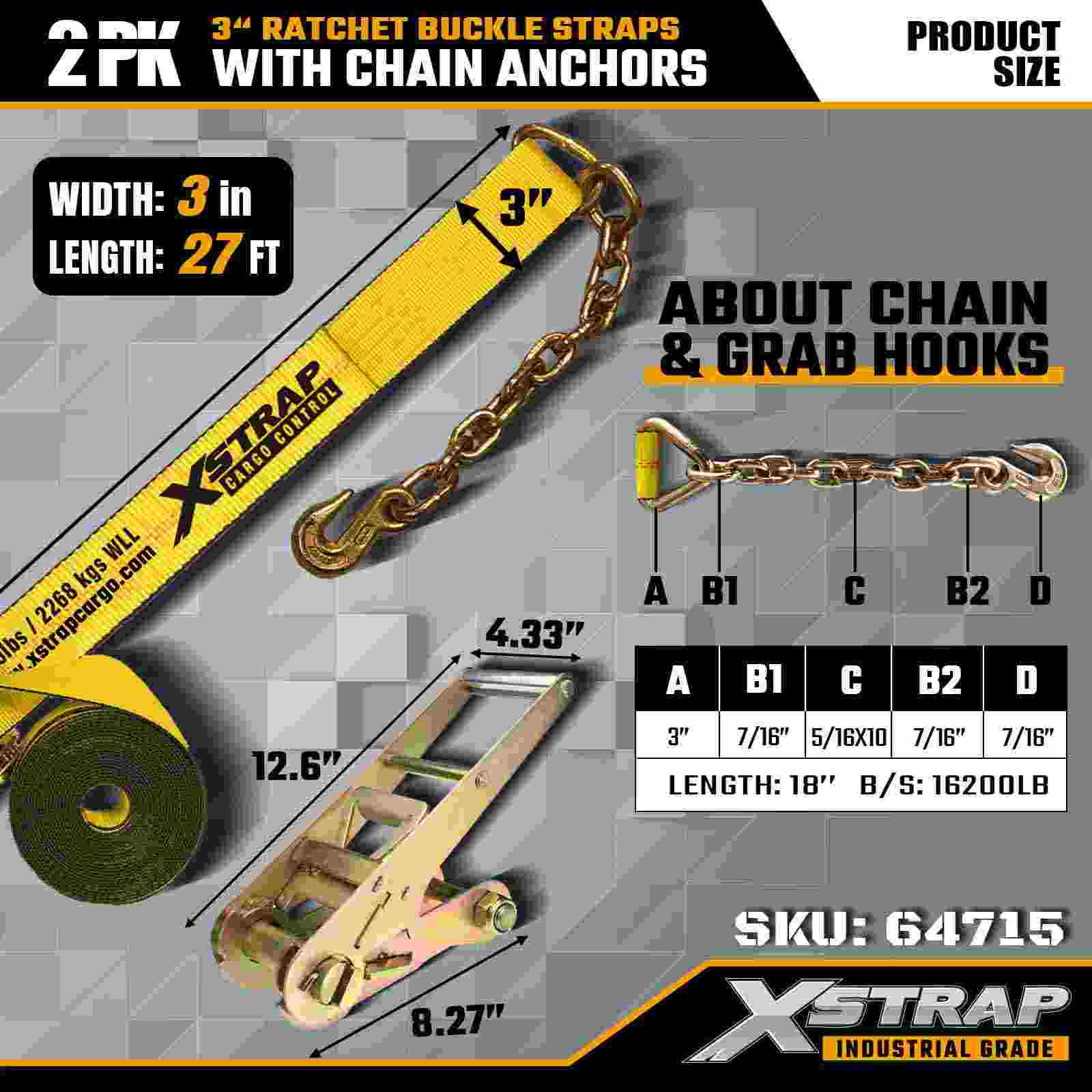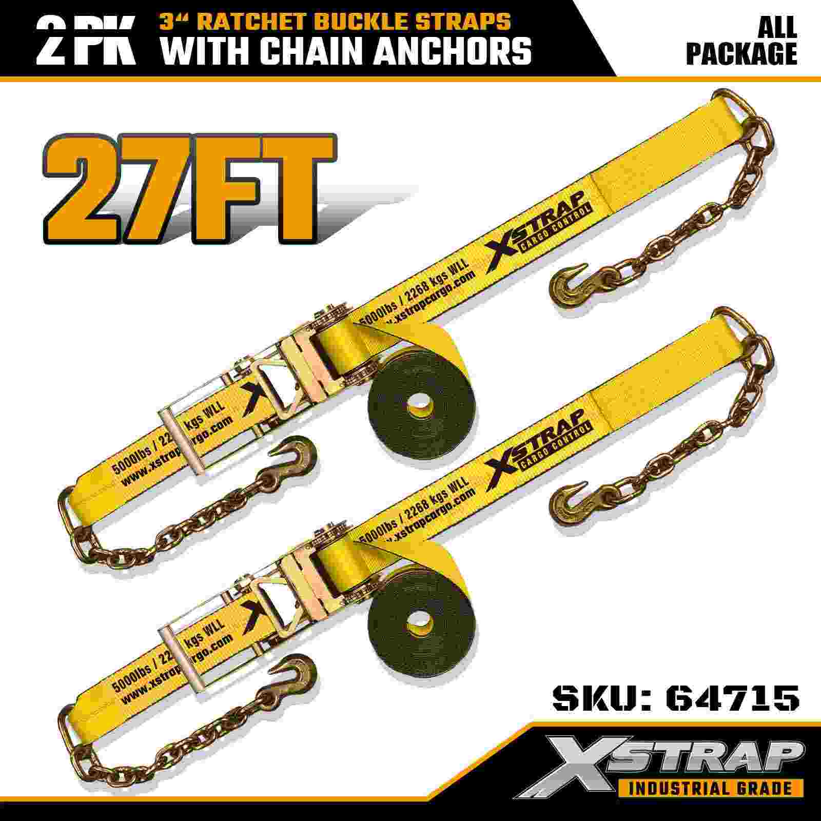 Xstrap 64715 3" × 27 fot skrallespennestropper (2-pack) – utstyrt med kraftige kjedeankere, konstruert for krevende lastemiljøer. Med en arbeidsbelastningsgrense på 5000 pund og 15.000 pund bruddstyrke, leverer disse stroppene stabile, stabile, stabile og stabile maskinstroppene for profesjonell,-grad maskin transport og industriell transport.