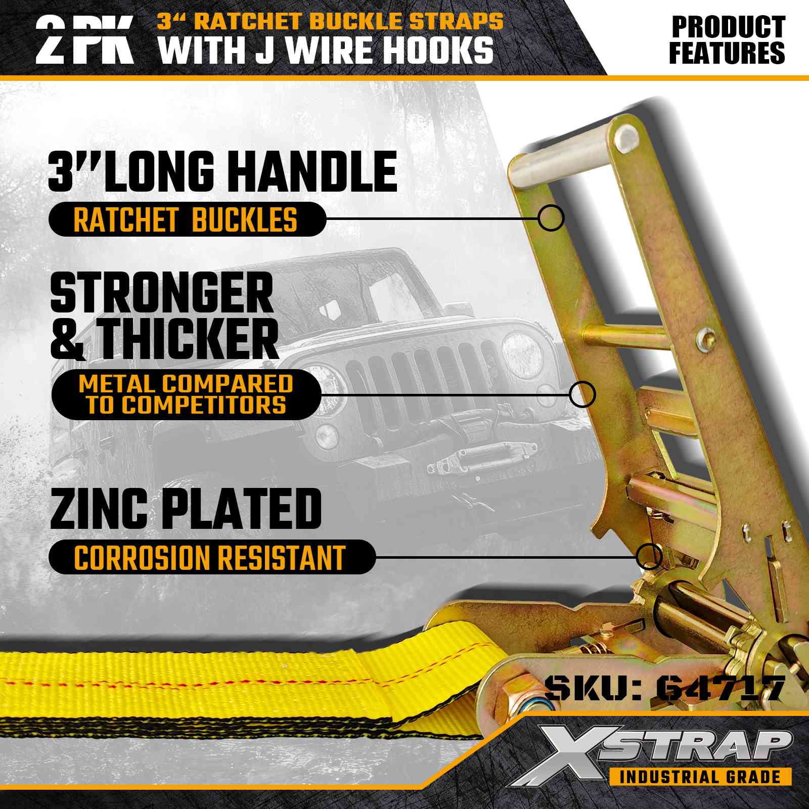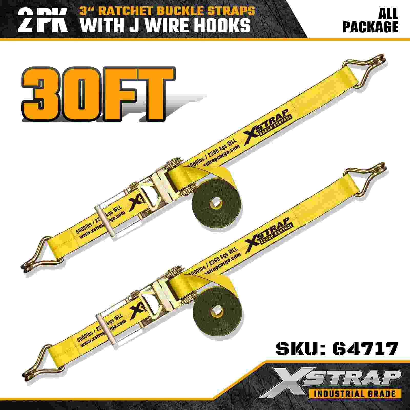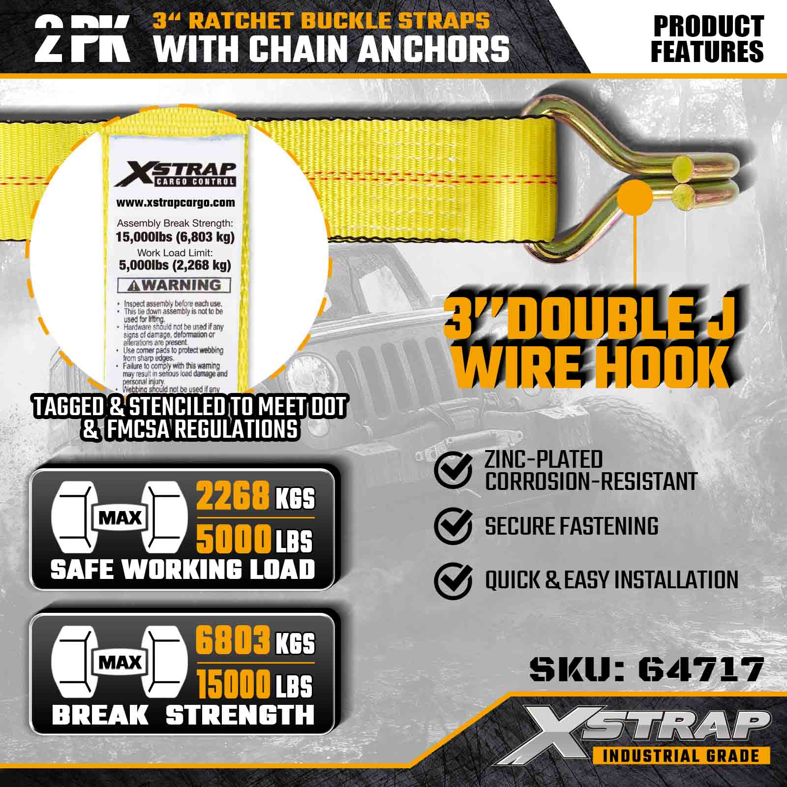 Xstrap 64717 3" × 30 fot skrallespennestropper (2-pakning) er konstruert for profesjonell lastsikring, med forsterkede wirekroker og en kraftig skrallemekanisme. Med en 5000 lbs arbeidsbelastningsgrense og 15 000 15 000 lbs, leverer disse pålitelige lbs, lang rekkevidde, flate strekkremmer for bruddstyrke. transport og industriell transportvirksomhet.