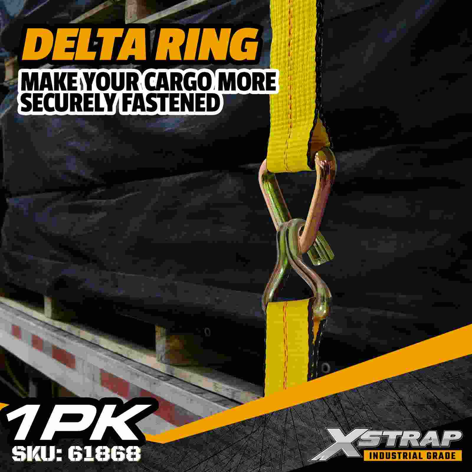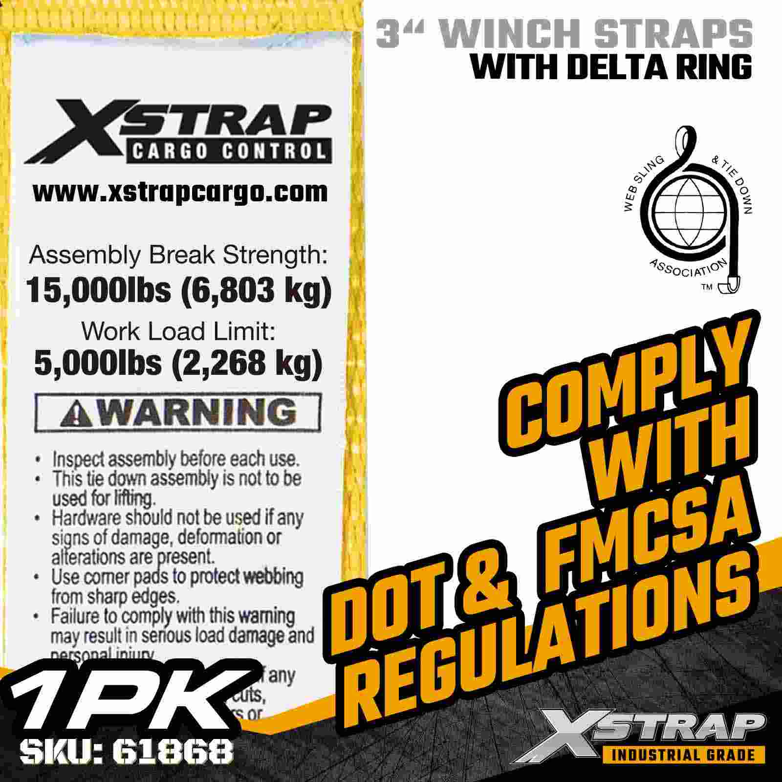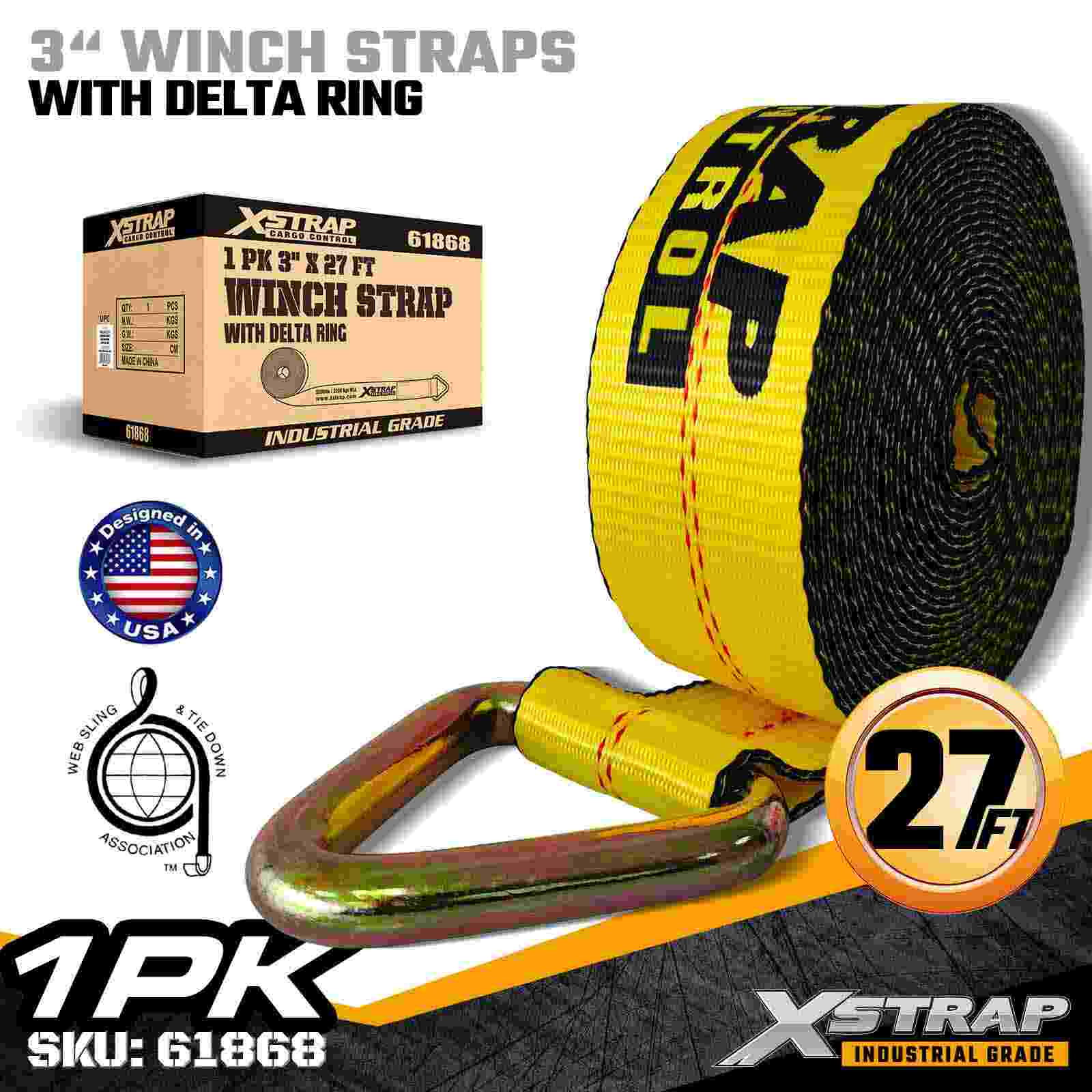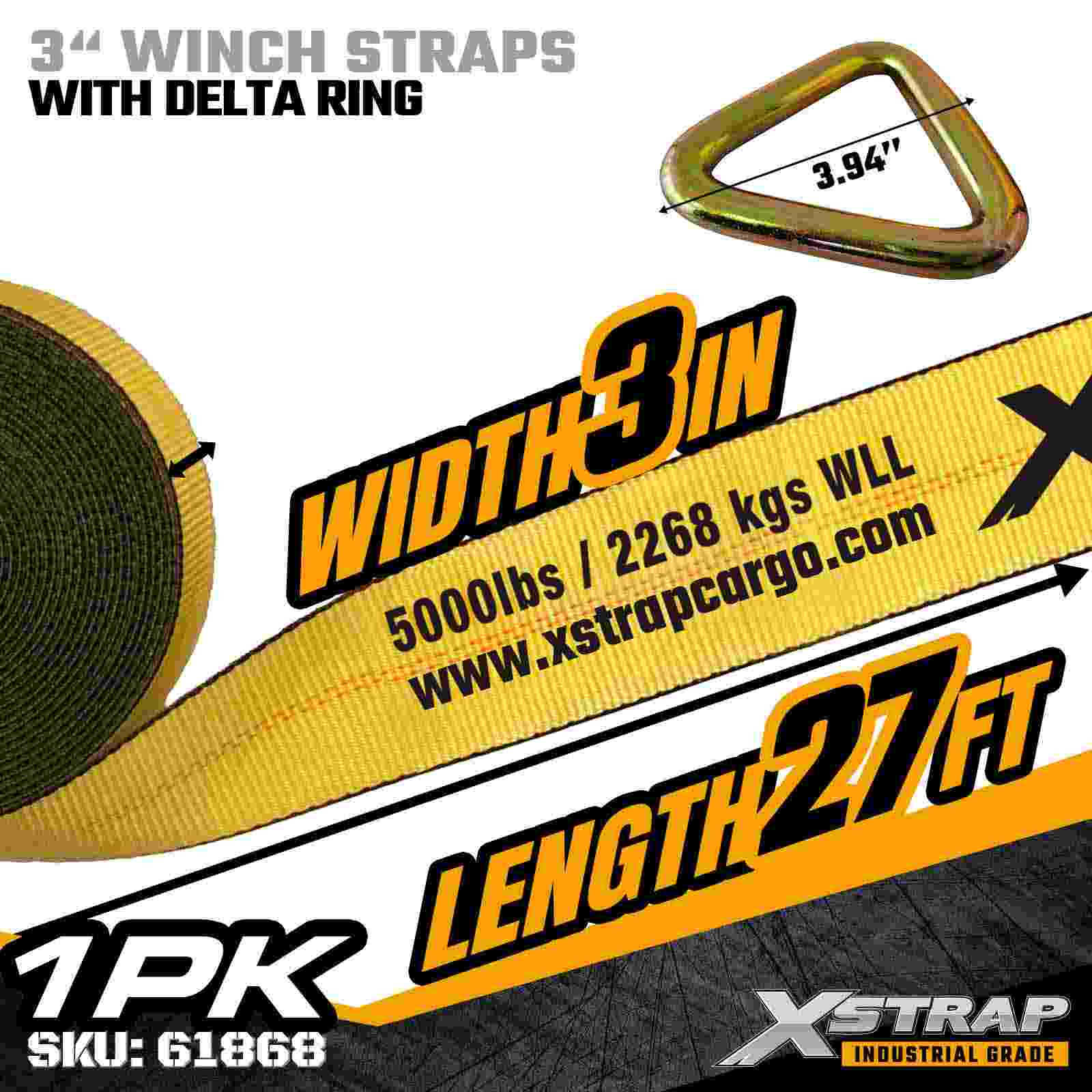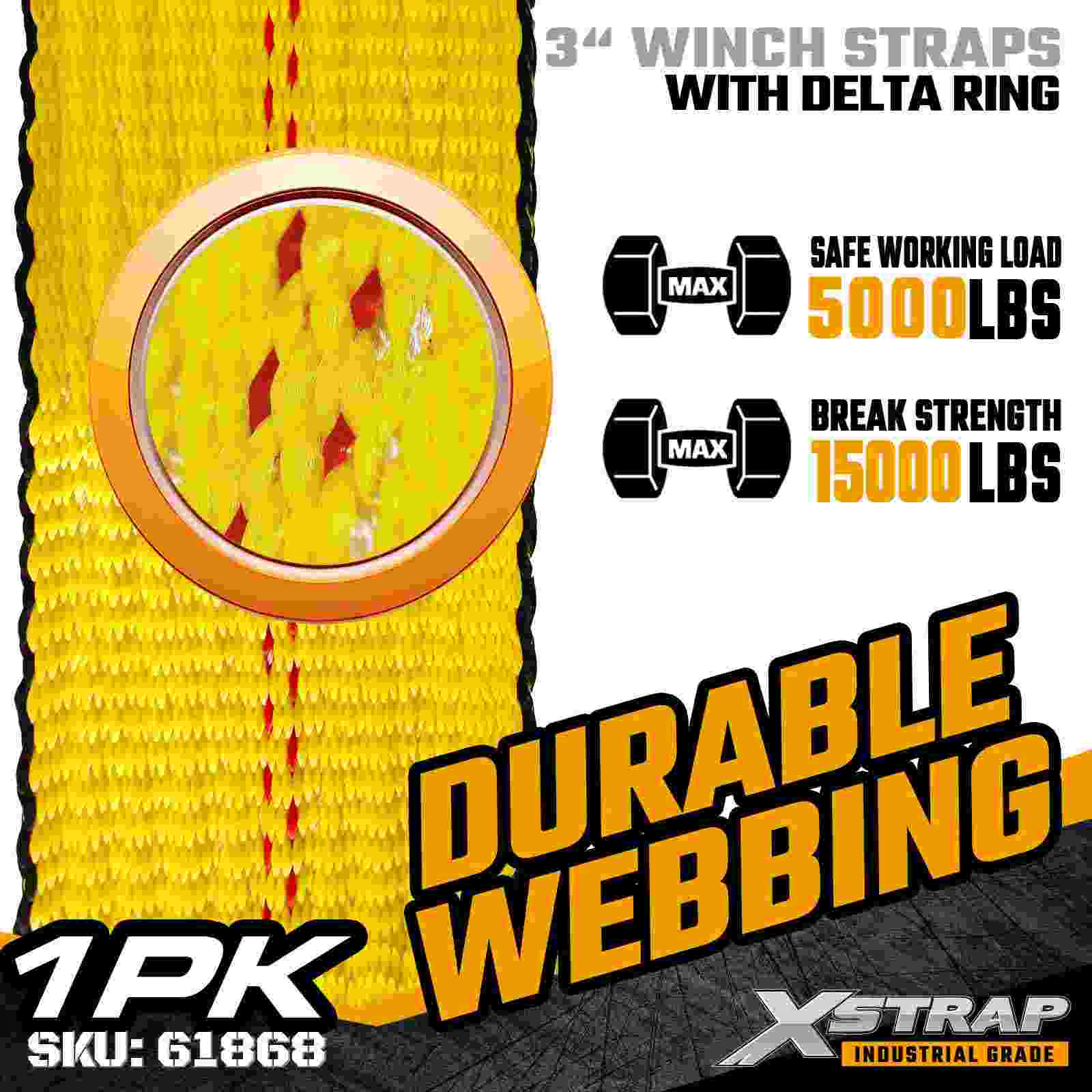 Xstrap 61868 3" × 27 fot Standard Winch Strap er en kraftig lastsikringsløsning designet for planhengere og høykapasitetstransport. Med en forsterket Delta-ring og ekstra bred 3-tommers polyestervev, gir denne 3-tommers vinsjstroppen en 5000 lbs og 0 lbs og 0,000 lb. er ideell for sikring av overdimensjonert last som trelast, stål, maskineri og industriell frakt under krevende transportoperasjoner.
