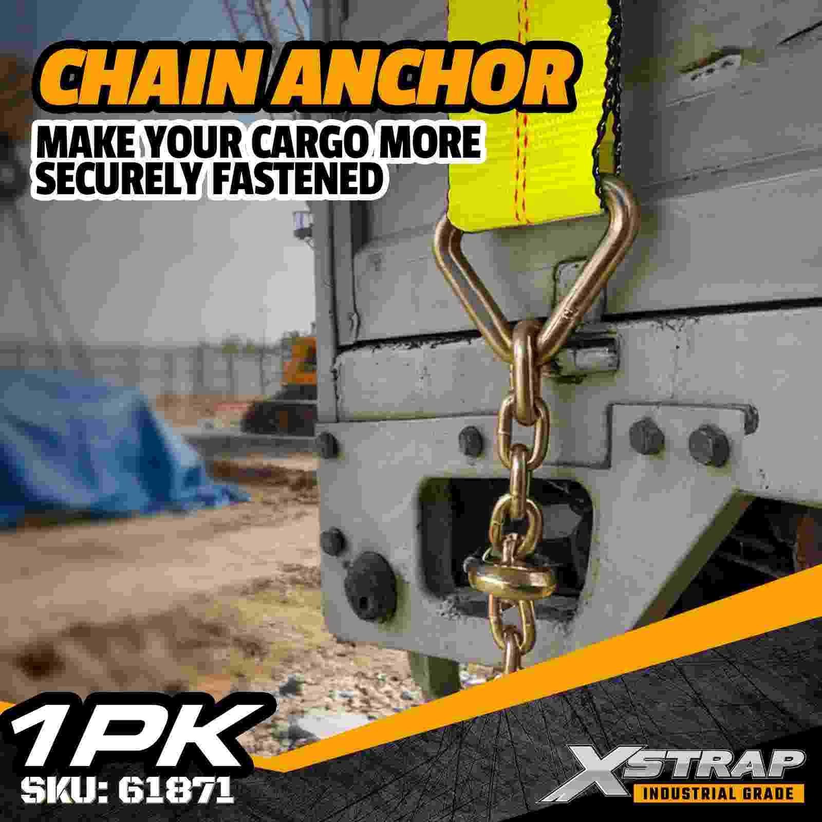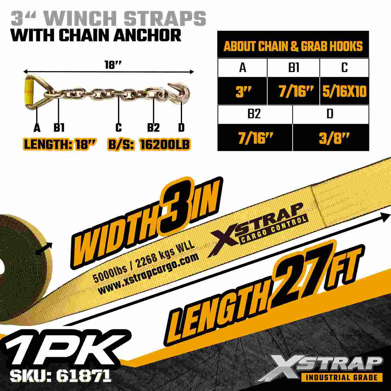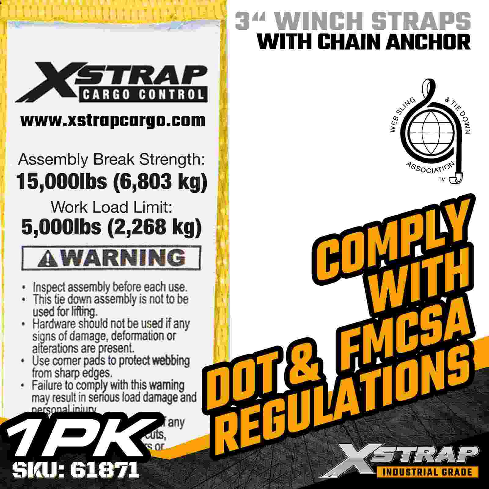 Xstrap 61871 3" × 27 fot standard vinsjstropp er konstruert for kraftig lastsikring på planhengere. Med et smidd kjedeanker og ekstra bred 3-tommers polyesterbånd, leverer denne 3-tommers vinsjremmen en 5000 lbs arbeidslastgrense, den er designet for 1 lb 5000000000 og 100 kg. krevende industrielle applikasjoner hvor maksimal holdestyrke og stabilitet kreves.