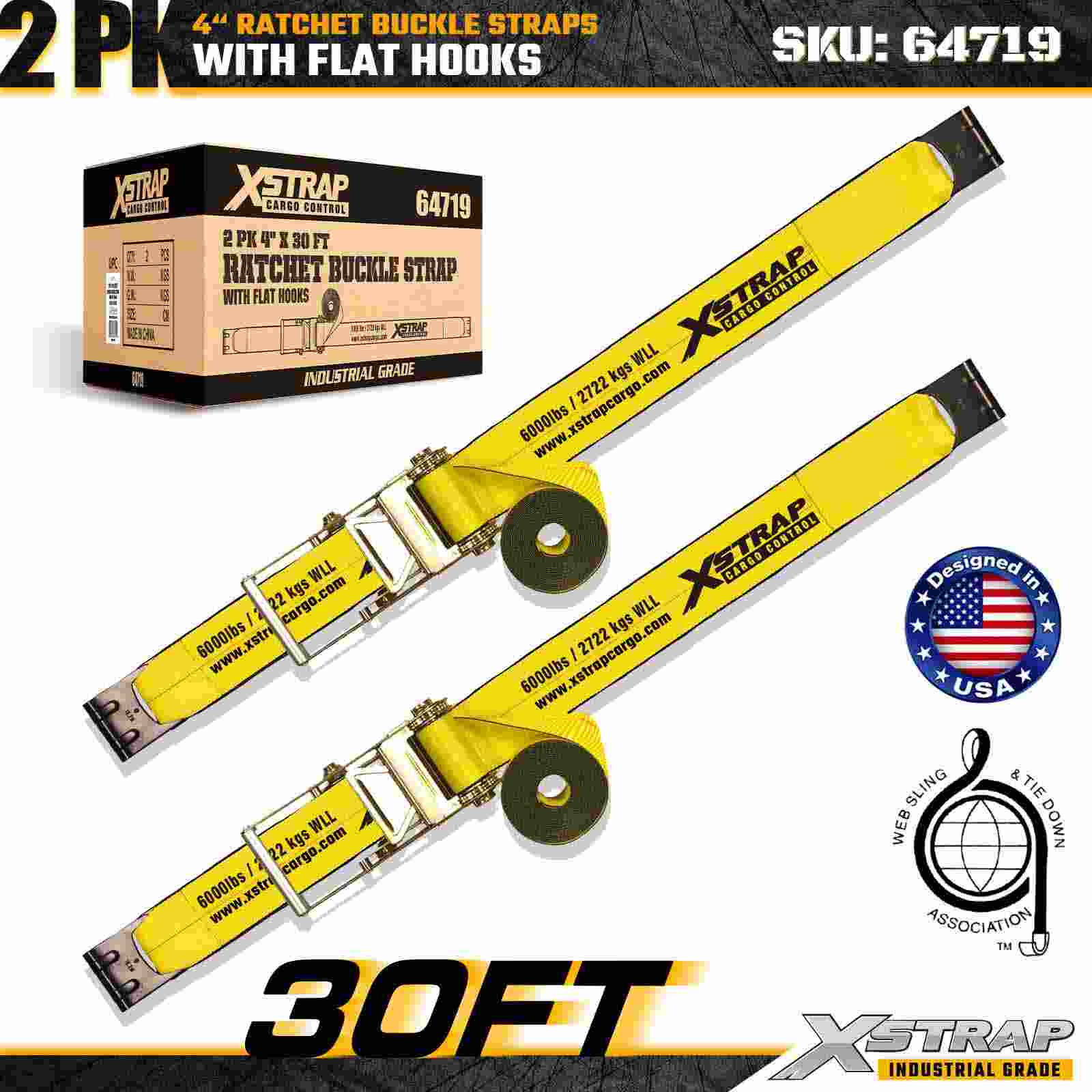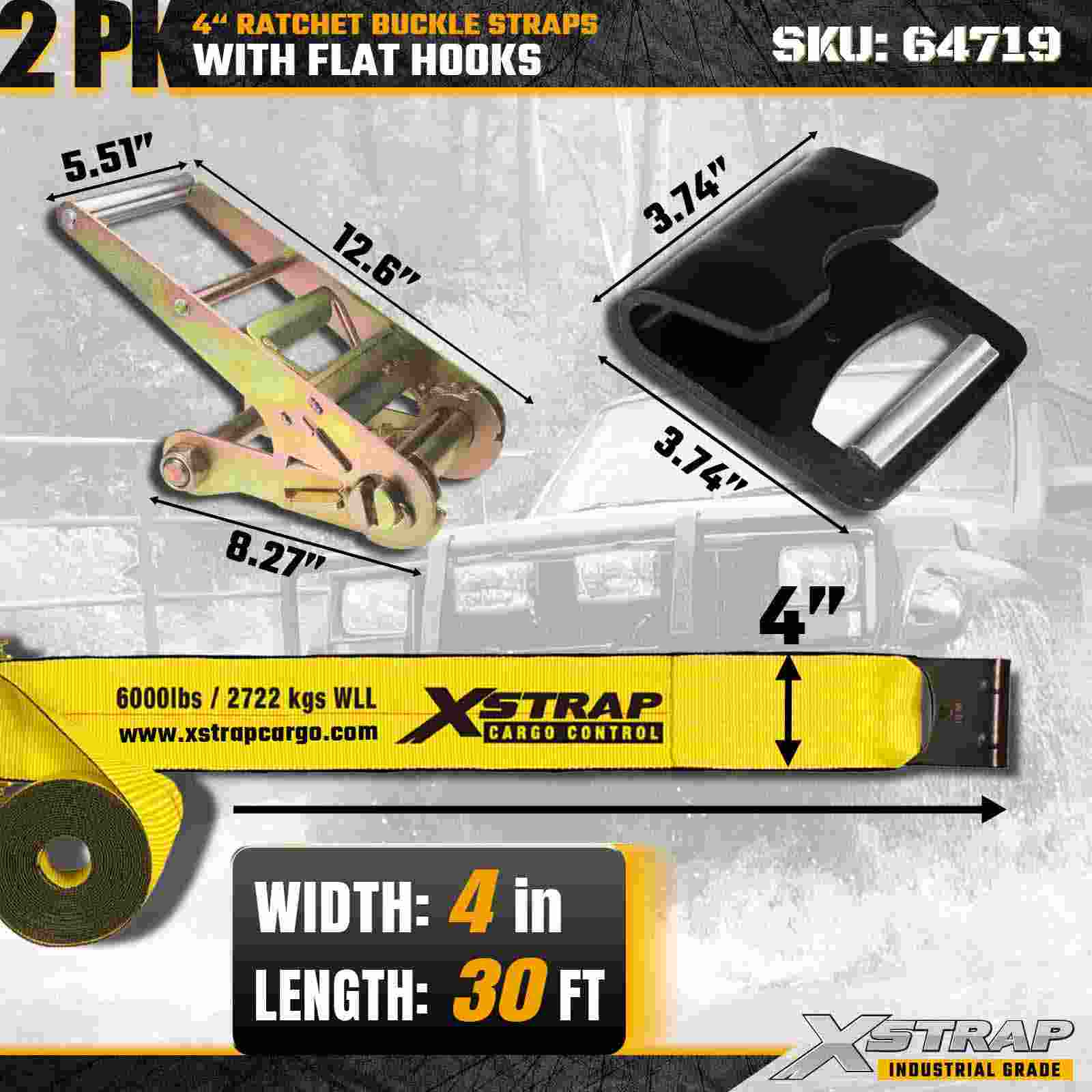 Xstrap 64719 4" × 30 fot Skrallespenne Straps (2-pakning) leverer kraftig lastsikring med forsterkede flate kroker og en slitesterk skrallemekanisme. Vurdert til 6 000 lbs WLL og 18 000 lbs Break Strength, de er ideelle for industriell bruk i flate maskiner og transport av lastebiler.