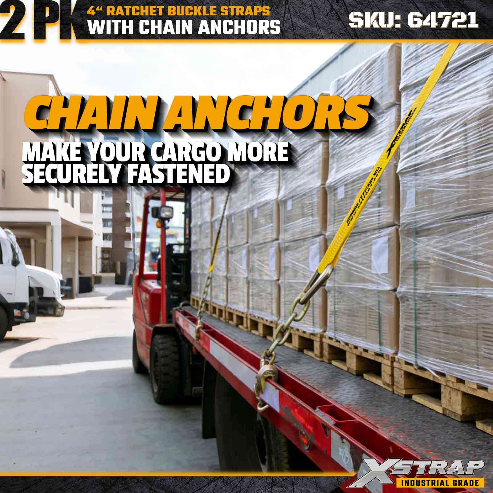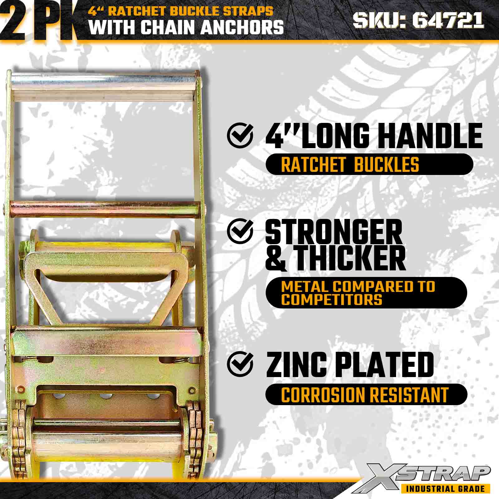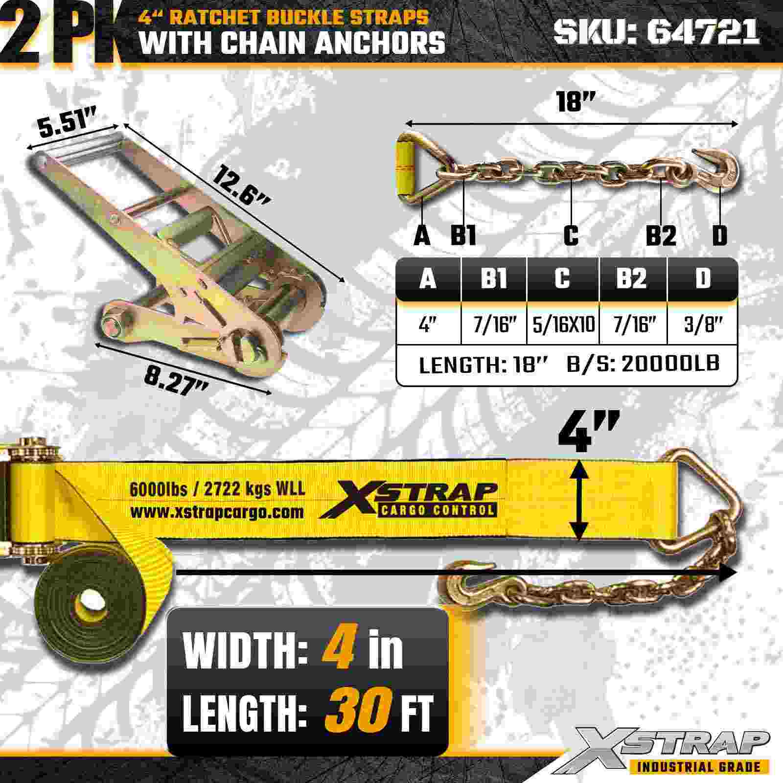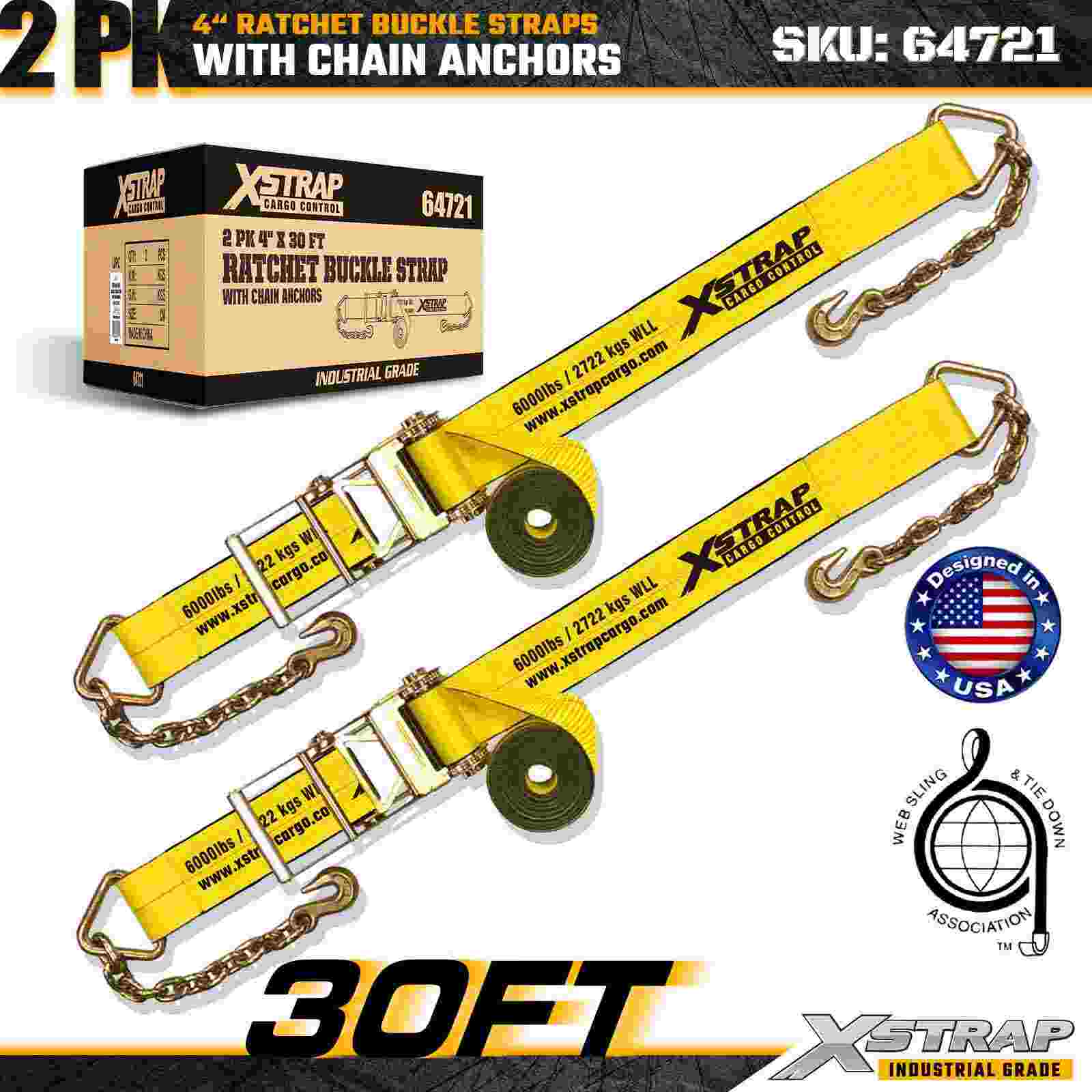 Xstrap 64721 4" × 30 fot skrallespennestropper (2-pakke) er konstruert for kraftig lastsikring, med robuste kjedeankre og en forsterket skrallemekanisme. Med en arbeidsbelastningsgrense på 6000 lbs og 18 000 lbs er ideelle for flate straps, for ha maskintransport, stållaster og industrielle lastapplikasjoner som krever maksimal styrke og pålitelighet.
