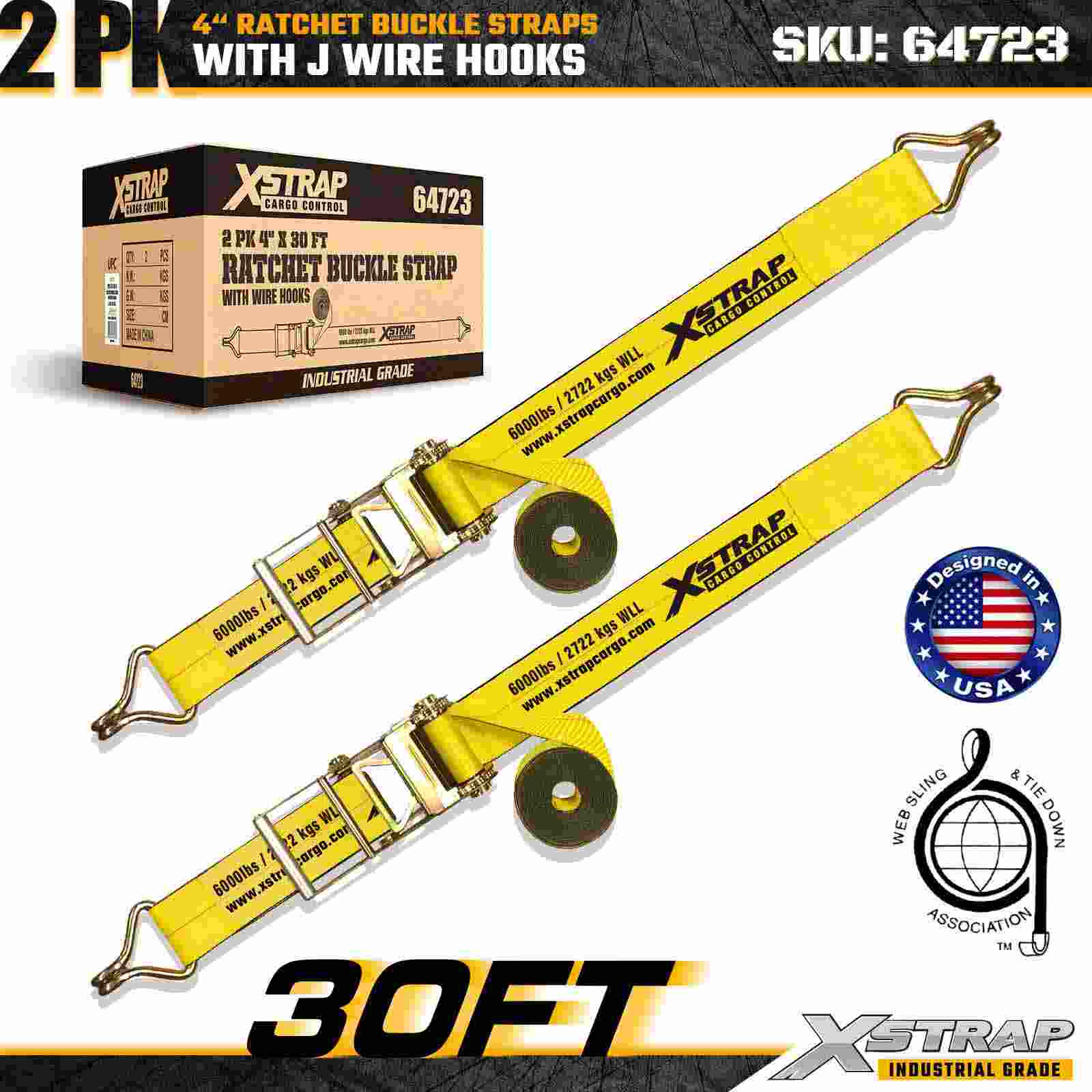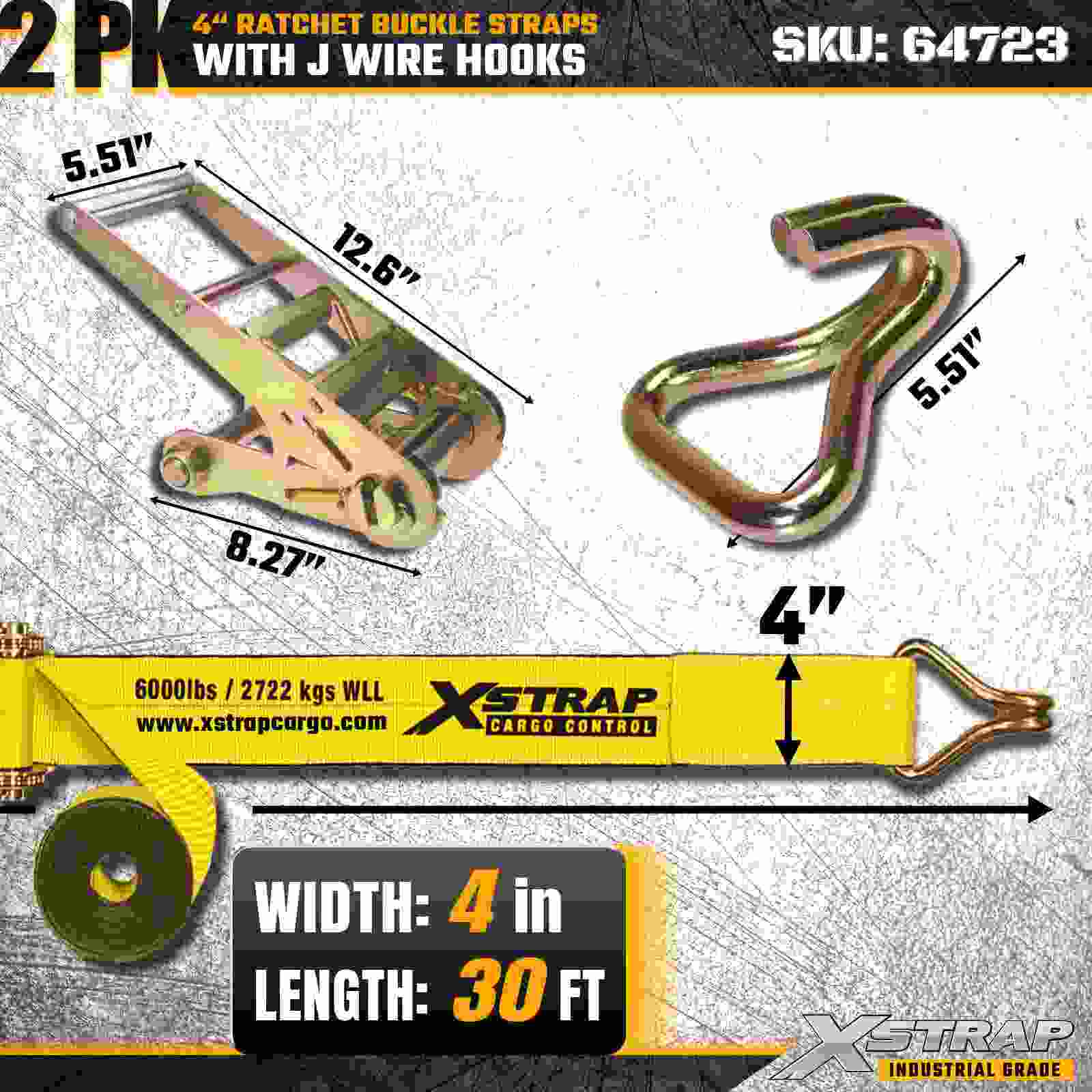 Xstrap 64723 4" × 30 fot skrallespennestropper (2-pack) er konstruert for kraftig lastsikring, med forsterkede trådkroker og en slitesterk skrallemekanisme. Med en arbeidsbelastningsgrense på 6000 lbs og 18 000 lbs er ideelle for flate straps, ha. maskineritransport, trelast, stållaster og industrielle lastapplikasjoner.
