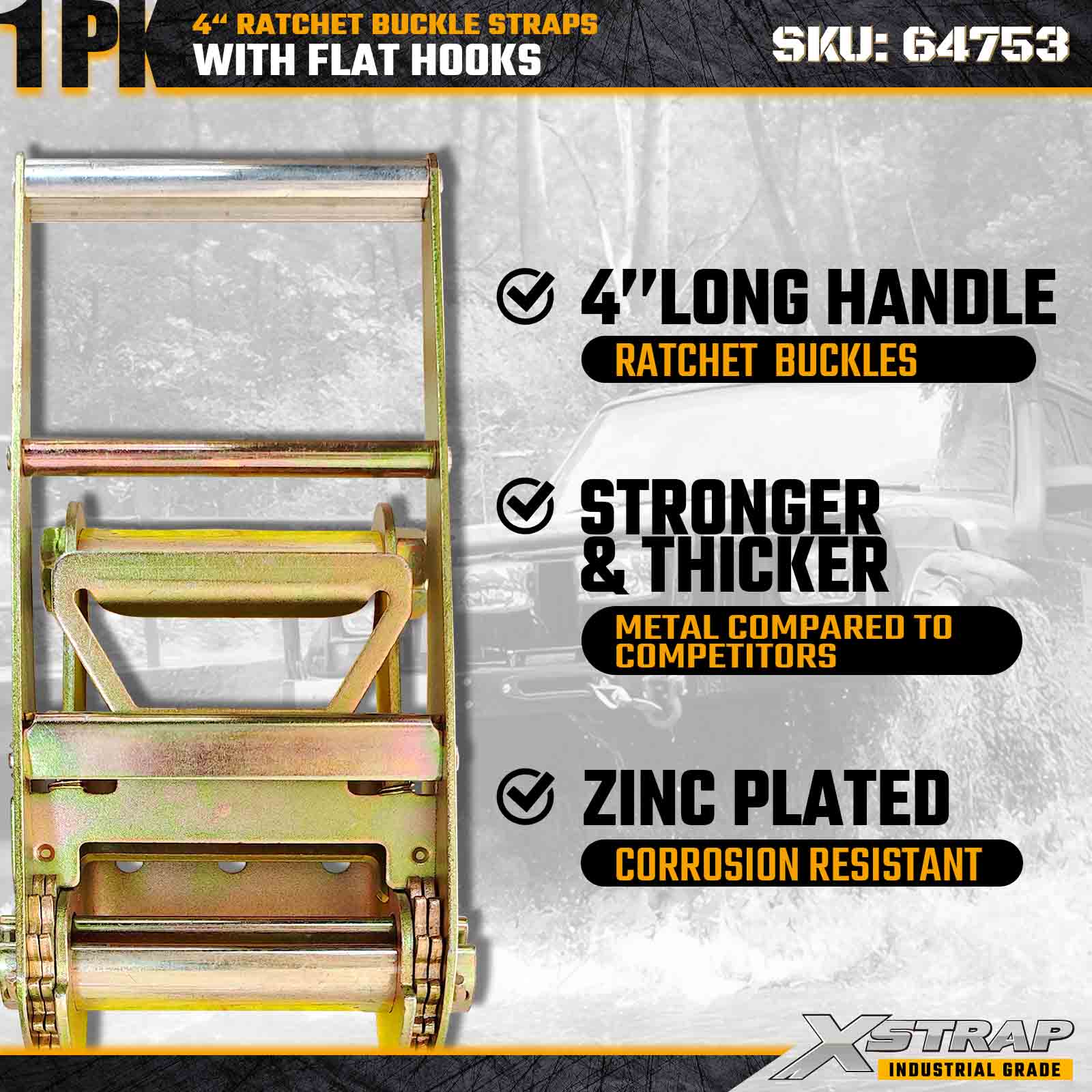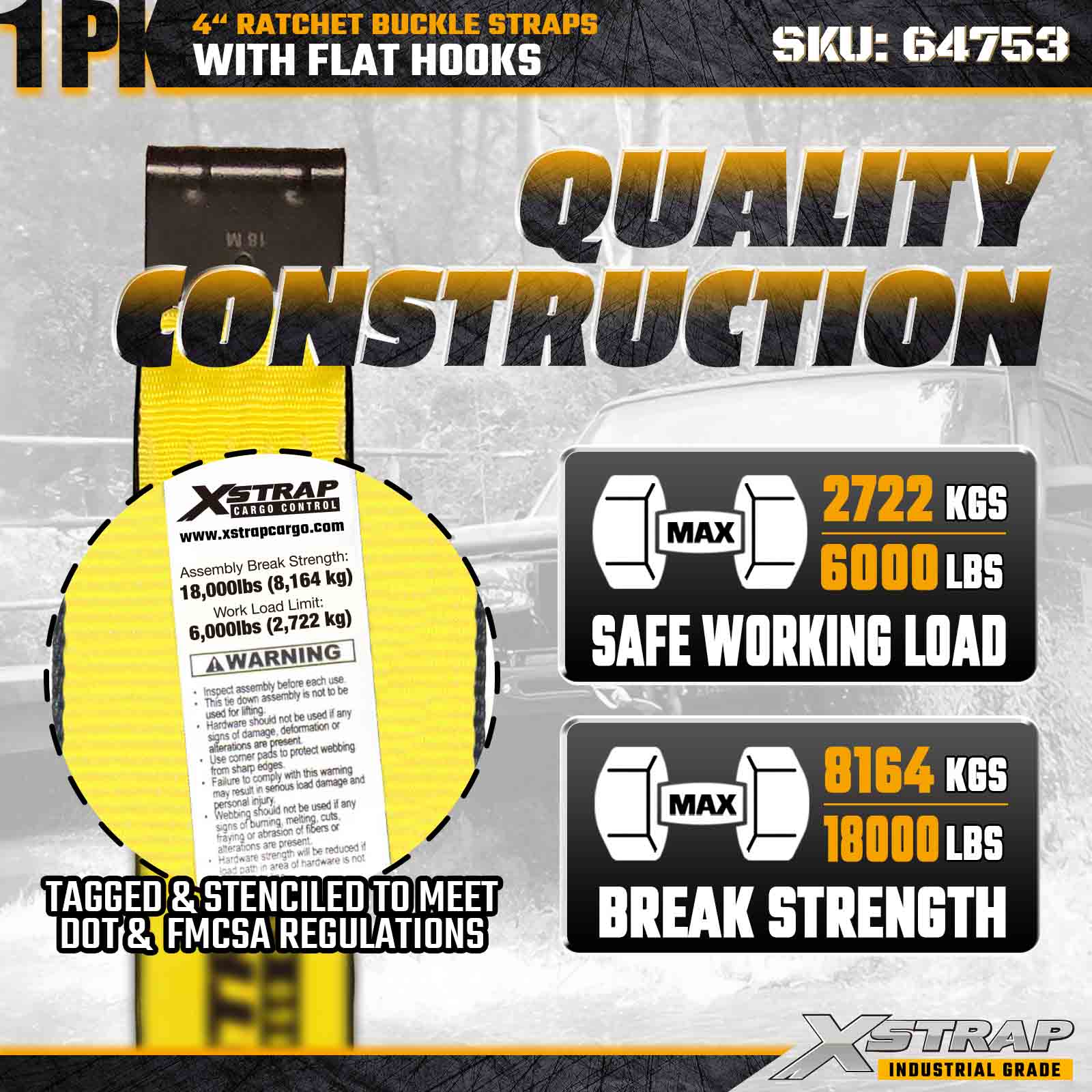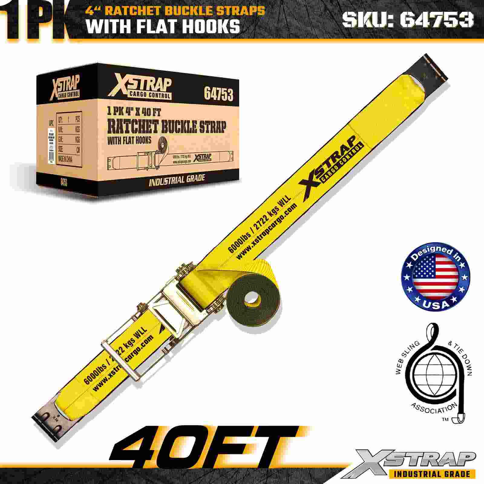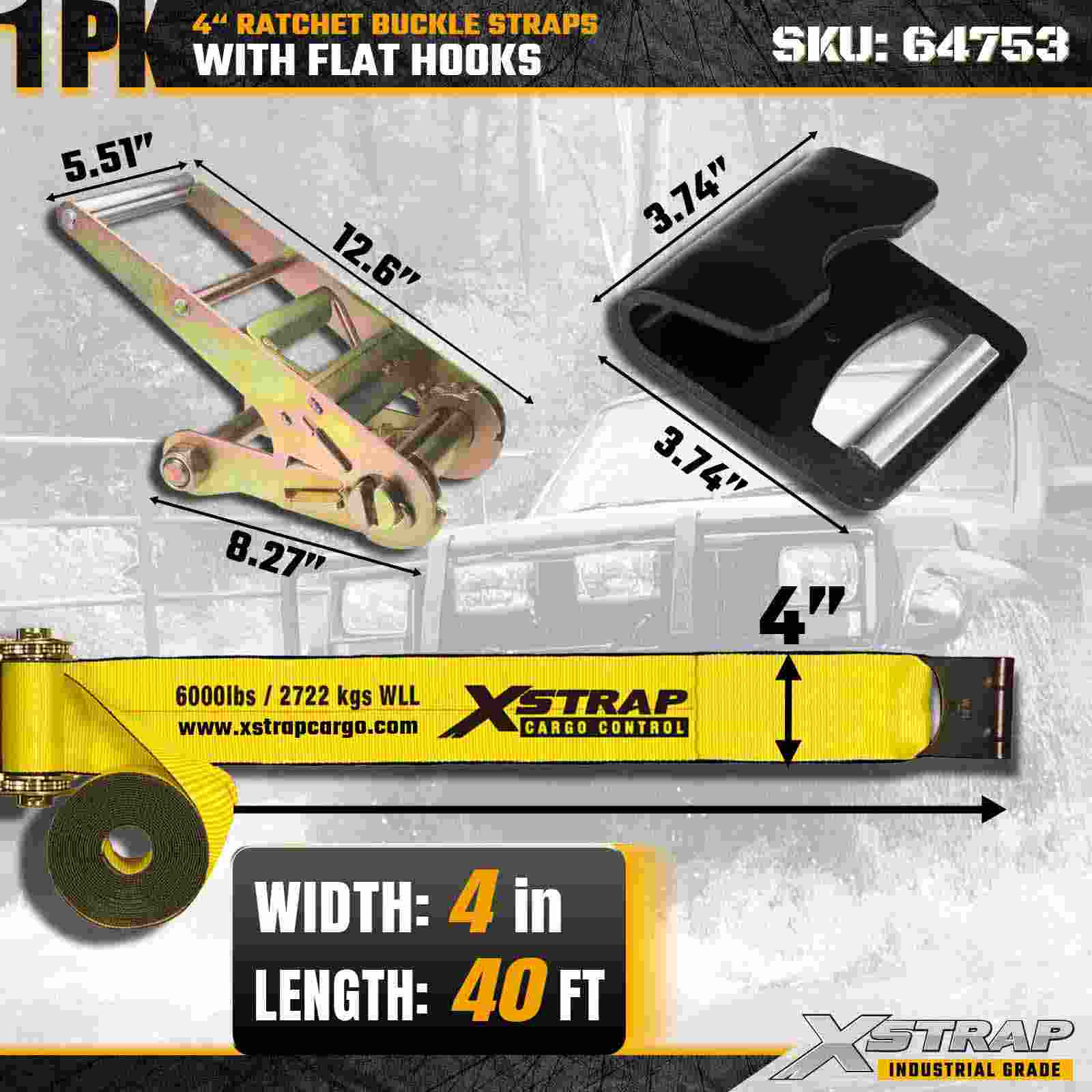 Xstrap 64753 4" × 40 fot skrallespennestropp (1-pakke) er designet for kraftig lastsikring, med forsterkede flate kroker og en slitesterk skrallemekanisme. Med en arbeidsbelastningsgrense på 6000 lbs og 18 000 lbs er denne ekstra sterke flate båndene ideelle for en ekstra lang, flate rem. overdimensjonerte laster, maskintransport og industrielle lastapplikasjoner.