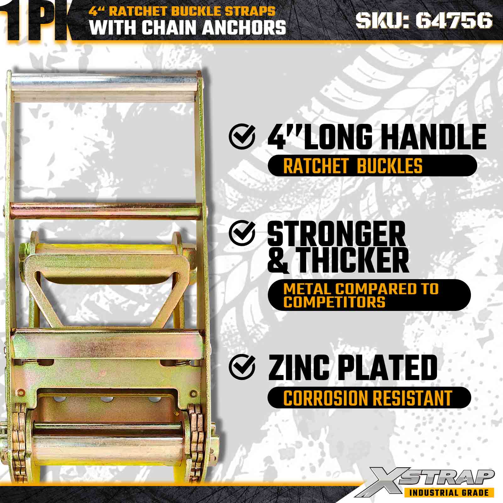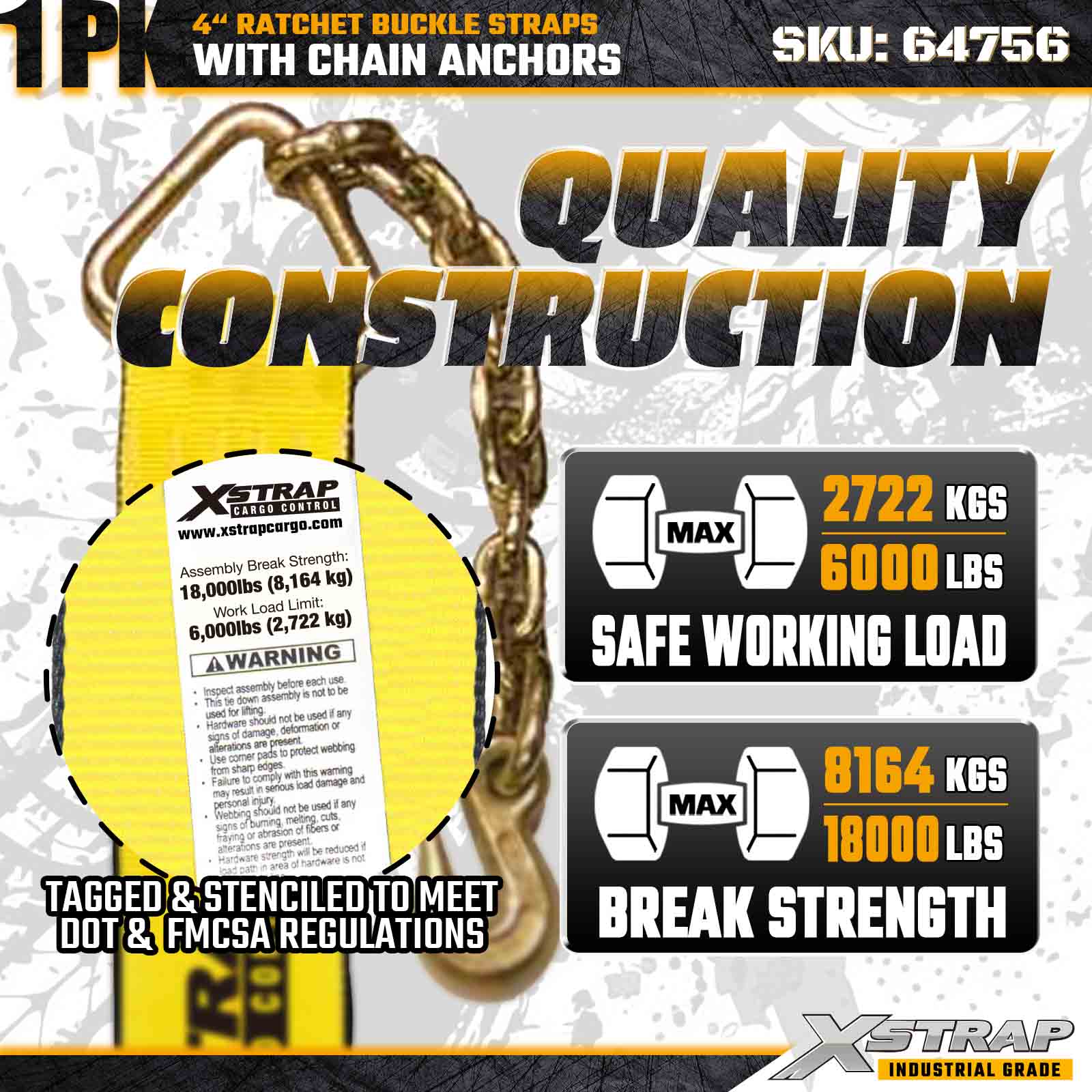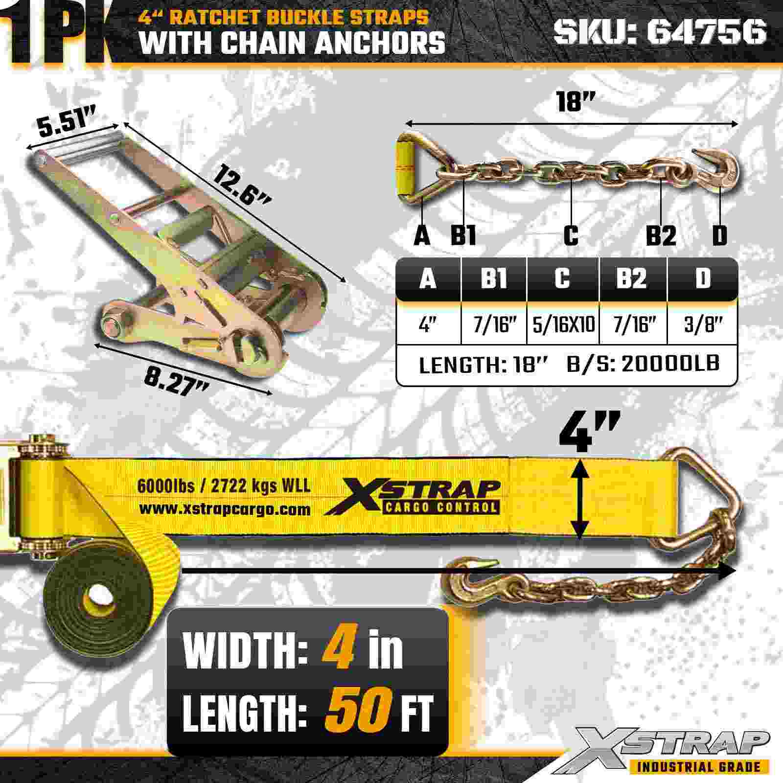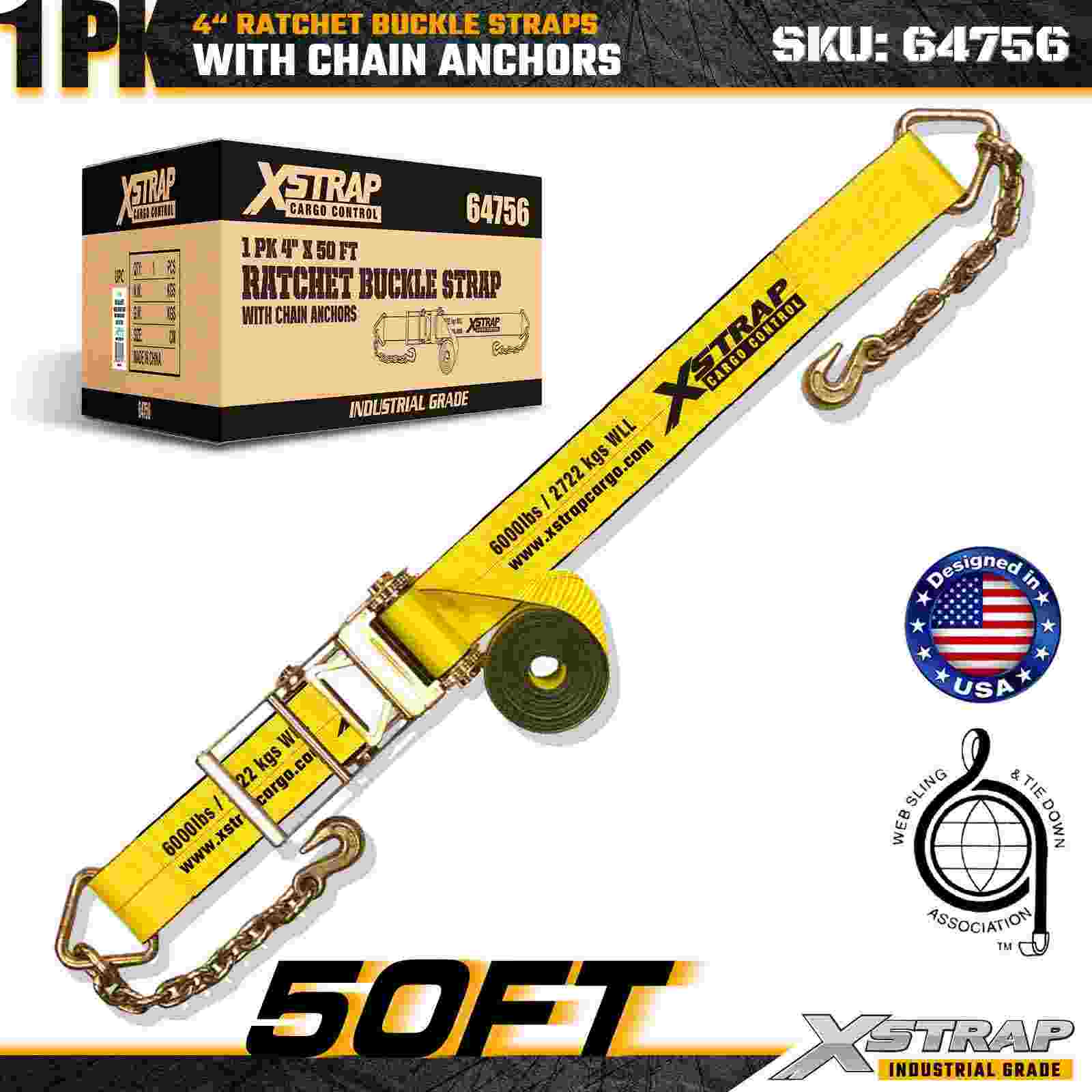 Xstrap 64756 4" × 50 fot skrallespennestropp med kjedeforankringer Bruddstyrke 18 000 lbs (1-pakke)