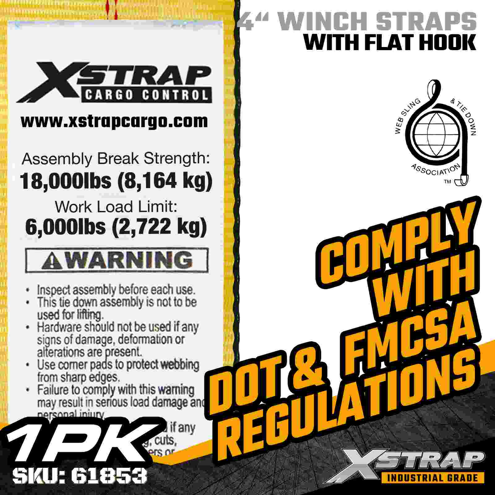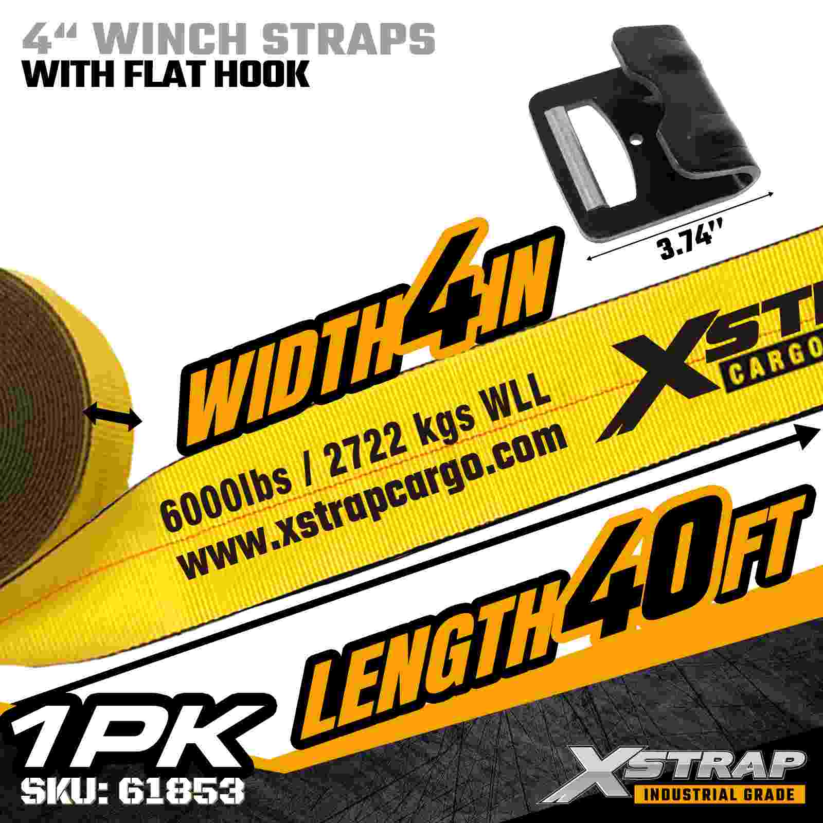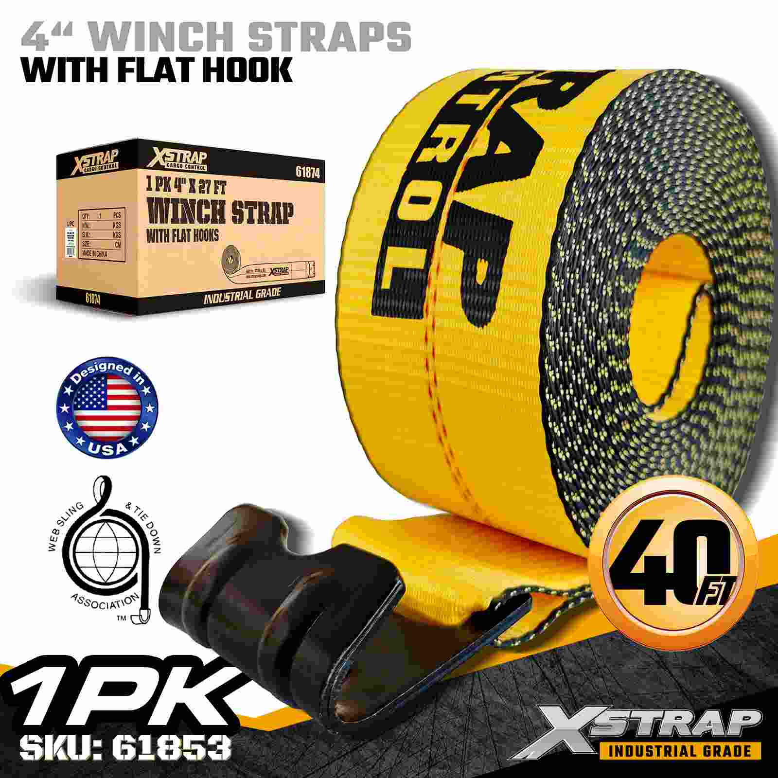 Xstrap 61853 4" × 40 fot standard vinsjstropp er en lastsikringsstropp med høy kapasitet og utvidet rekkevidde konstruert for planhengere og overdimensjonert industrifrakt. Med en forsterket flat krok og ekstra bred 4-tommers polyesterstroppen, leverer denne 4-tommers vinsjstroppen, Lo-limbit og Work000 6 bånd. 18 000 lbs Break Strength Den ekstra lange lengden på 40 fot gir eksepsjonell rekkevidde for å sikre brede, høye eller uregelmessig formet last som krever maksimal dekning og stabilitet.