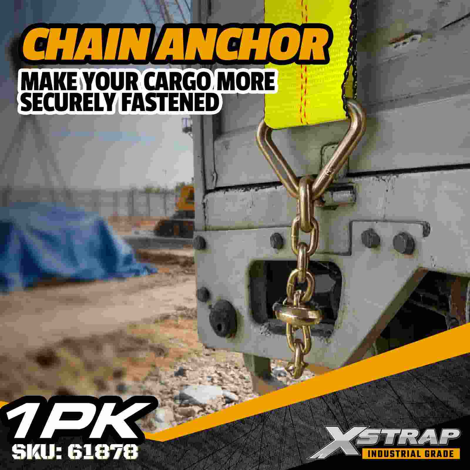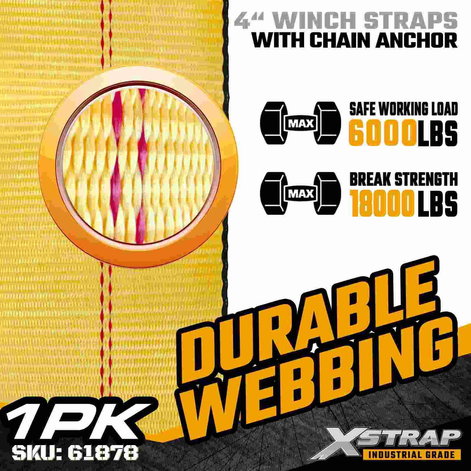 Xstrap 61878 4" × 27 fot Standard Winch Strap er en kraftig industriell lastsikringsstropp konstruert for planhengere og ekstreme belastningsforhold. Med et smidd kjedeanker og ultrabred 4-tommers polyesterbånd, gir denne 4-tommers vinsjstroppen 6000 lb,000 lbs og Breaking Styrke Kjedeankerdesignet gir uovertruffen grep og holdbarhet, noe som gjør den ideell for sikring av stål, maskineri og annen høyspent gods.