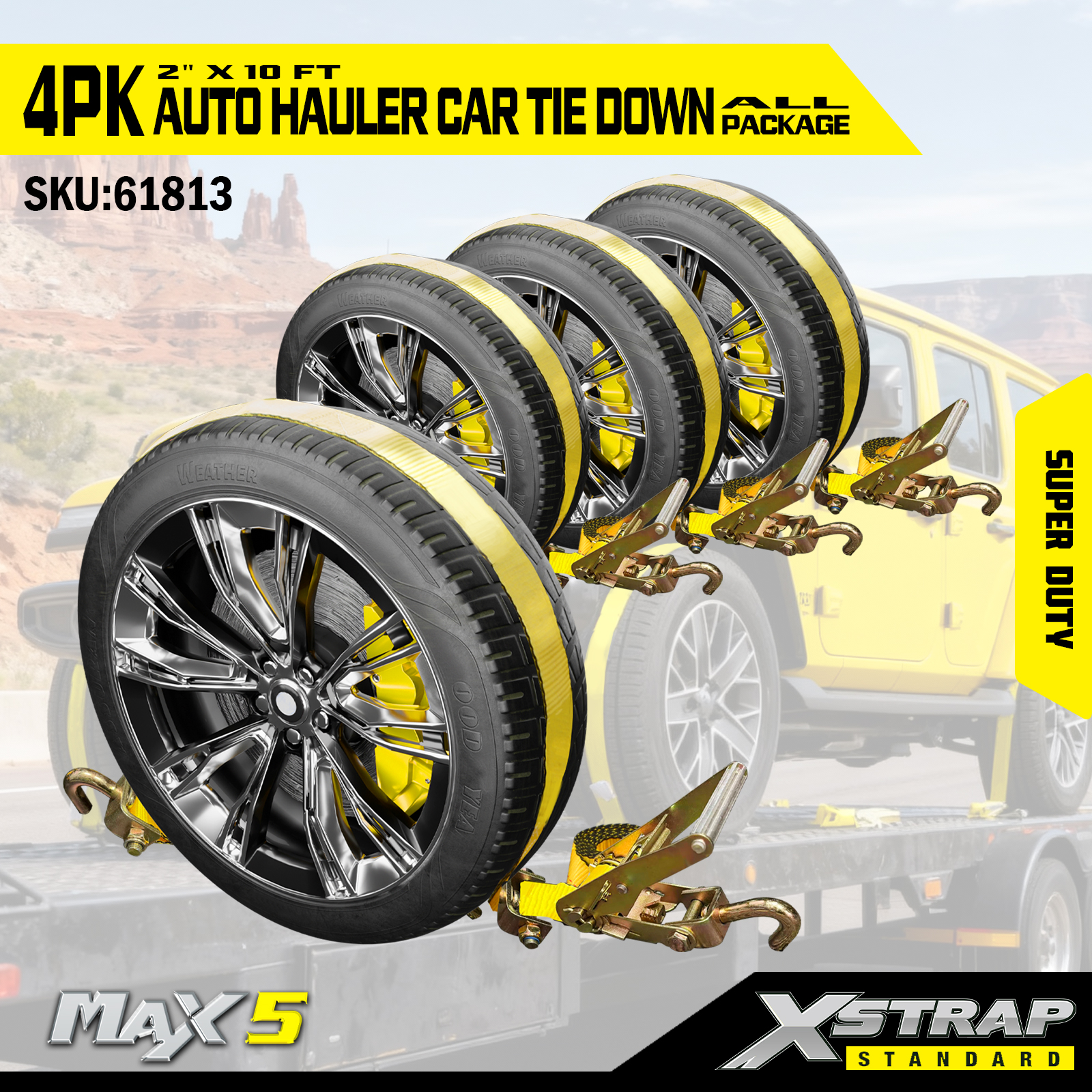 Xstrap Car Hauler Straps Heavy Duty 6600 lbs Break Strength - Tire Tie Down Straps for Trailers, Over the Wheel Tie Downs med gummiklosser for SUV, lastebil, ATV, UTV