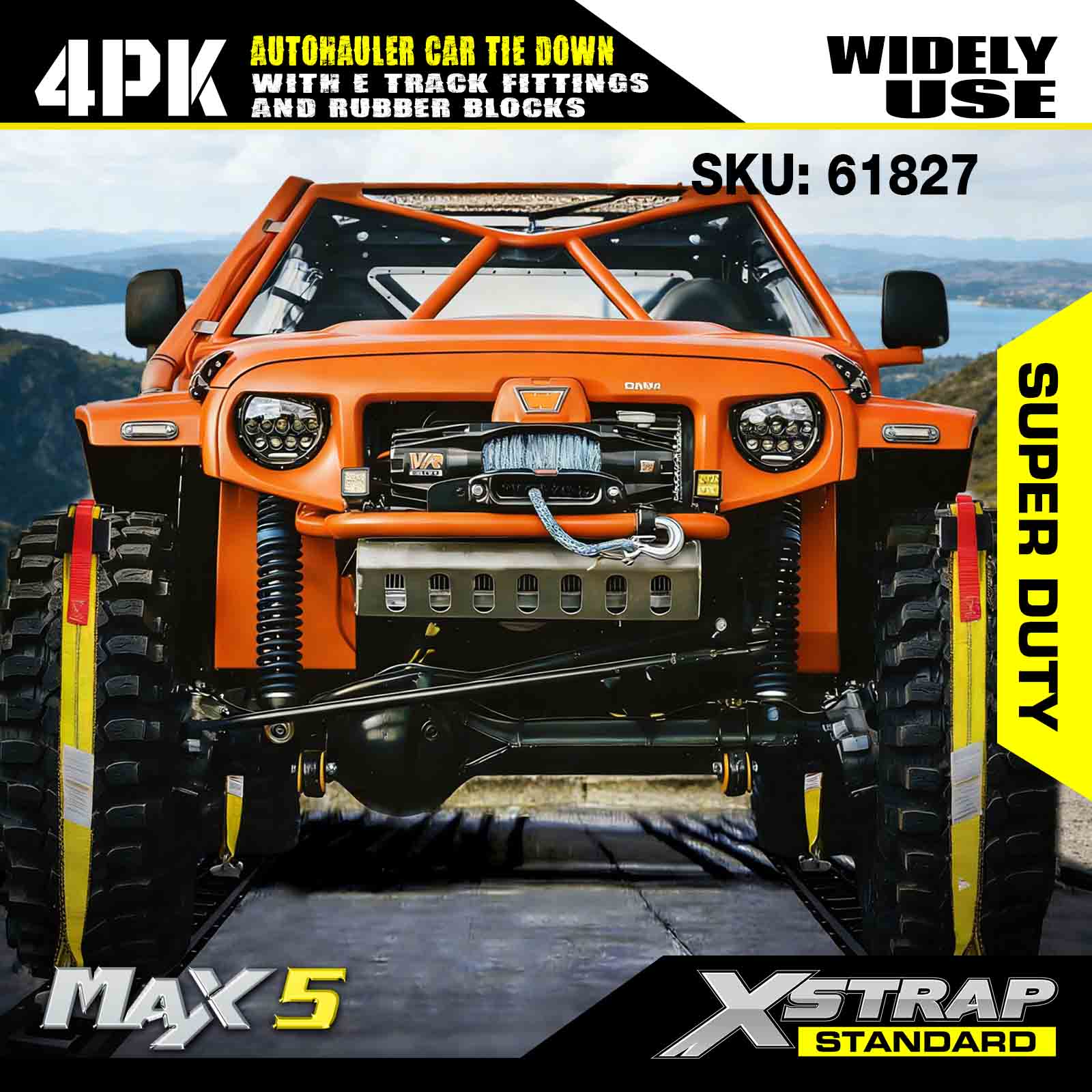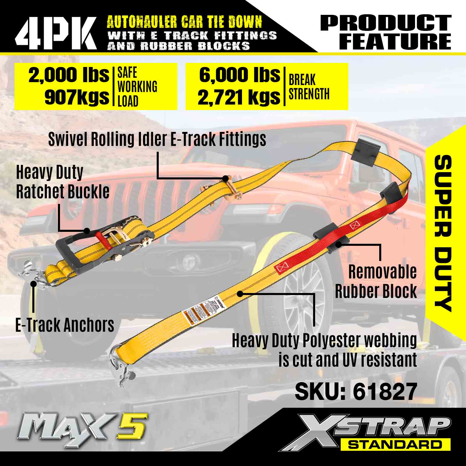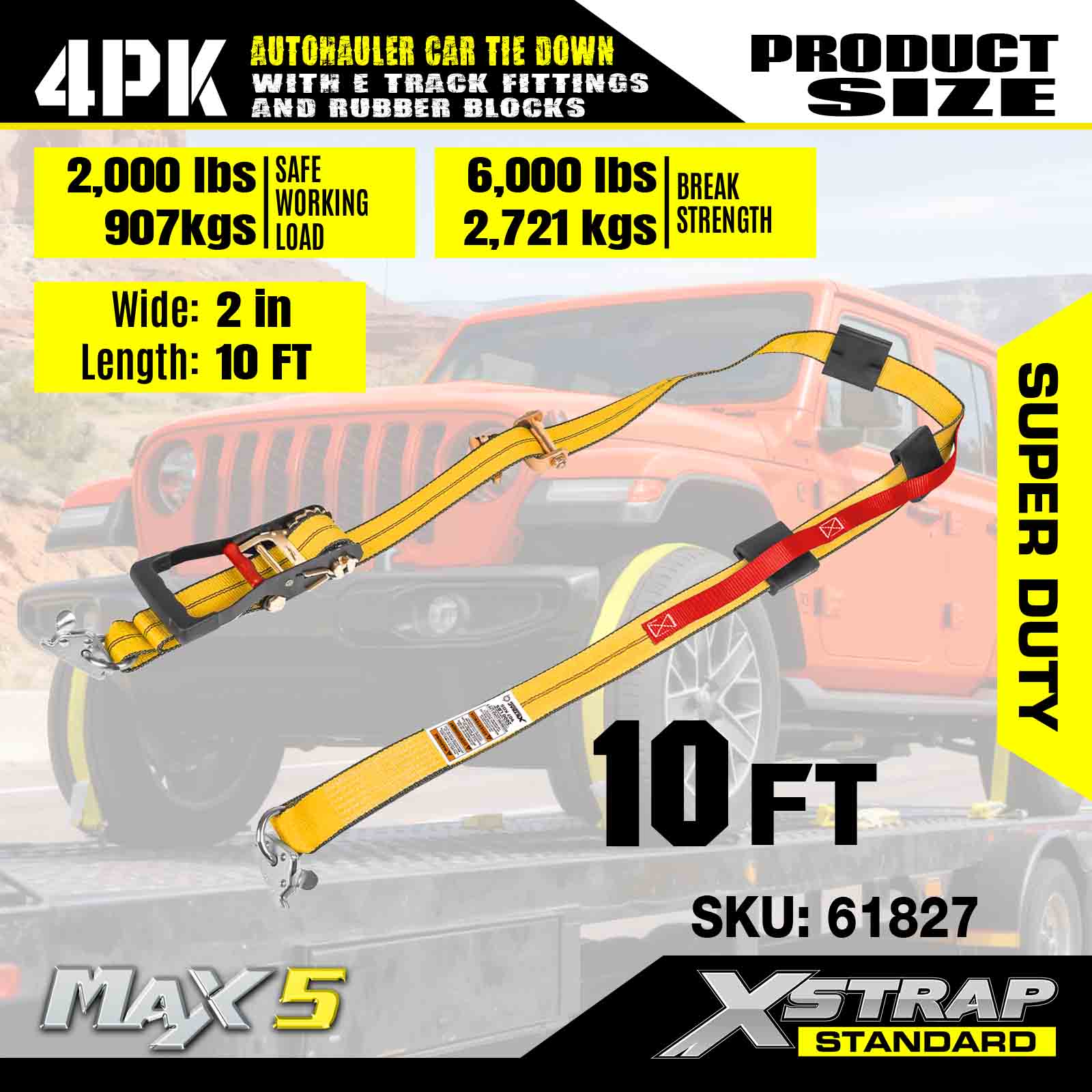 - Sikkerhet og allsidighet: Med en grense på 2000 lbs arbeidsbelastning og 6000 lbs bruddstyrke, gir disse stroppene pålitelig sikkerhet for terrengkjøretøyer, lastebiler, ATV-er og UTV-er - ideelle for robuste transportbehov.
