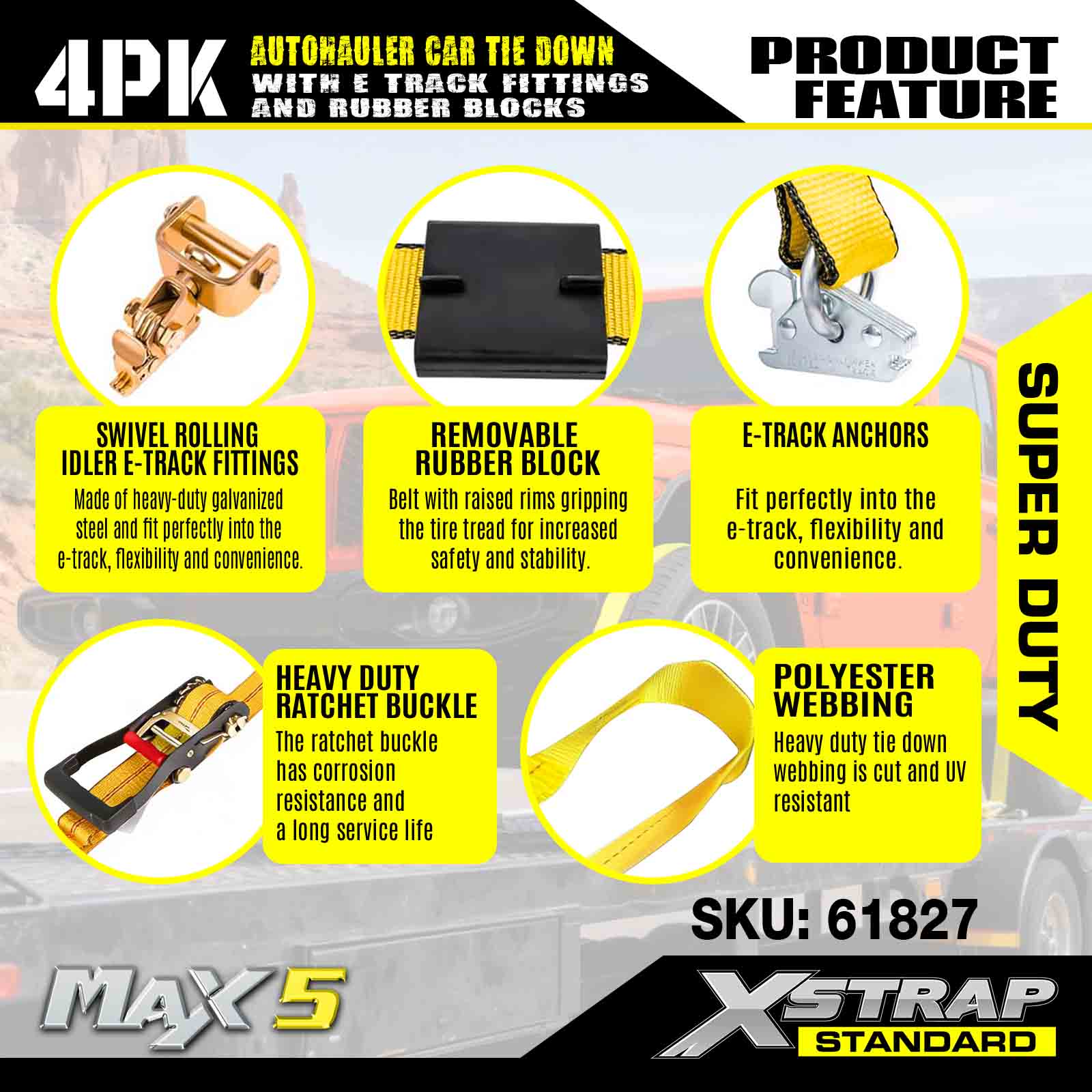 - Kraftig maskinvare: Har korrosjonsbestandige skrallespenner og solide E-sporankere, som sikrer sikker, langvarig feste for alle dine tunge biltransportkrav