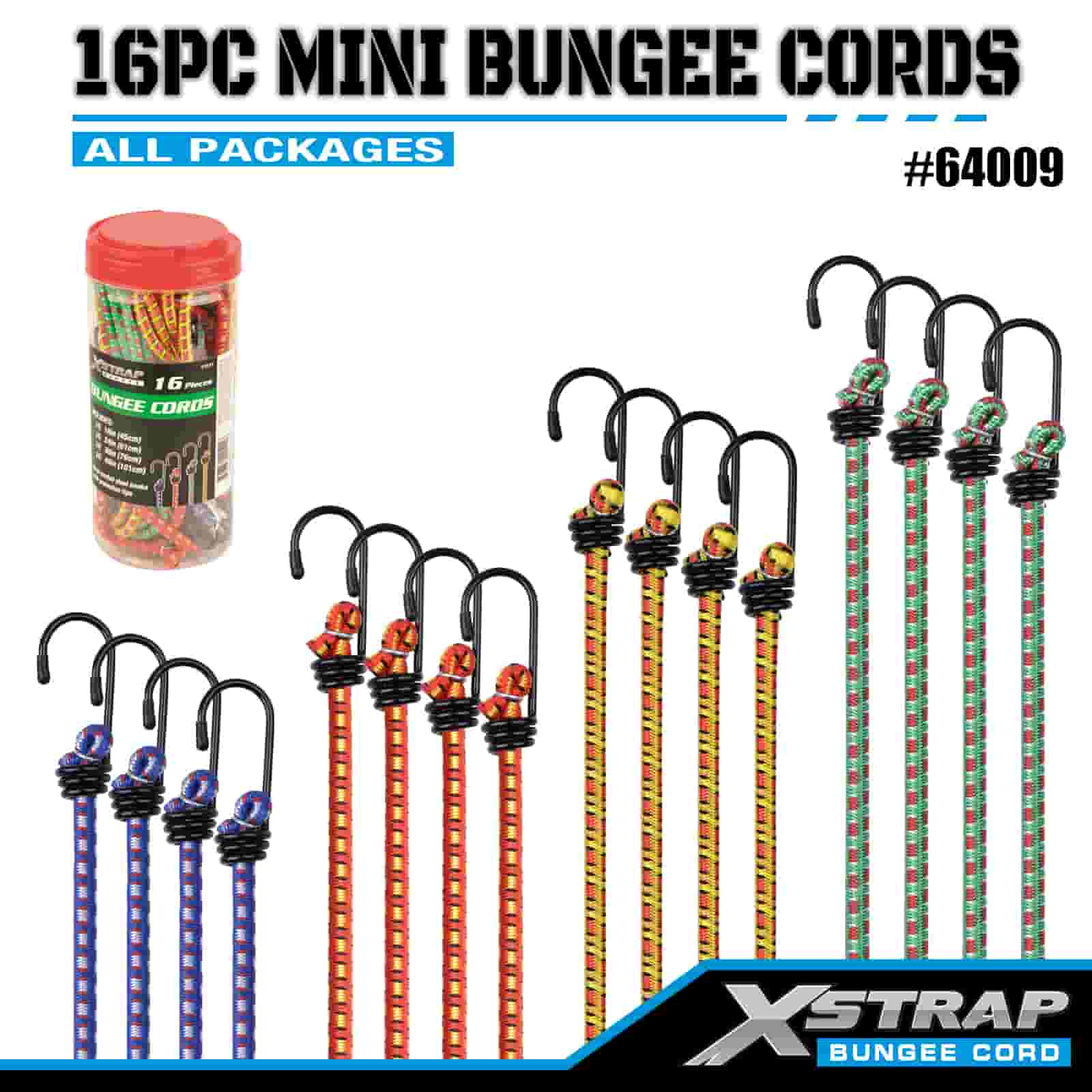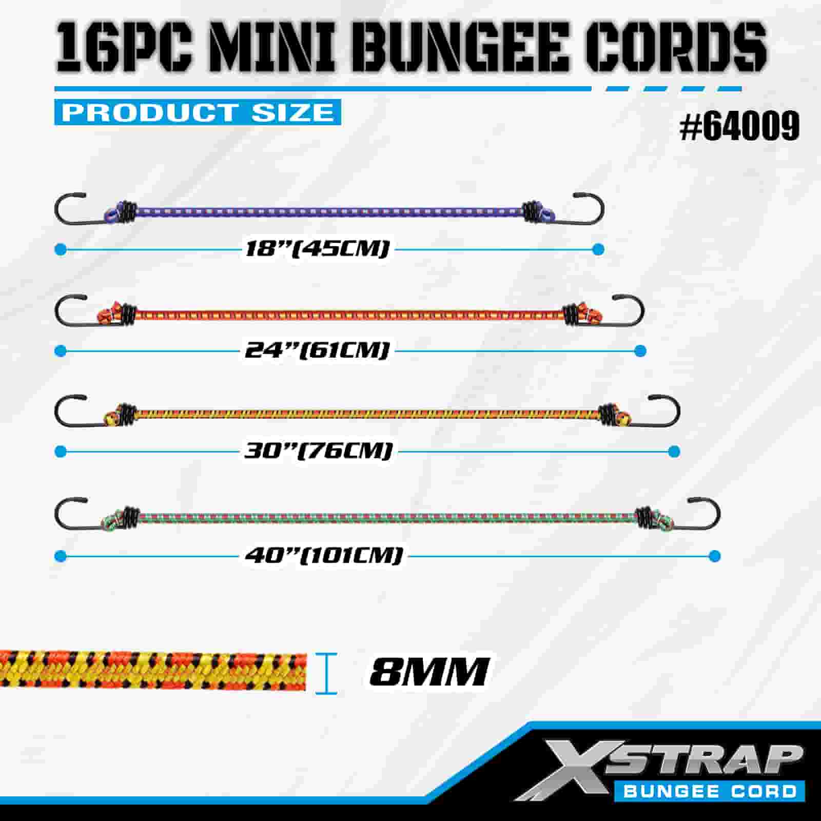 Xstrap 16PK Bungee Cords 8 mm x 18”/24” /30”/ 40”, 44-55 lbs bruddstyrke med stålkroker med beskyttende tips og standard fjærkroker.
