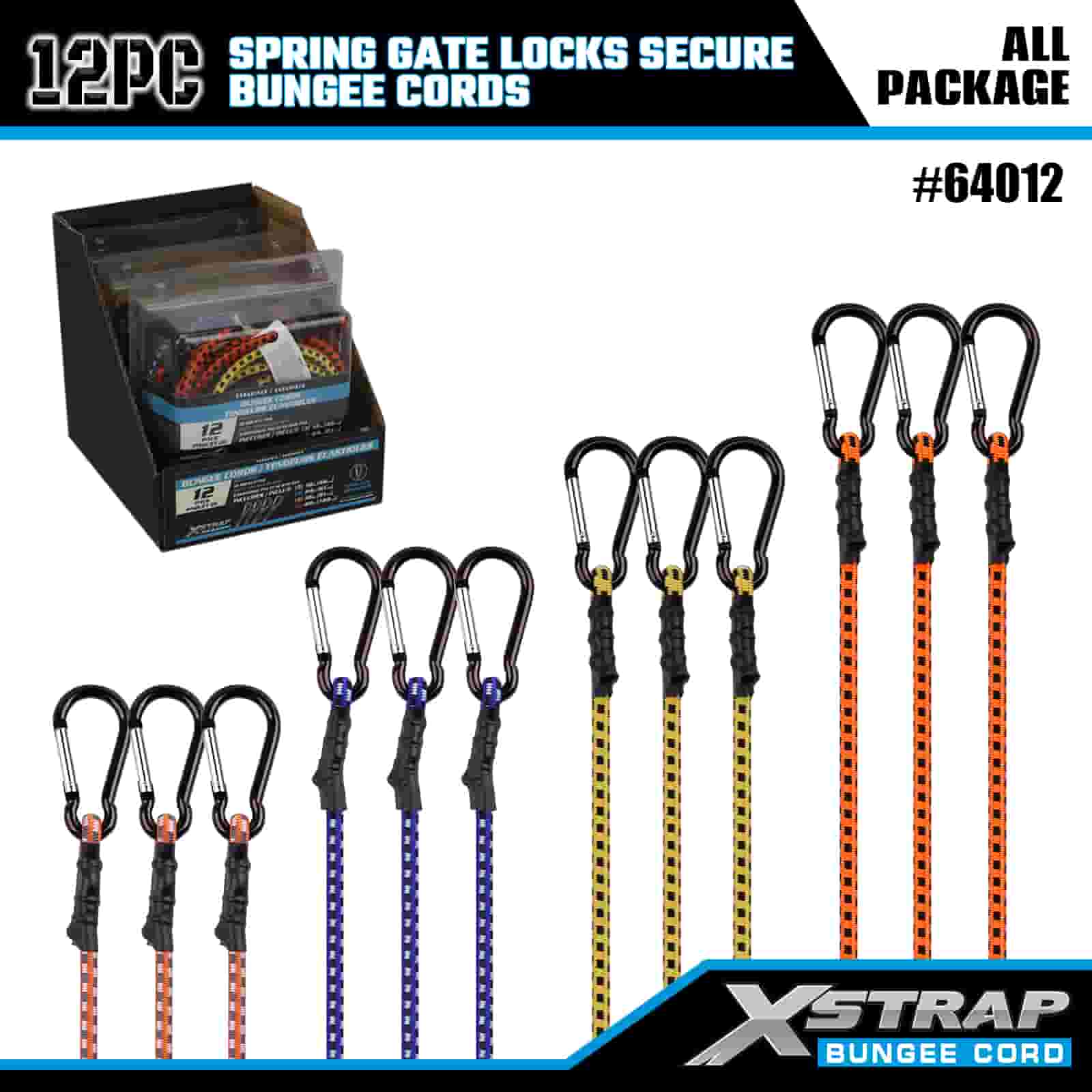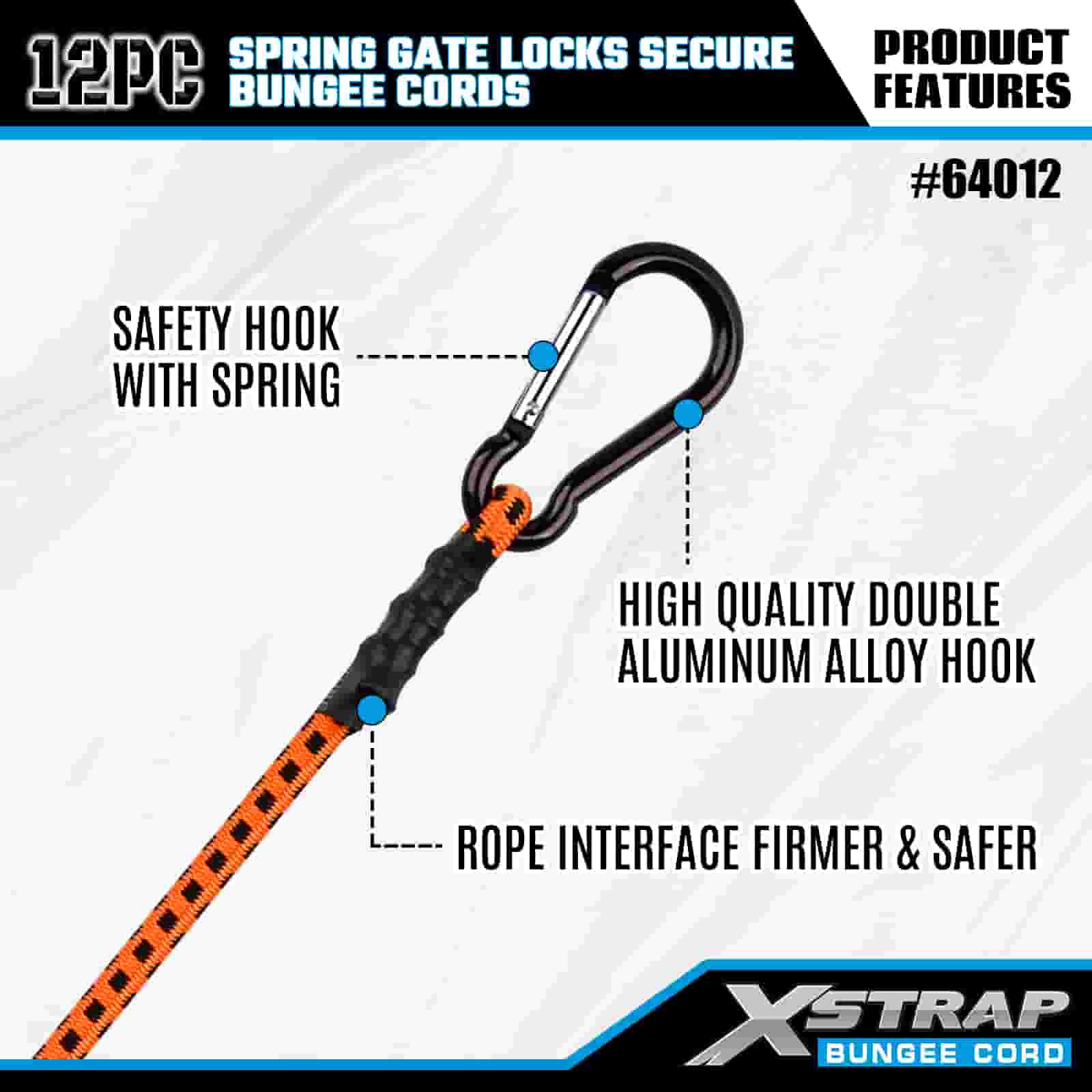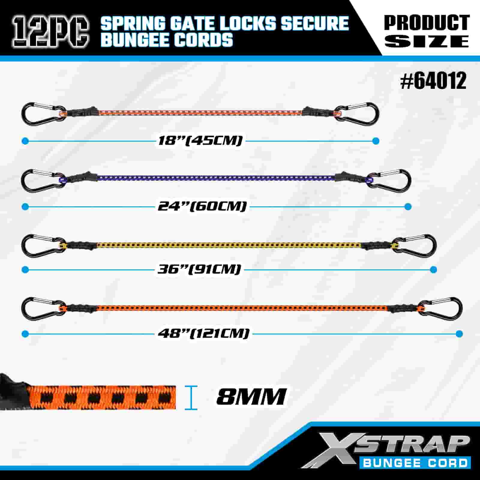 Xstrap 12PK Spring Gate Locks Secure Bungee Cords 8mm x 18"/24" /36"/ 48", 88-110 lbs bruddstyrke med karabinkroker med fjærportlås sikret.