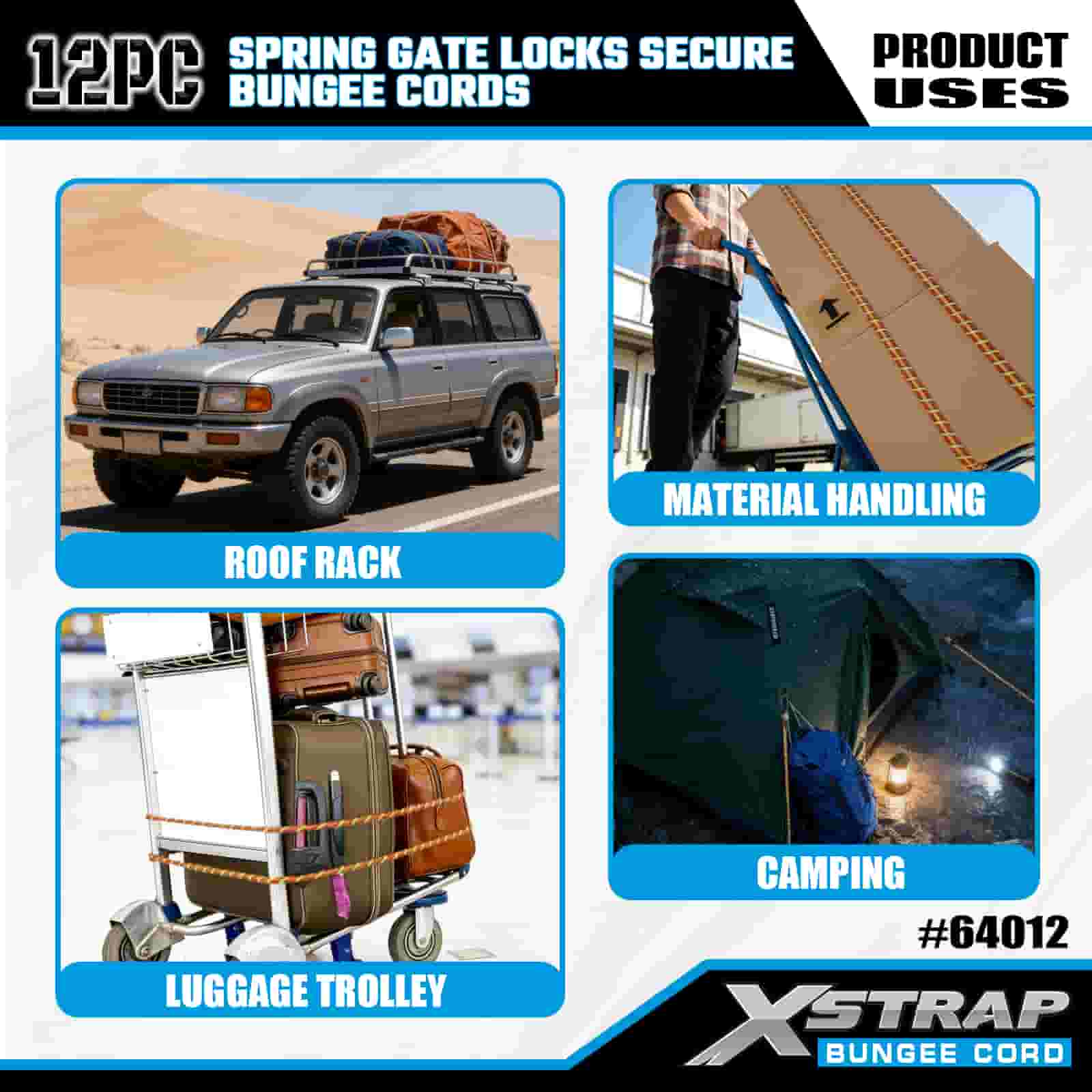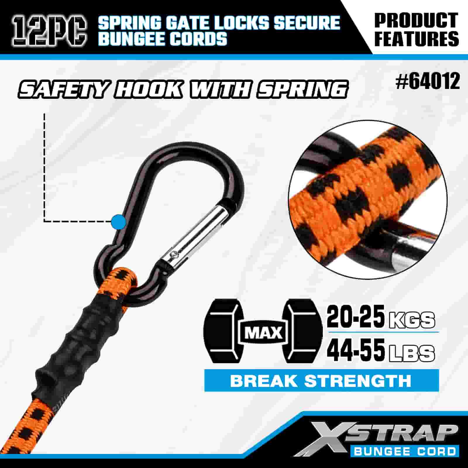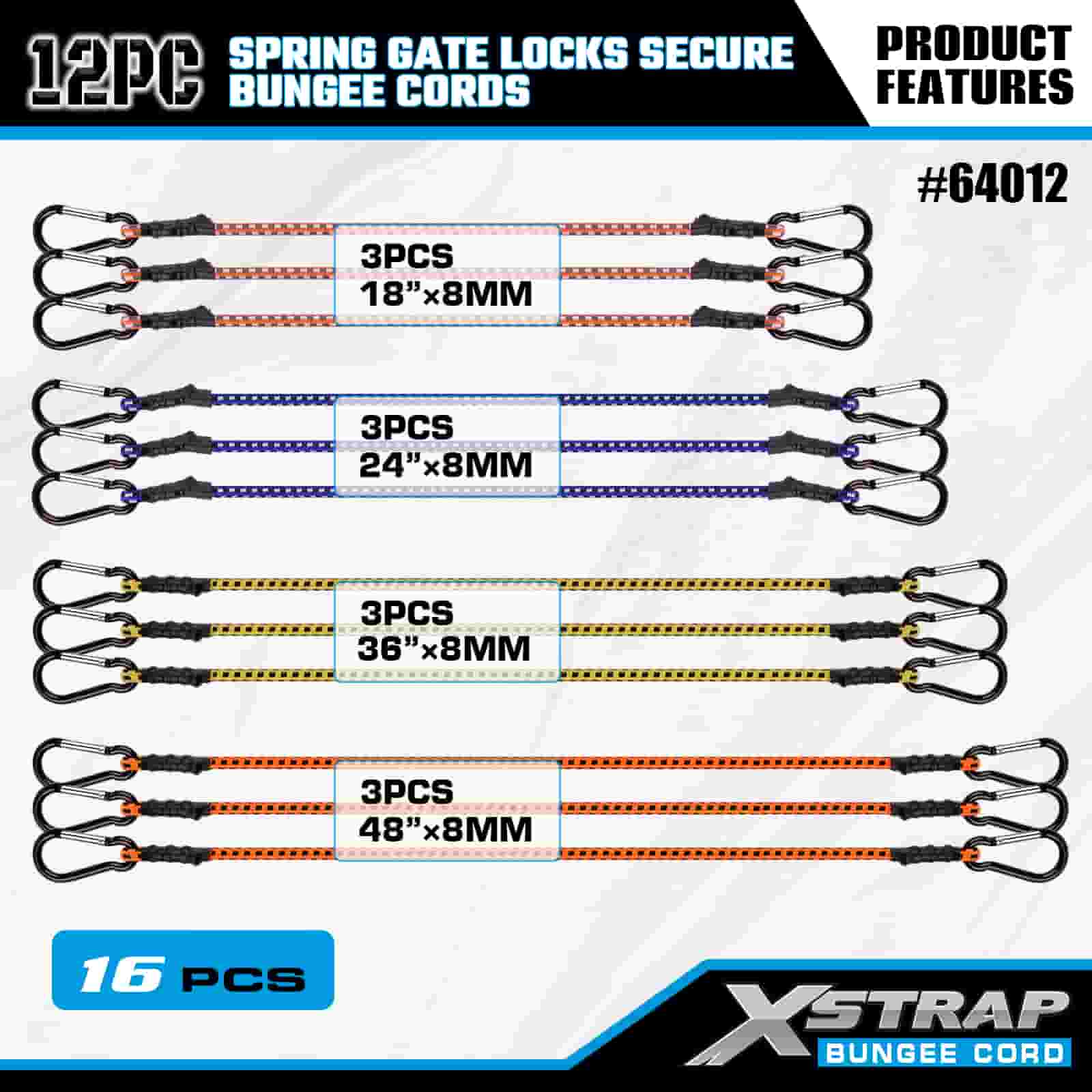 Xstrap 12PK Spring Gate Locks Secure Bungee Cords 8mm x 18"/24" /36"/ 48", 88-110 lbs bruddstyrke med karabinkroker med fjærportlås sikret.