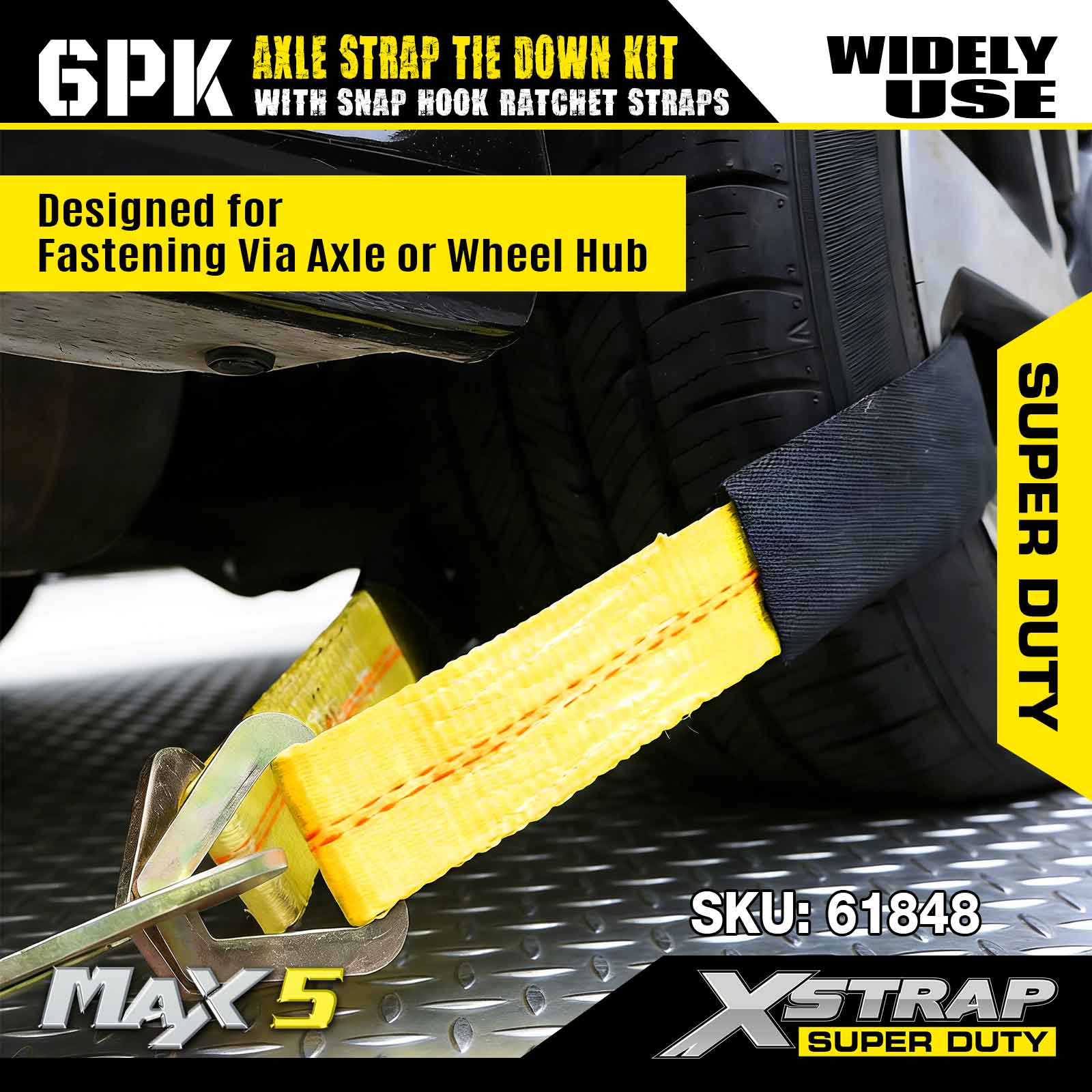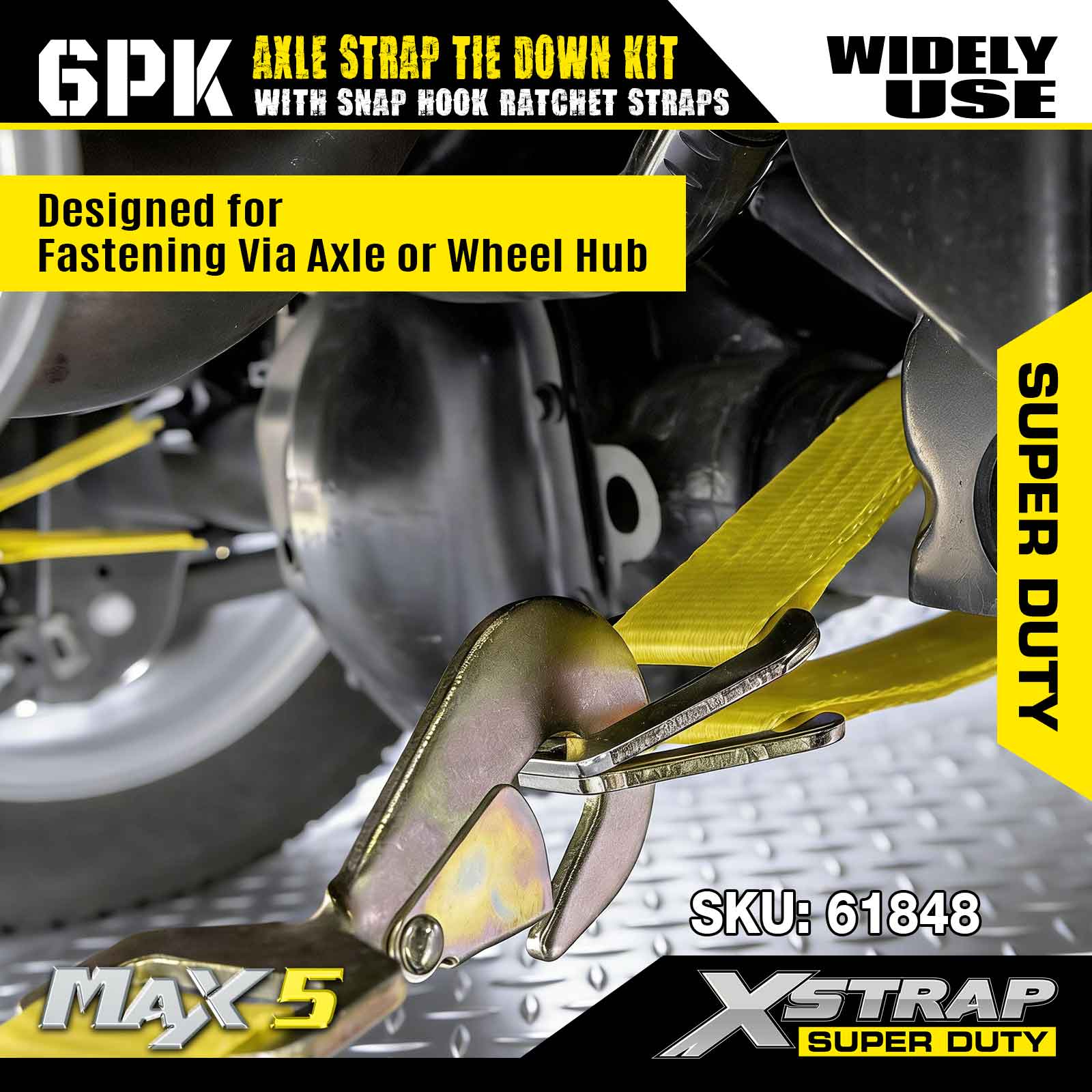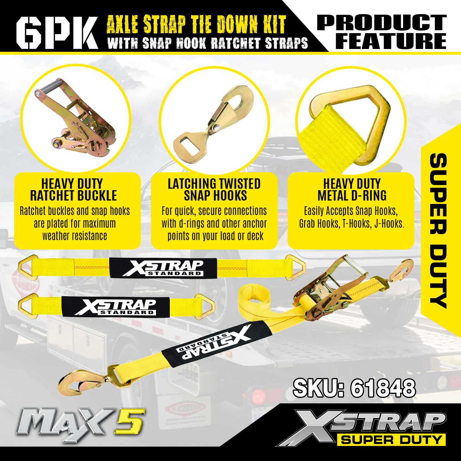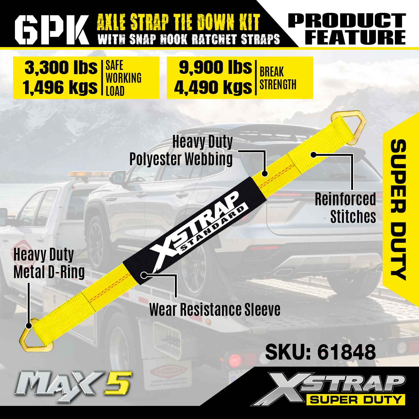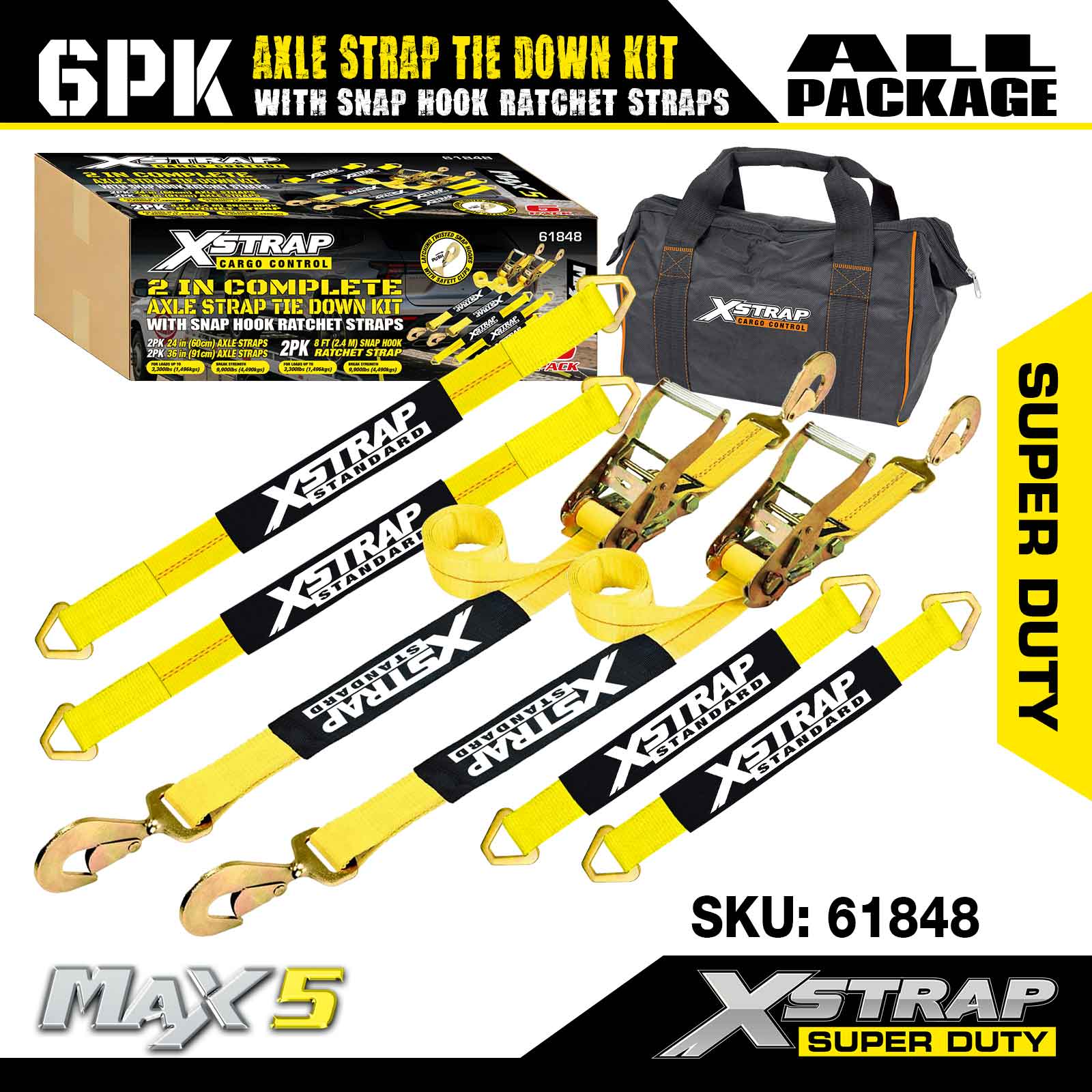 Xstrap 6PK akselremfestesett (med skrallestropper med snapkrok) – Super Duty. Den har en sikker arbeidsbelastning på 3 300 LBS (1 496 KGs) og en bruddstyrke på 9 900 LBS (4 490 KGs).
