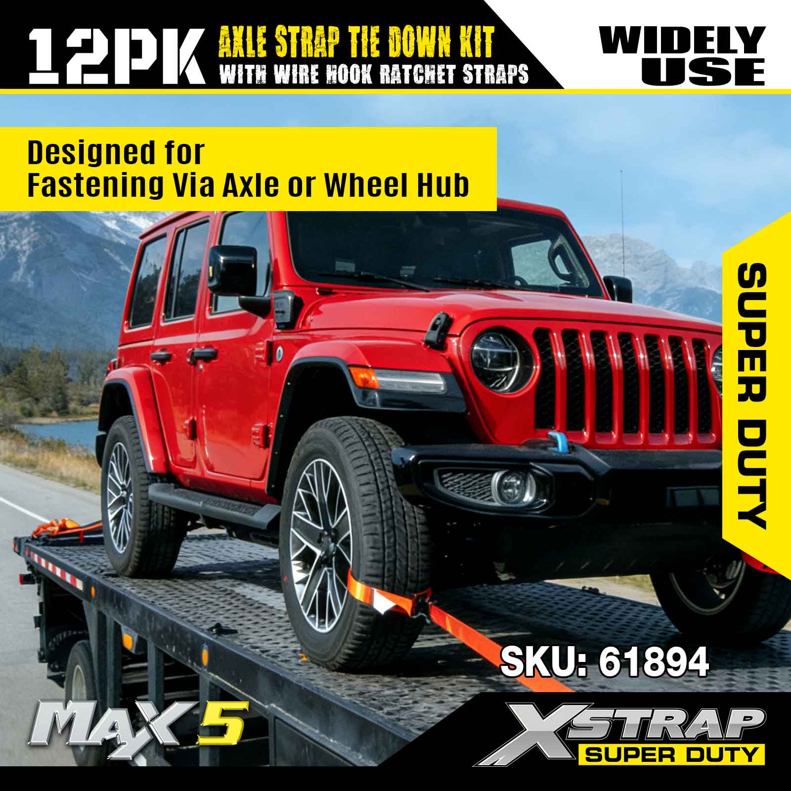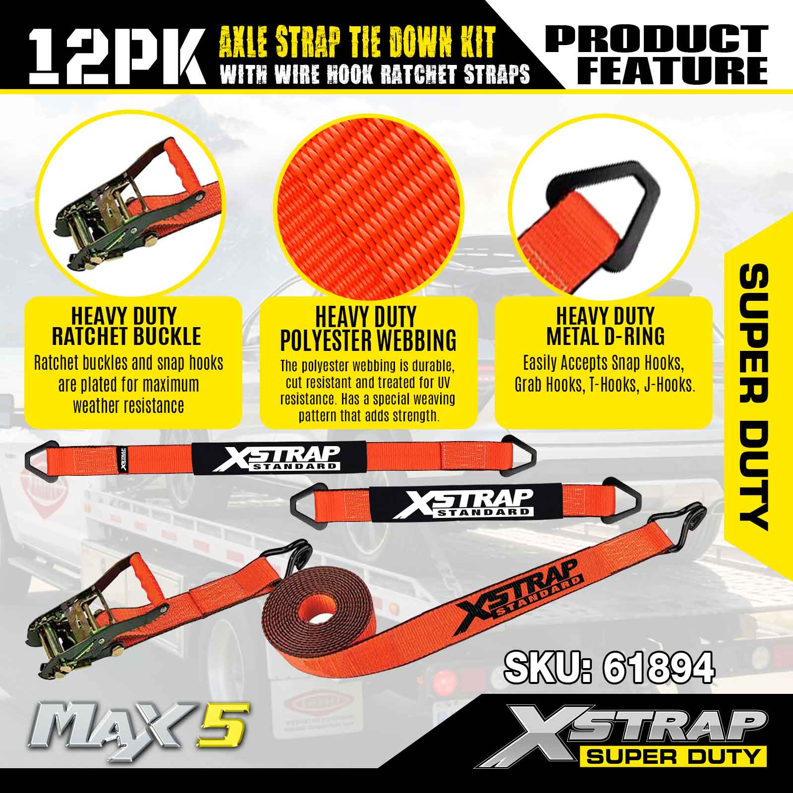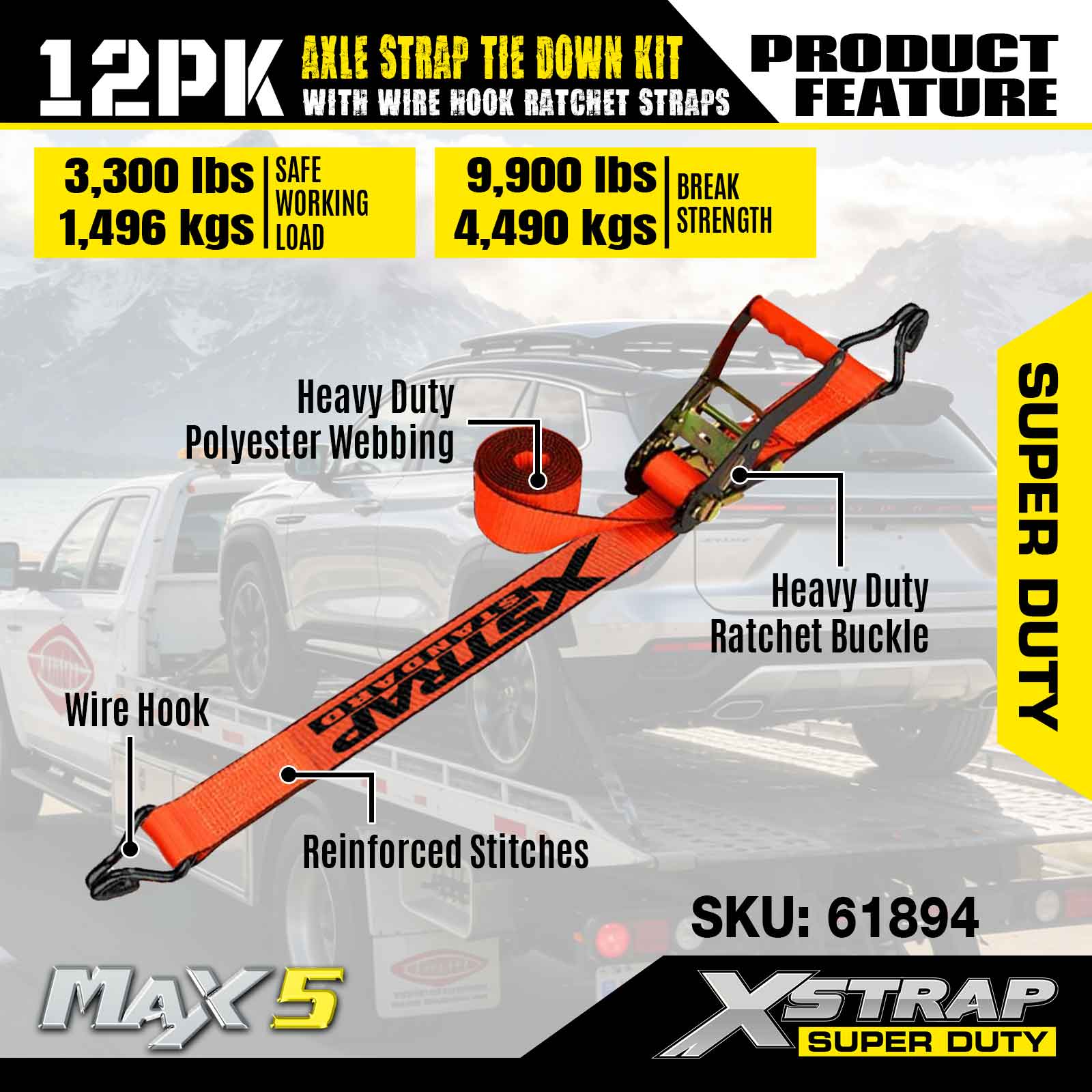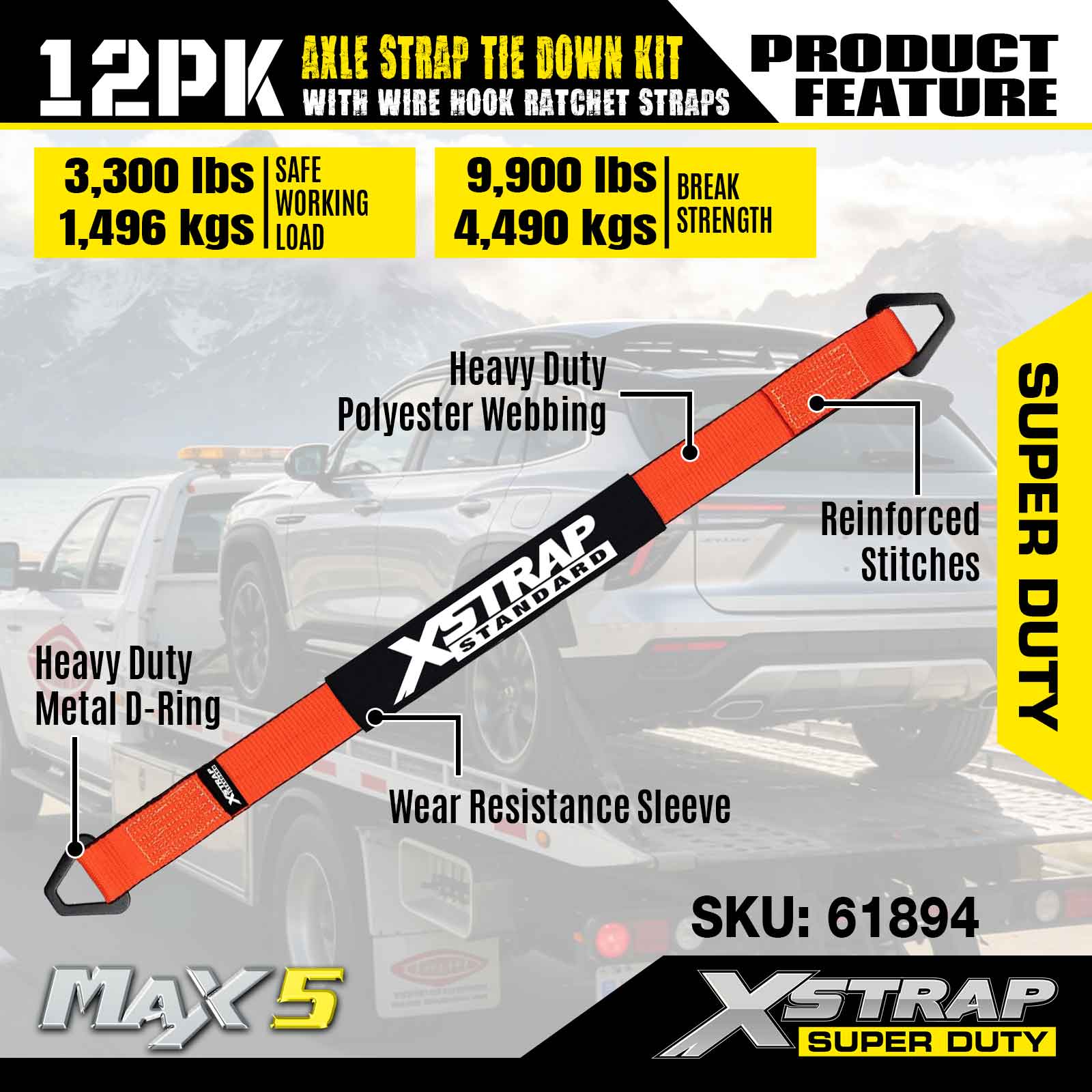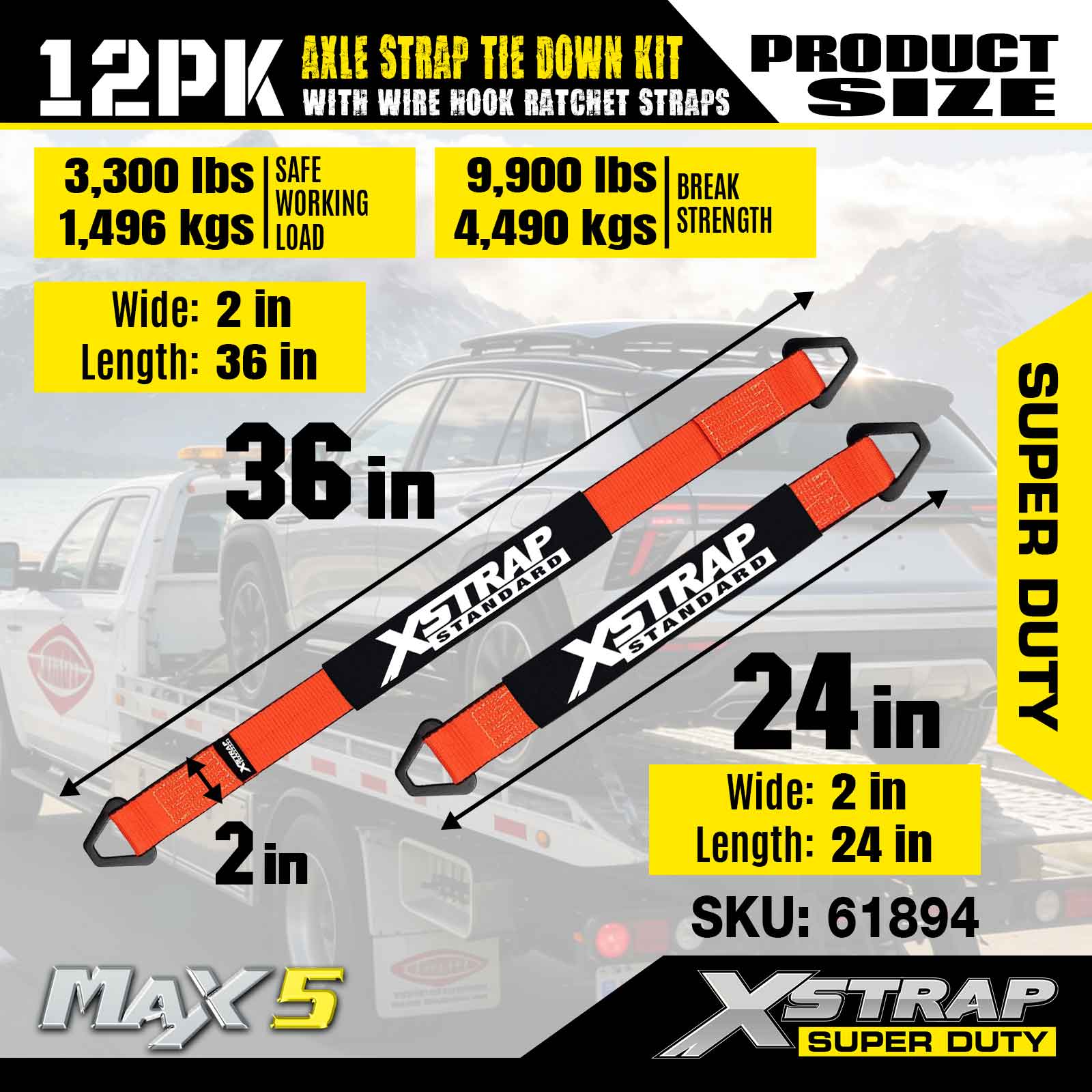 Xstrap 12PK akselremfestesett (med skrallestropper for trådkrok) – Super Duty. Den har en sikker arbeidsbelastning på 3 300 LBS (1 496 KGs) og en bruddstyrke på 9 900 LBS (4 490 KGs).