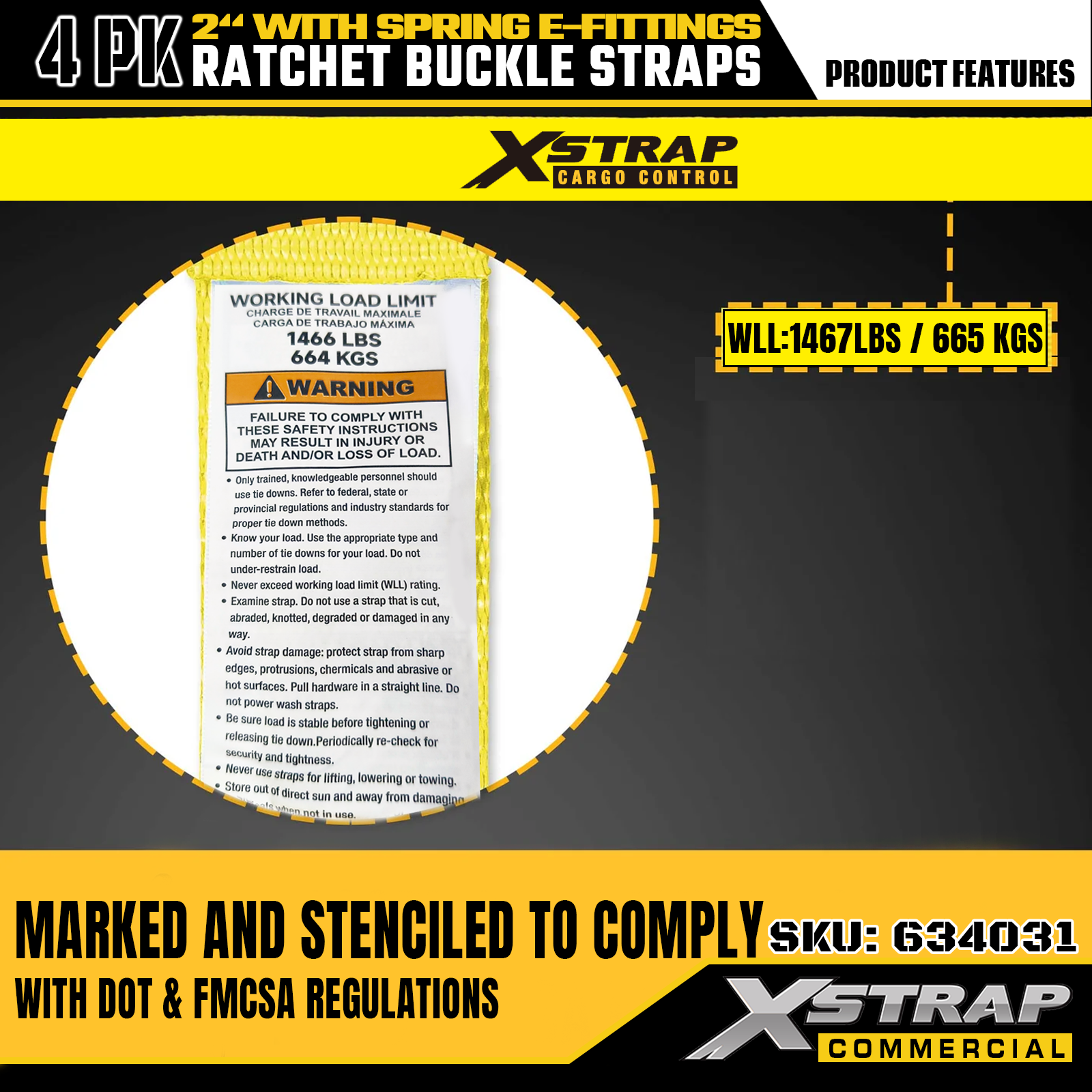 - Tydelig sikkerhetsmerking og praktisk 4-pakning: Hver stropp er tydelig merket med sikker arbeidsbelastning (SWL) på 1467 lbs og maksimal bruddstyrke på 4401 lbs, noe som gir viktig sikkerhetsinformasjon for riktig bruk. Kommer i en konfigurasjon med 4 pakker, som perfekt oppfyller behovene til batchbruk i ulike lastkontroll- og flyttescenarier.