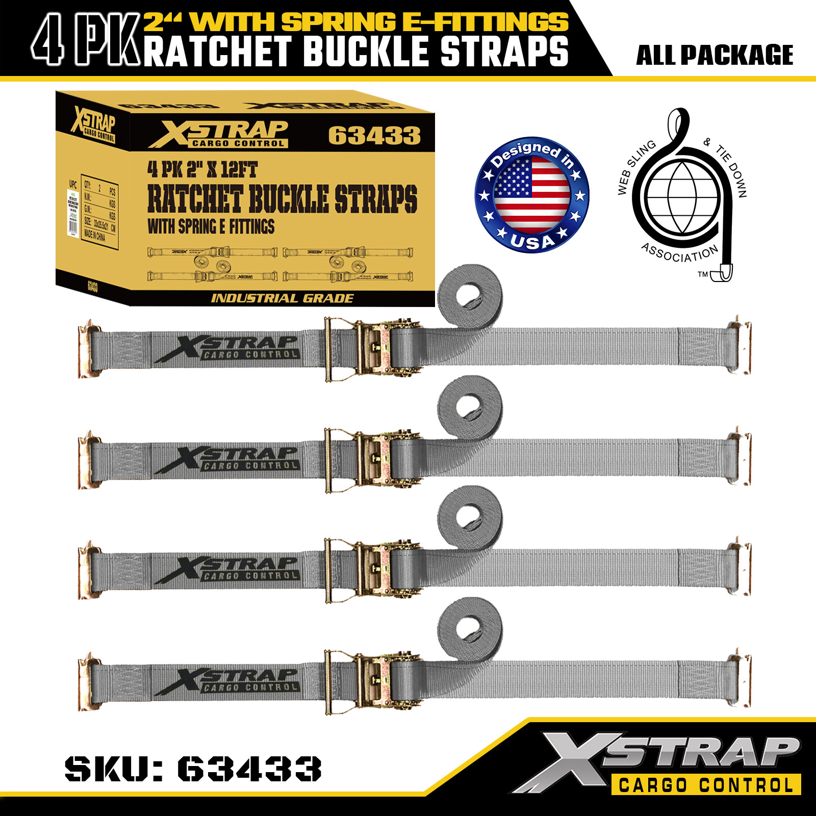 Xstrap 4-pakke skrallefestestropper, 2" x 16" polyester lastesikringsstropper, 1467 lbs sikker arbeidsbelastning og 4401 lbs bruddstyrke, med metall E-kroker for lastebil, klipper, ATV-er2. Produktspesifikasjon: