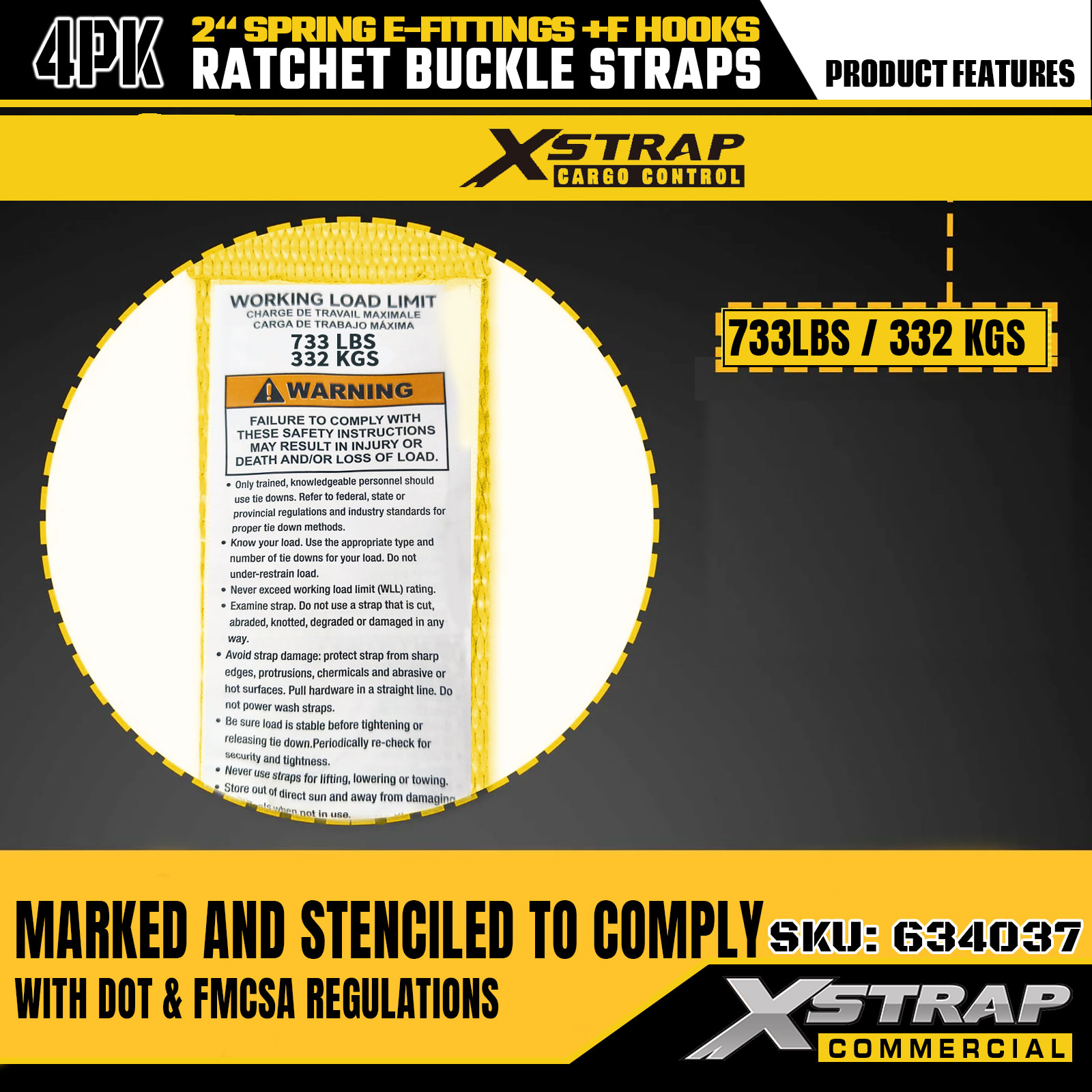 - Tydelige lastekapasitetsmerker: Hver stropp er tydelig merket med en 733 lbs sikker arbeidsbelastning (SWL) og 2199 lbs bruddstyrke, noe som gir kritiske sikkerhetsretningslinjer for å sikre riktig og sikker lastkontroll.