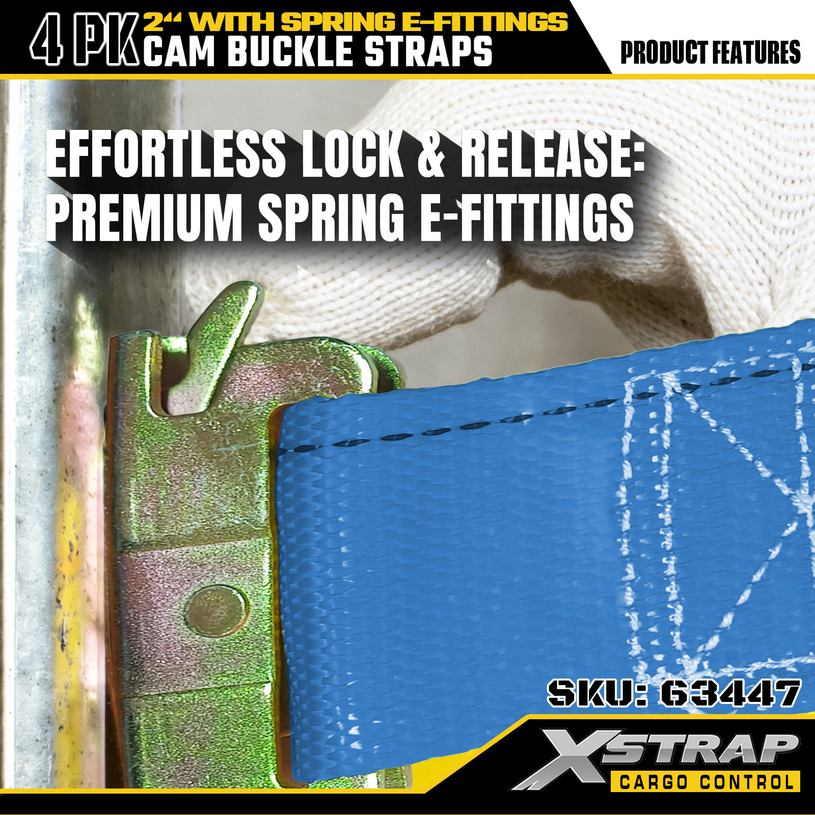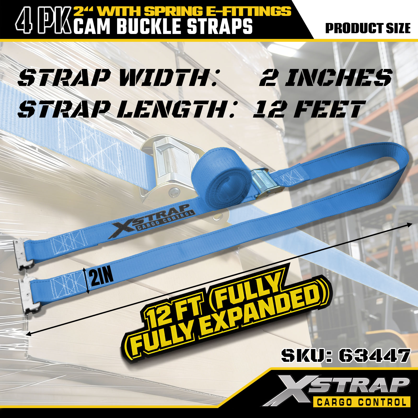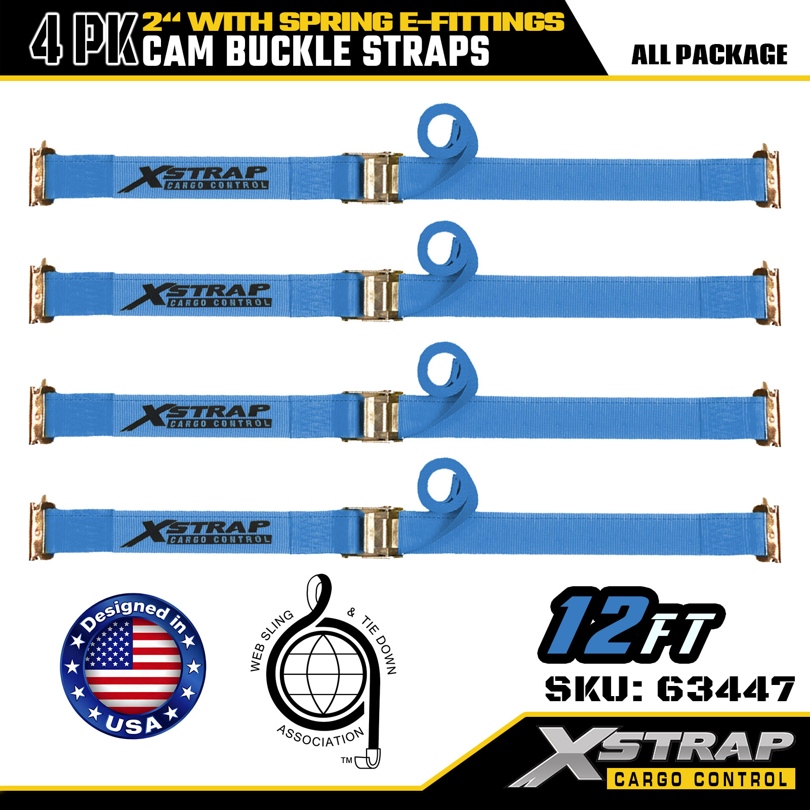 Xstrap 63447 4 pakke 2" x 12" blå skrallestropper med fjær E-beslag og F-kroker, 733 lbs SWL & 332 lbs bruddstyrke for lastkontroll, flytting og transport
