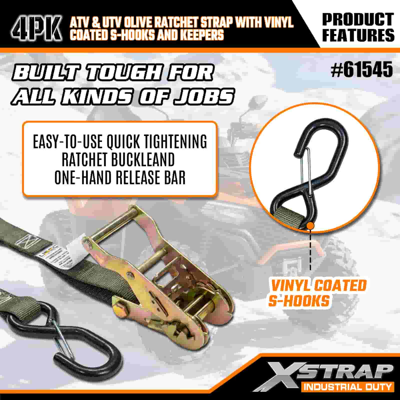 - Holdbarhet i militær klasse: Den triste olivenbåndet bruker forsterkede sømmer for å motstå slitasje og strekking, mens de vinylbelagte S-krokene forhindrer riper på kjøretøyet ditt. Den korrosjonsbestandige skralleen tåler regn, støv og saltspray for langvarig bruk.
