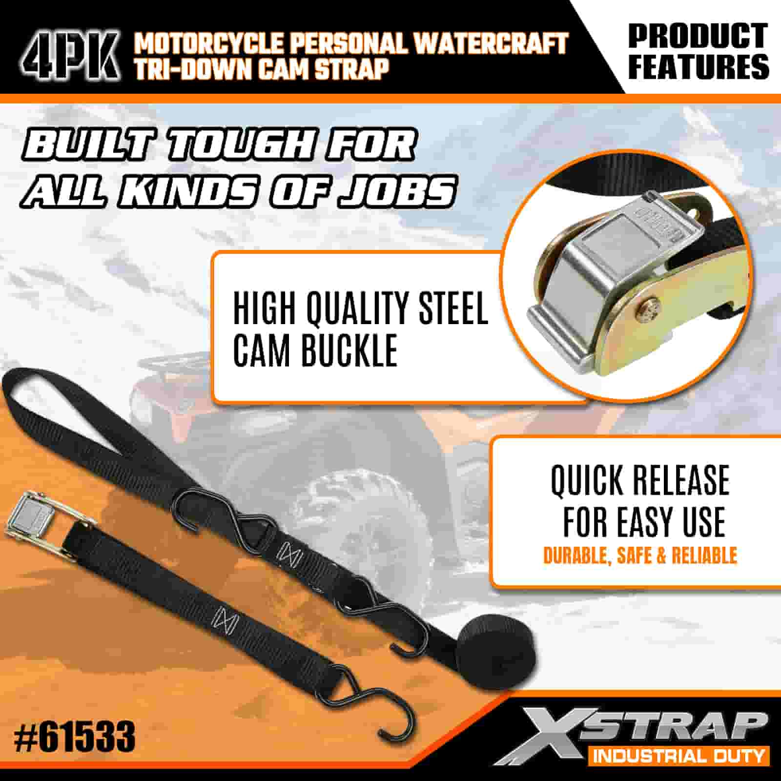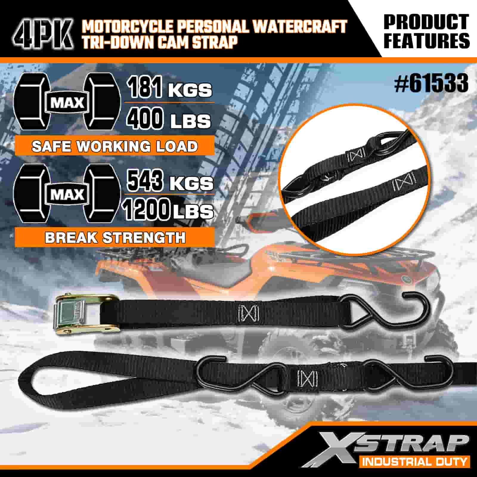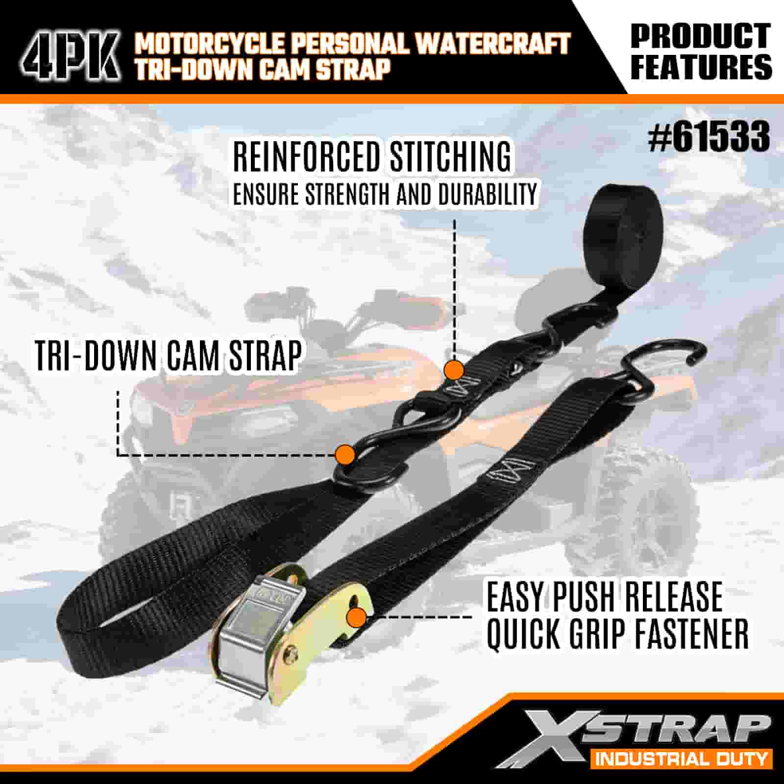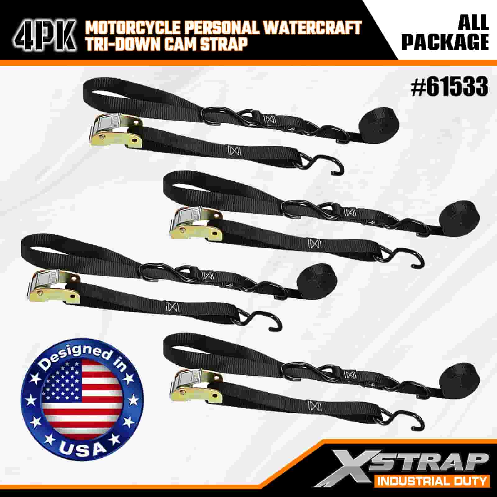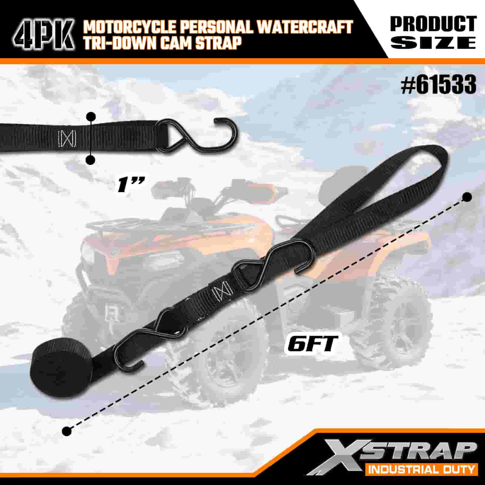 Xstrap 4PK Motorsykkel Vannscooter Tri-Down Cam Strap, 1" x 6" Polyester Tie Down Strap Pull Ratchet Spenne Strap, 400lbs Kapasitet Cargo Surring Sikringsstropper med S-kroker for den seriøse profesjonelle for å sikre lasthenger, flathenger, skibåt, liten bil.