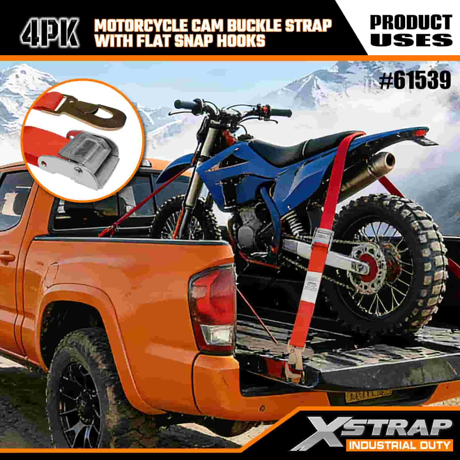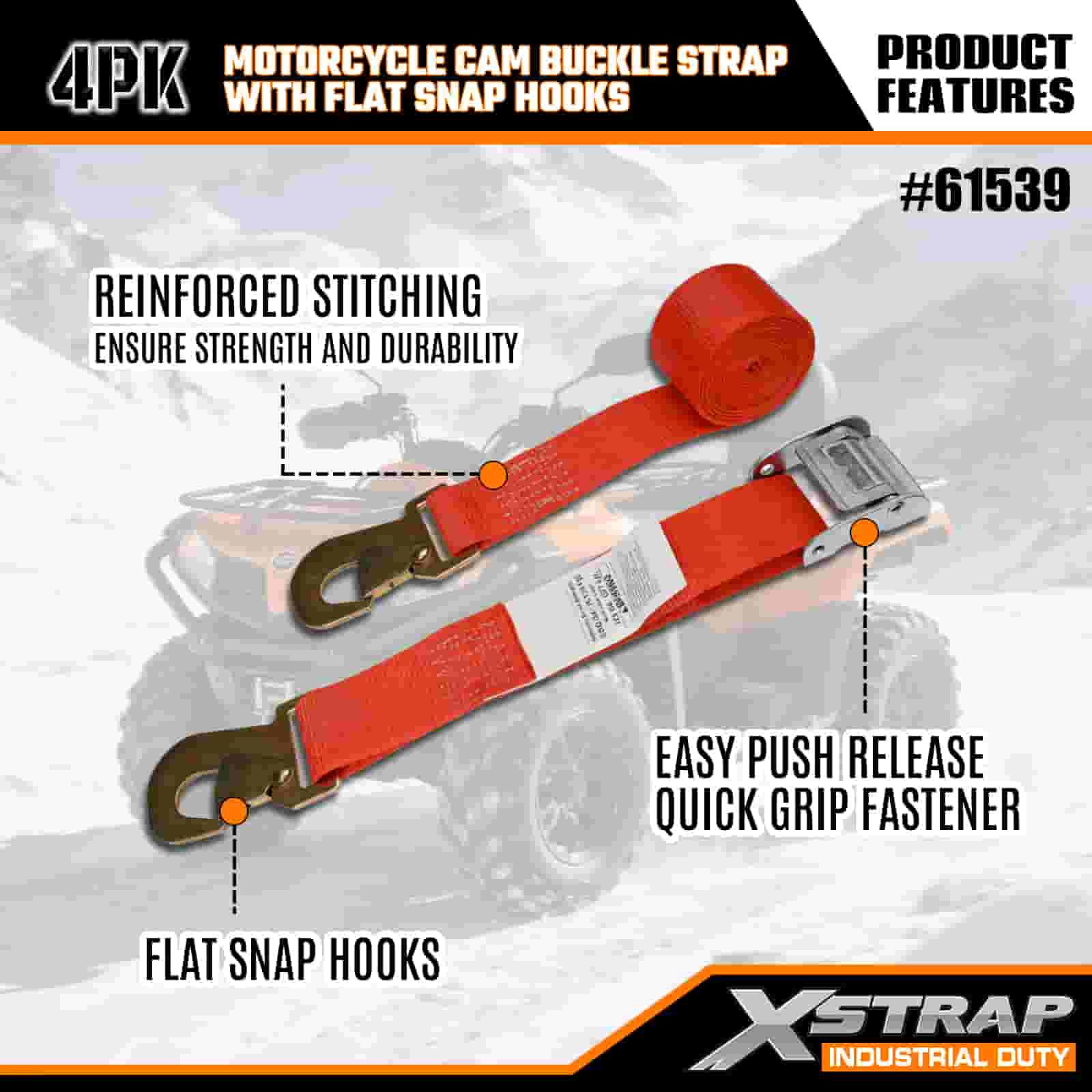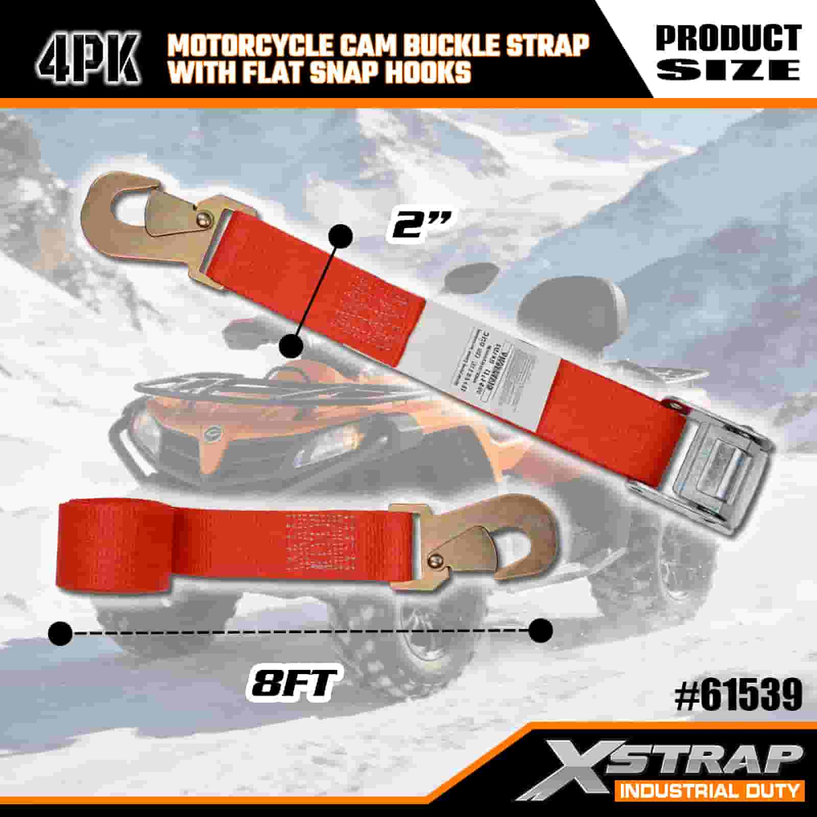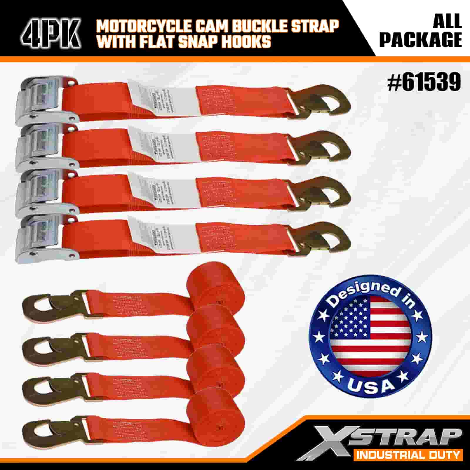 Xstrap 4PK Motorsykkel Cam Spenne Strap med flat snapkrok, 2" x 8" Polyester Tie Down Strap Trekk Ratchet Spesestopp, 400lbs Kapasitet Cargo Surring Sikringsstropper med flat snapkrok for den seriøse profesjonelle å sikre lastehenger, flathenger, skibåt.