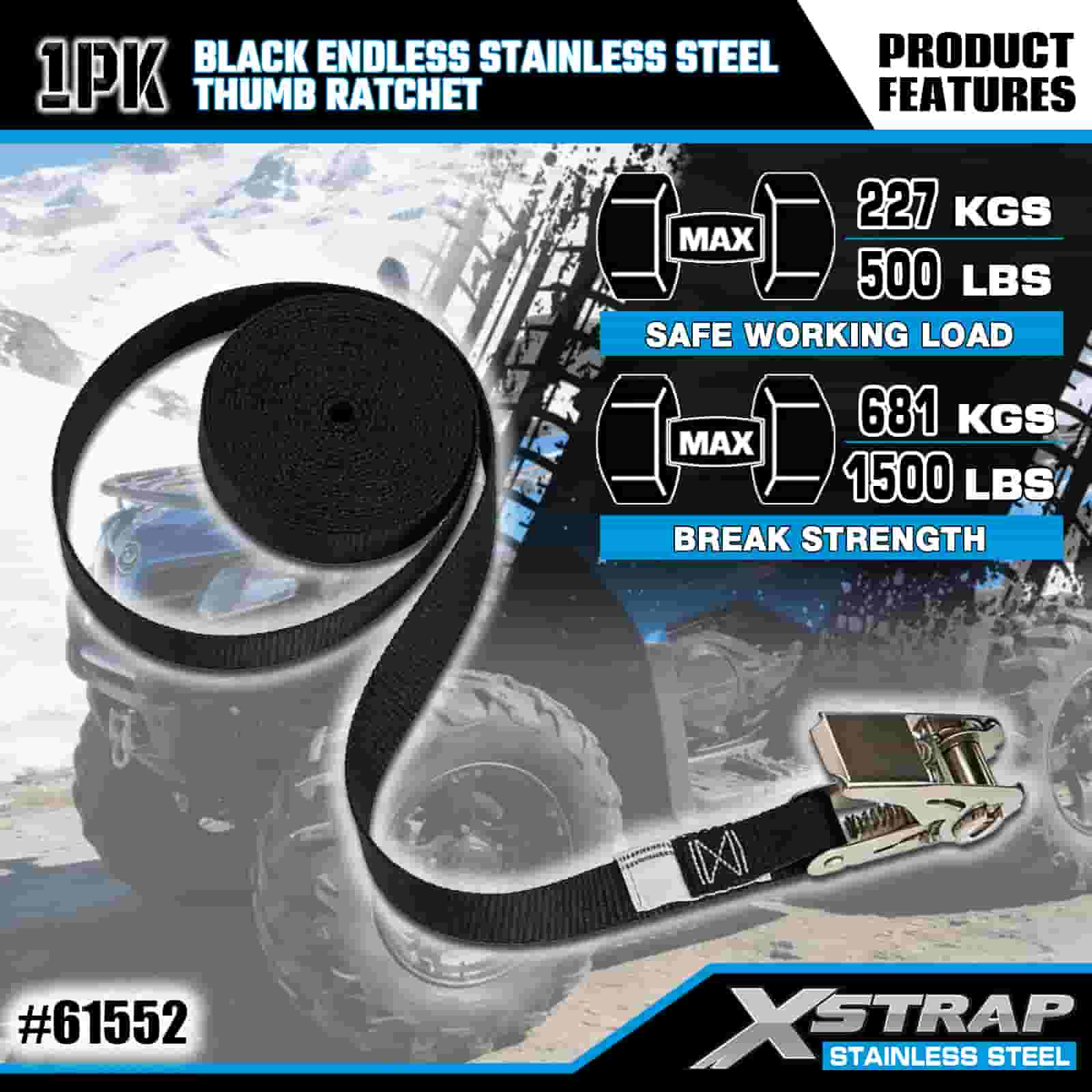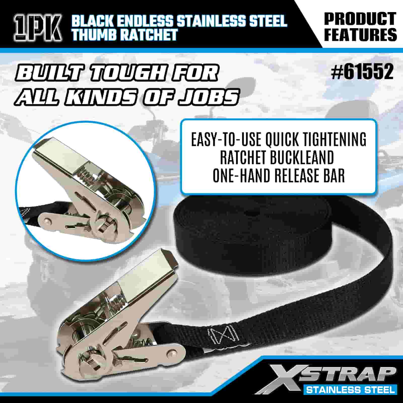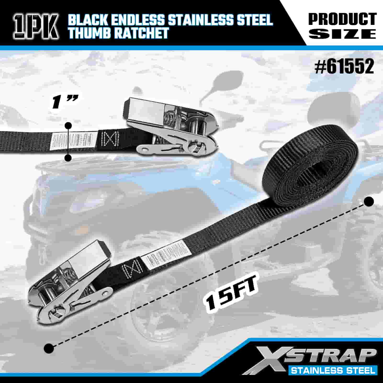 Xstrap svart endeløs tommelskralle i rustfritt stål, 1" x 15' polyester festestrop skrallestropp, 500 lbs Kapasitet Cargo Surring Sikringsstropper for tilhenger, flatseng tilhenger skibåt, liten bil, tungt utstyr.