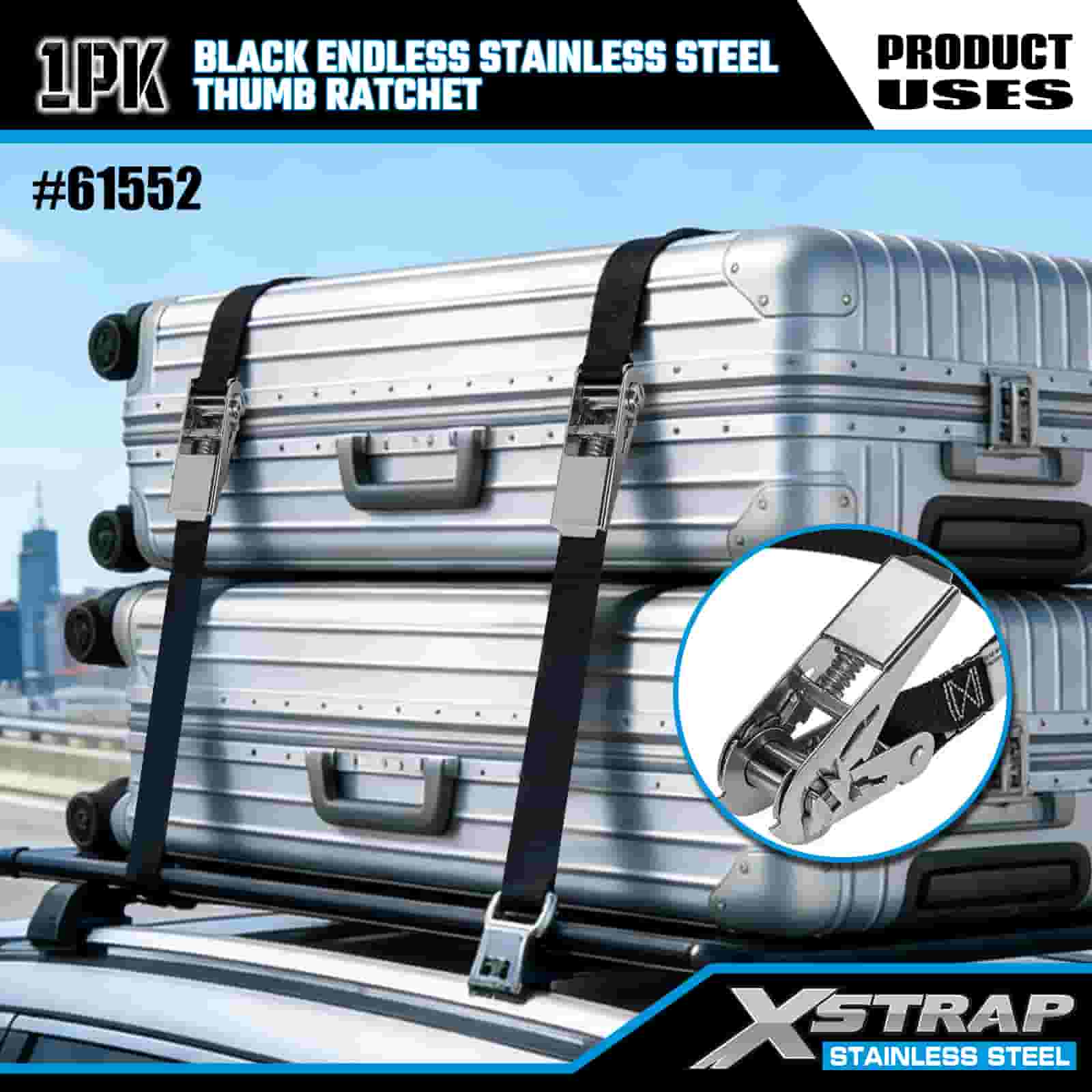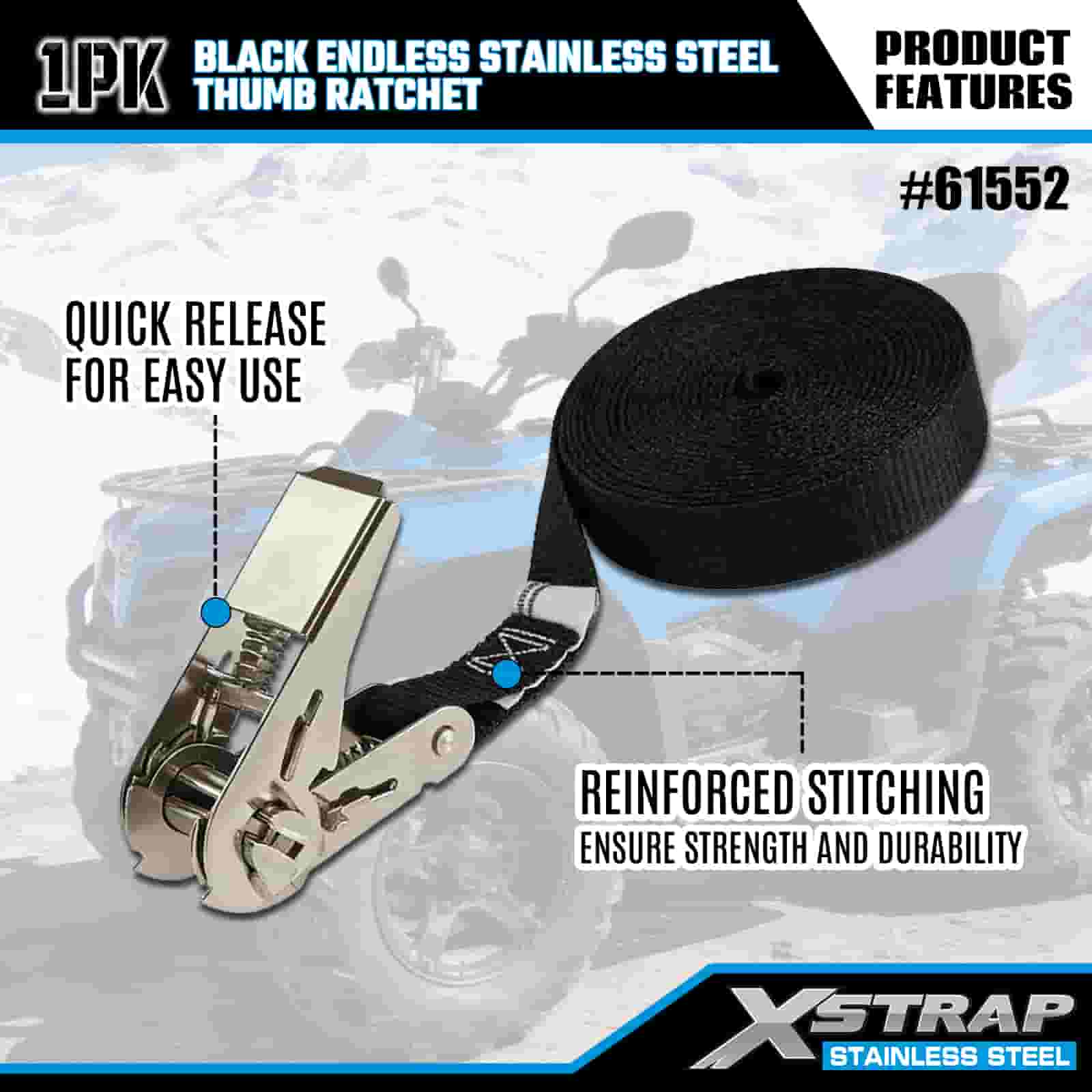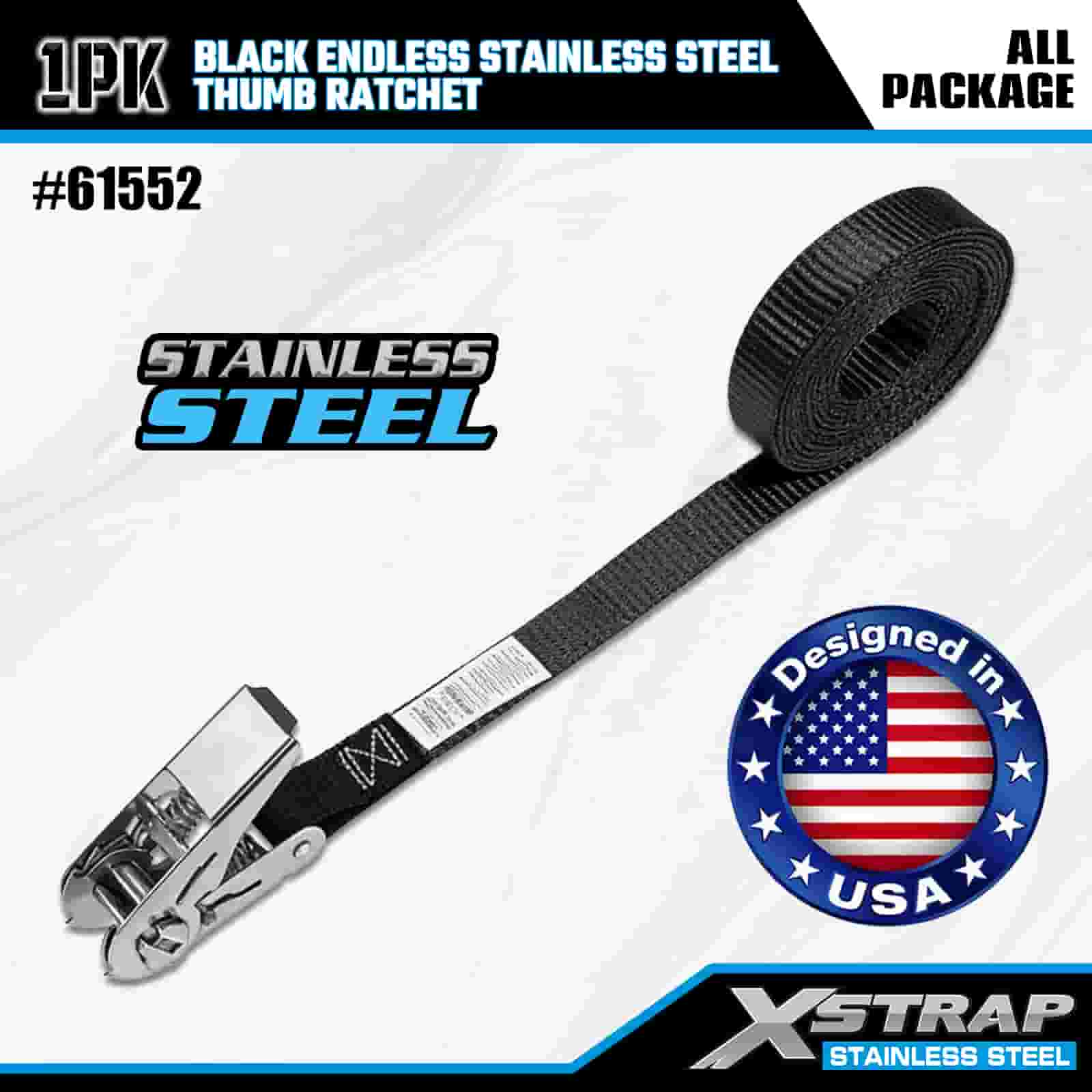 Xstrap svart endeløs tommelskralle i rustfritt stål, 1" x 15' polyester festestrop skrallestropp, 500 lbs Kapasitet Cargo Surring Sikringsstropper for tilhenger, flatseng tilhenger skibåt, liten bil, tungt utstyr.