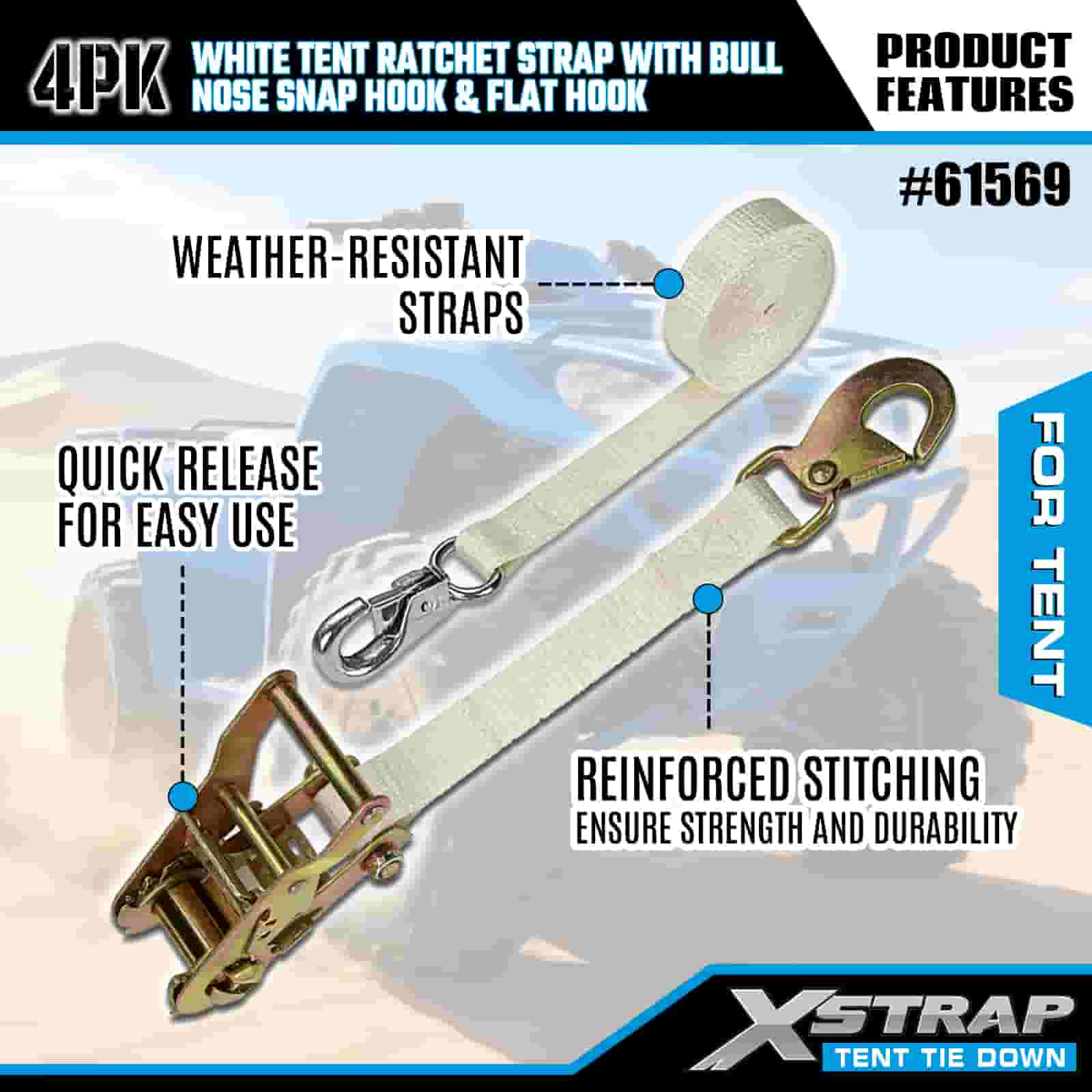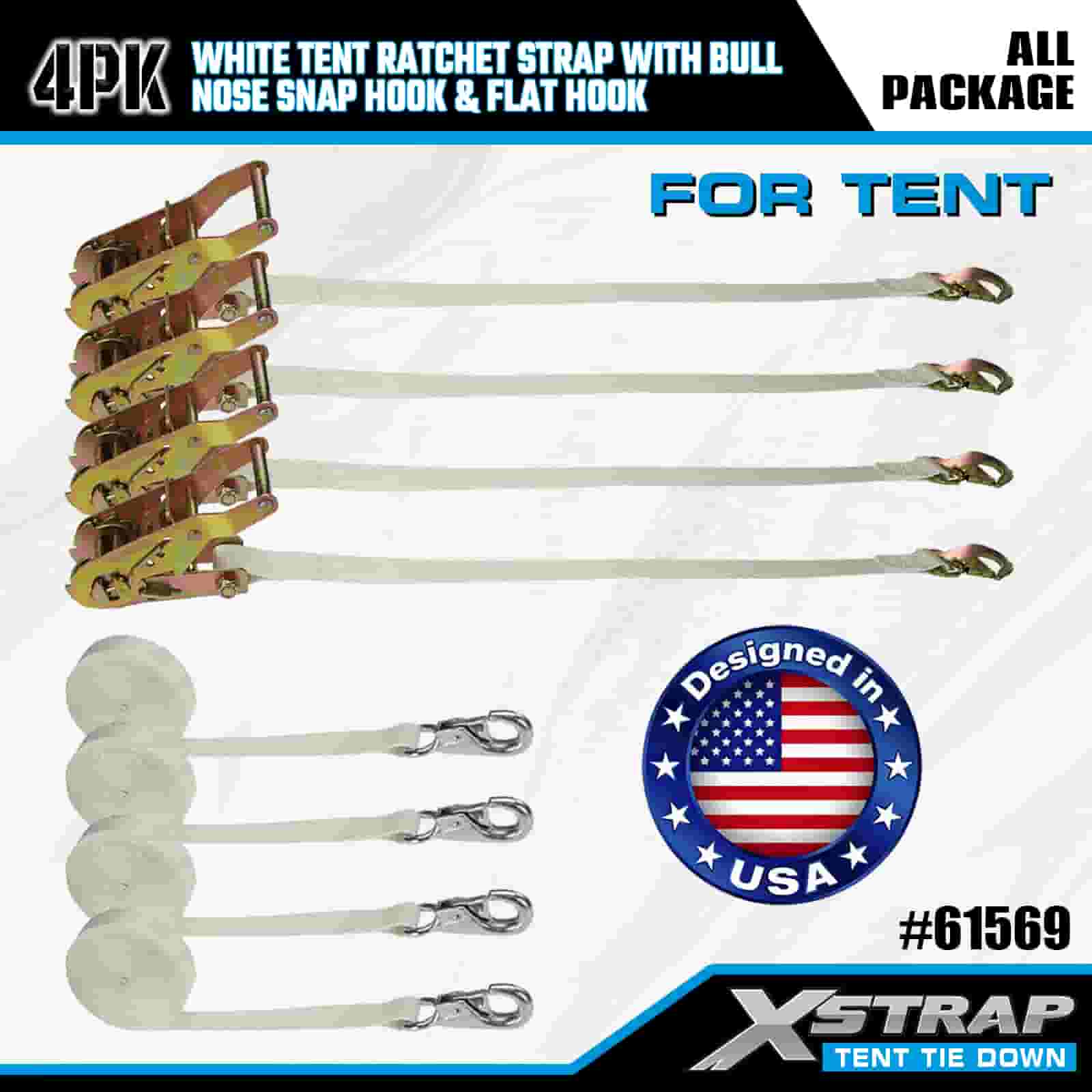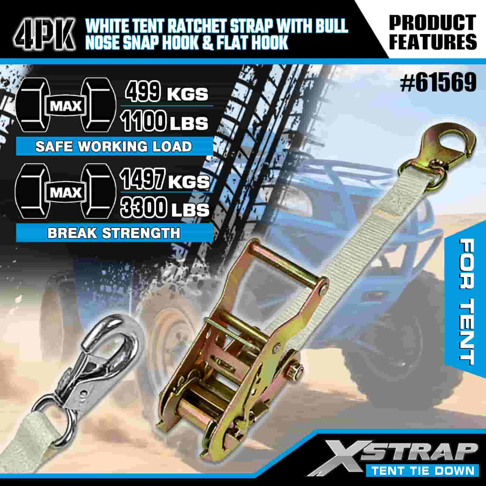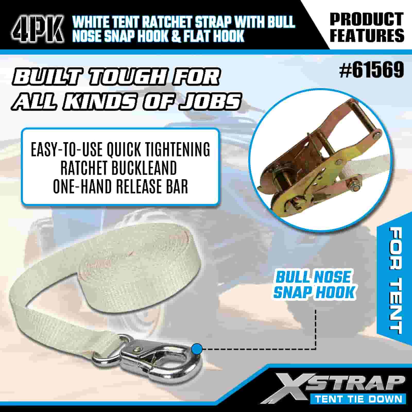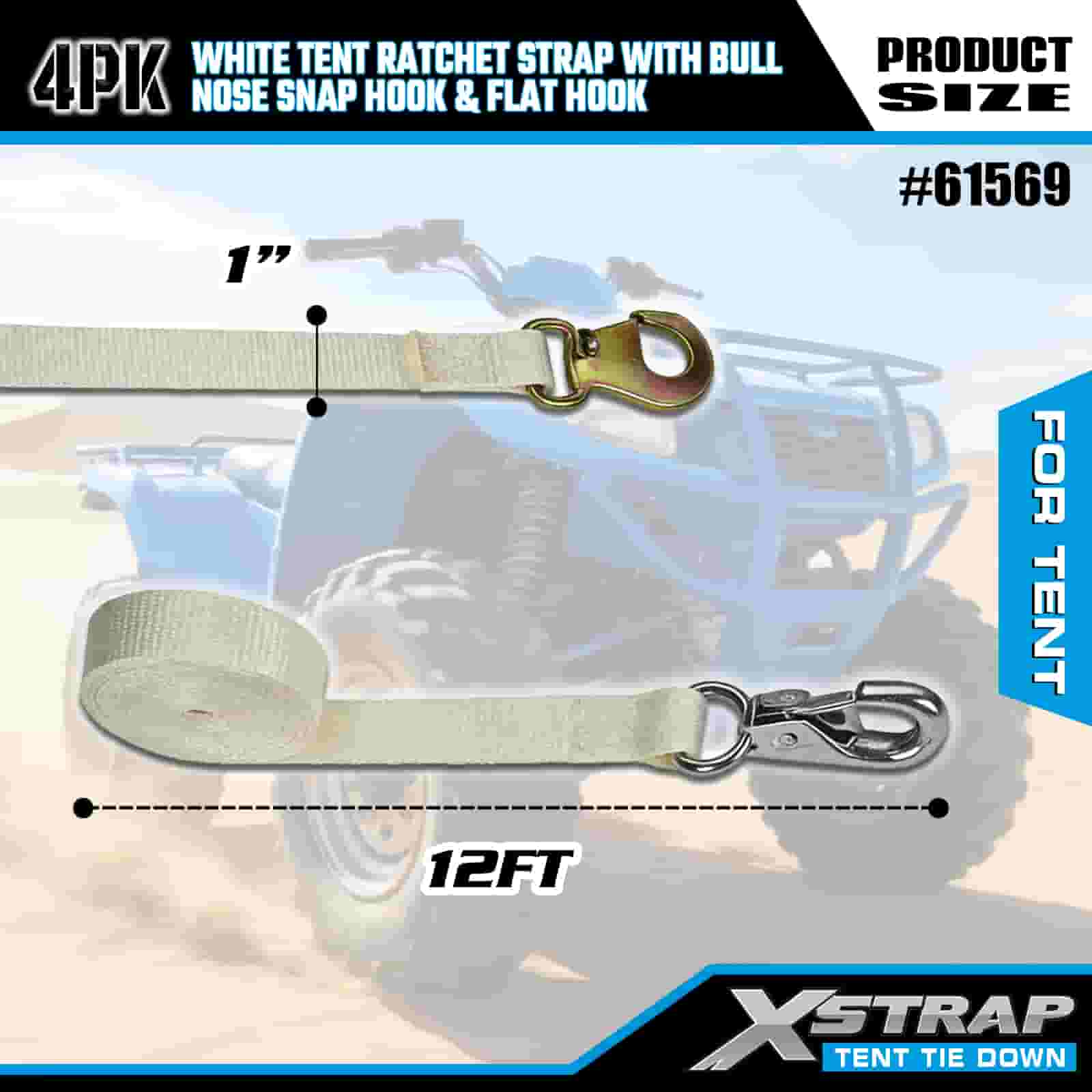 Xstrap 4PK hvit telt skrallestropp med Bull Nose Snap krok og flat krok, 1" x 12" Polyester bindingsstropp Ratchet stropp, 1100lbs Kapasitet Cargo Surring Sikringsstropper med Nese Snap Hook og flat krok for lastkontroll, teltfiksering.