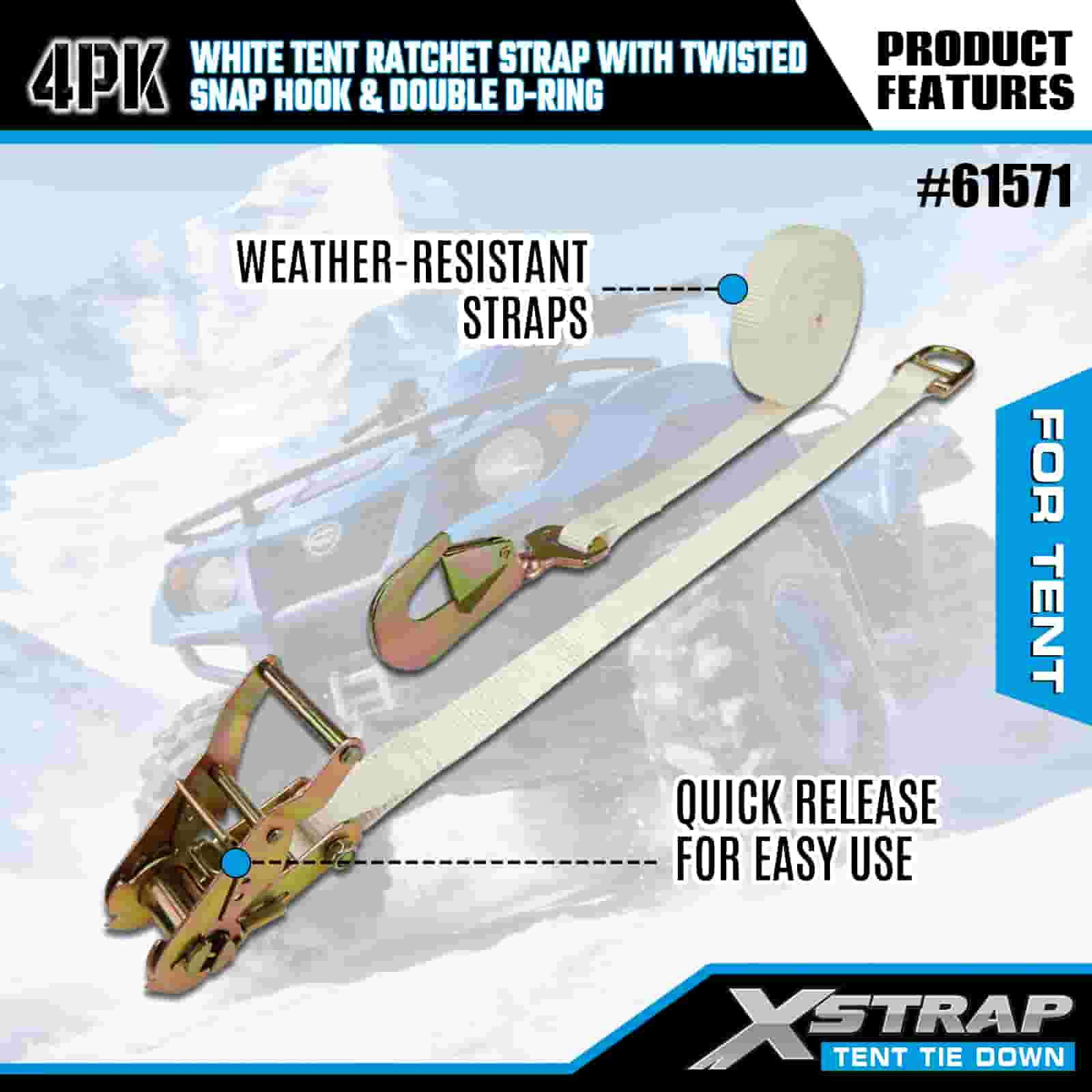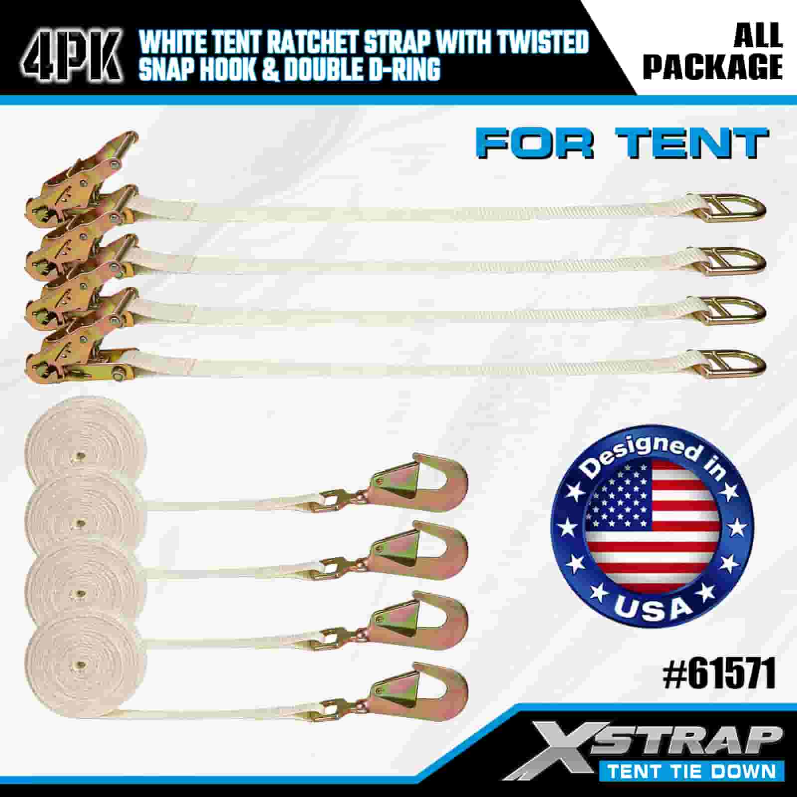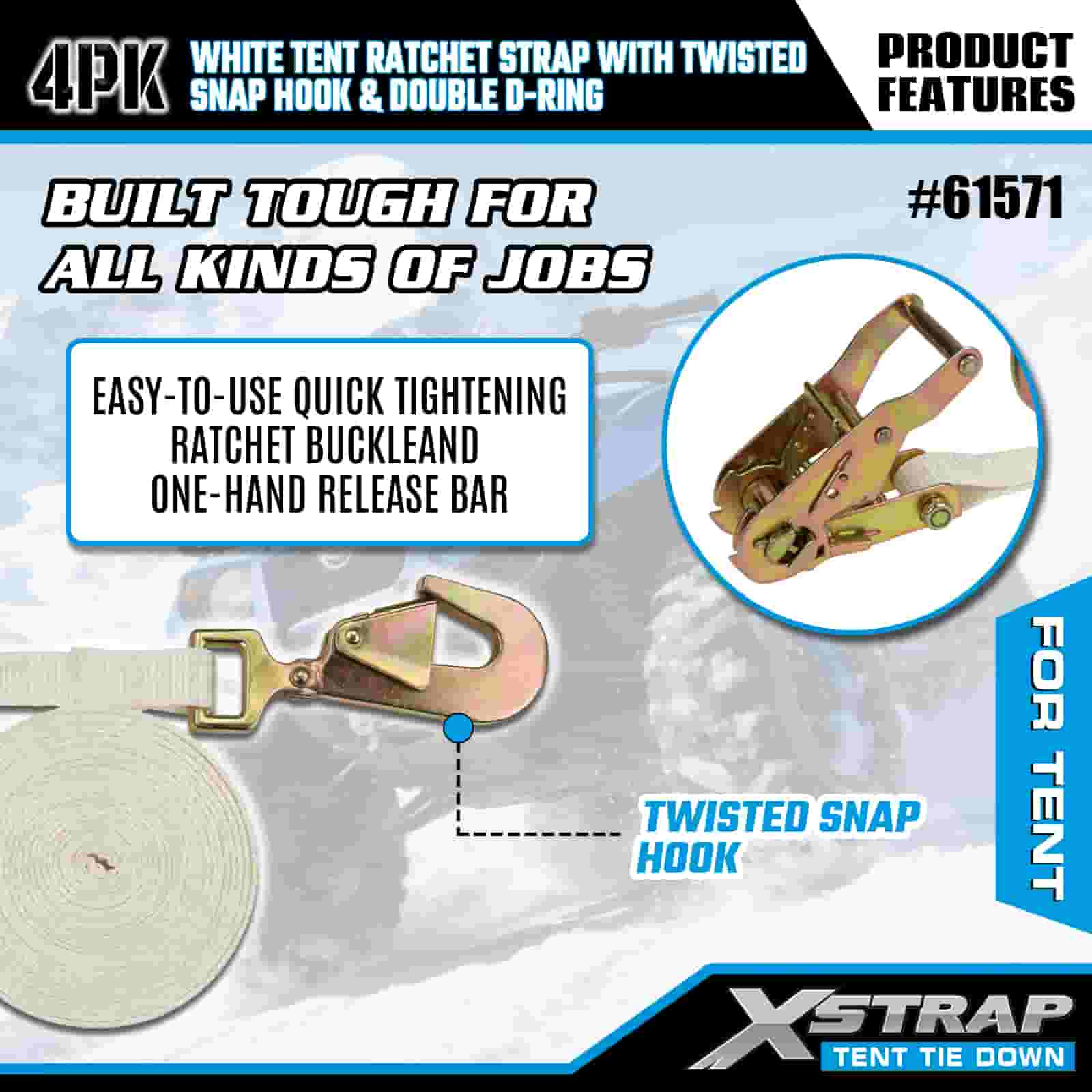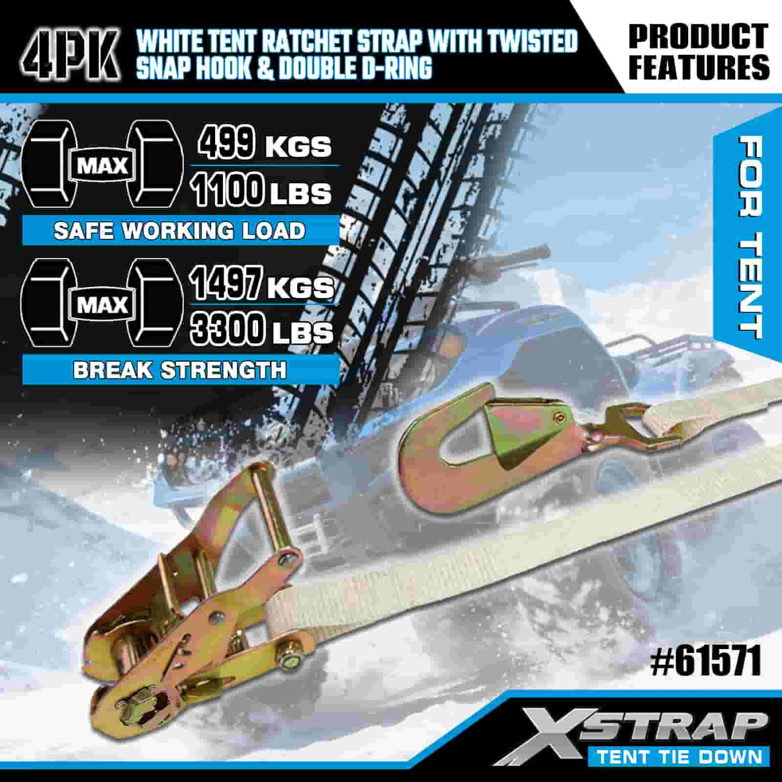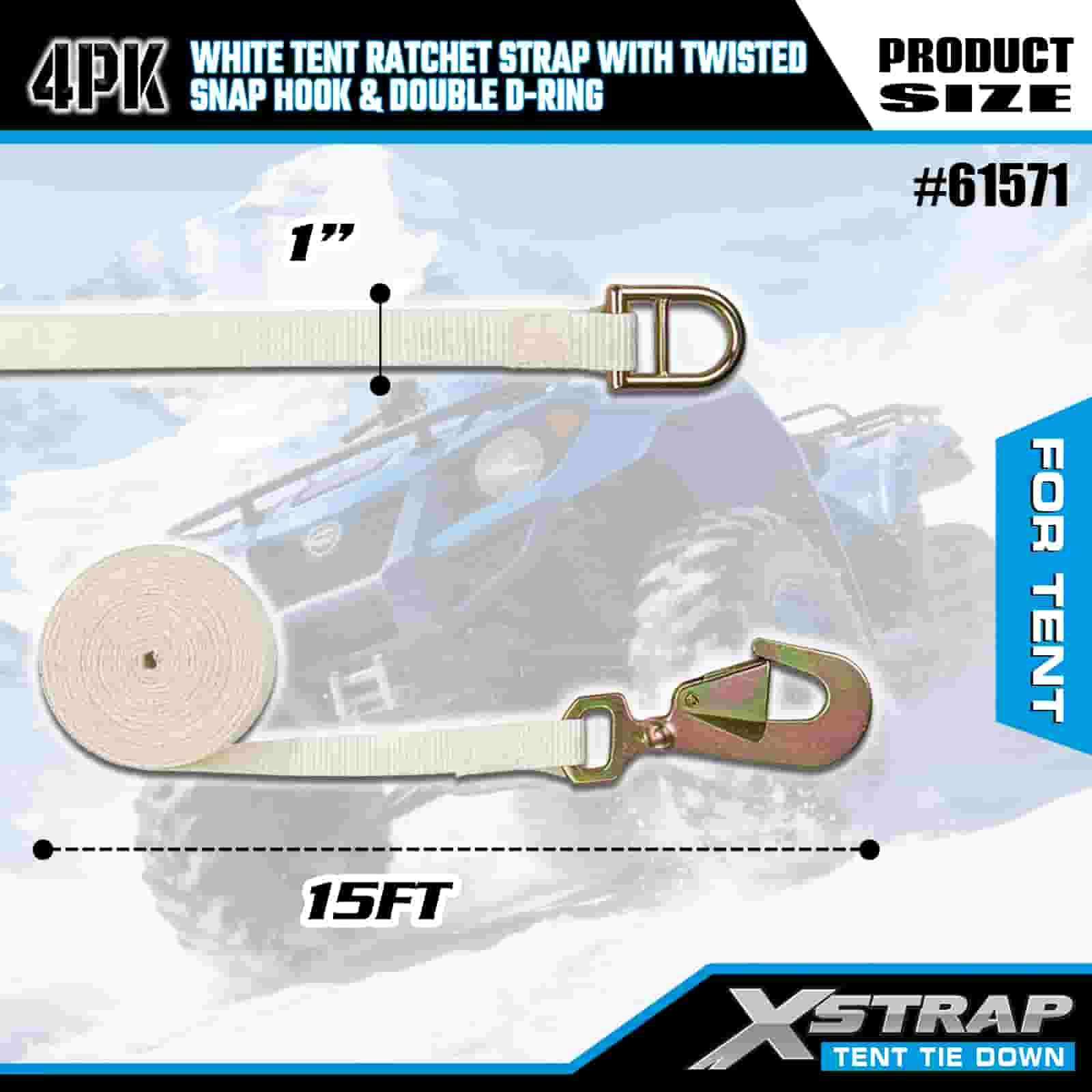 Xstrap 4PK hvit telt skrallestropp med vridd snapkrok og dobbel D-ring, 1" x 15" polyester festestrop skrallestropp, 1100lbs Kapasitet Lastsurring Festestropper med vridd snapkrok og dobbel D-ring for lastkontroll, teltfiksering.