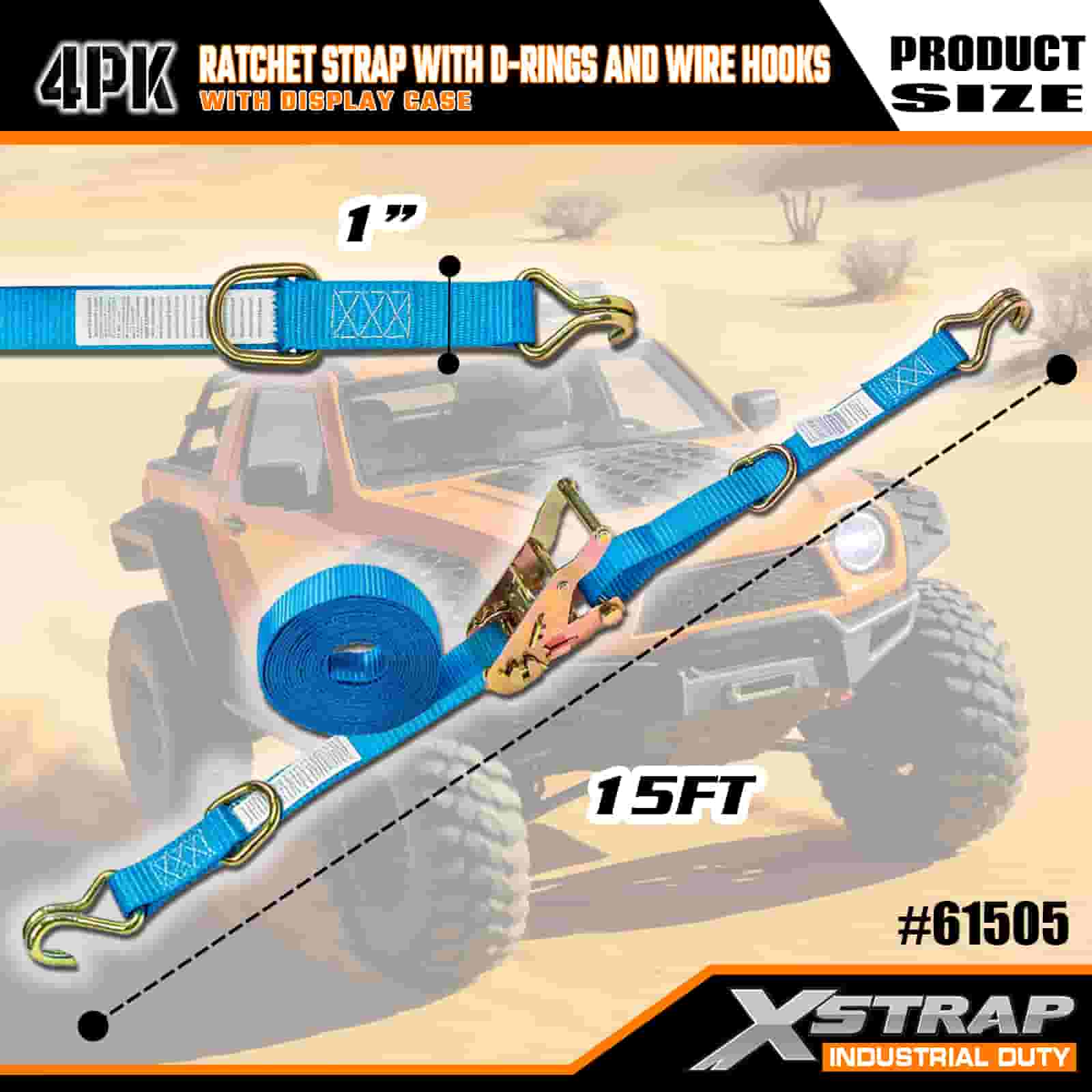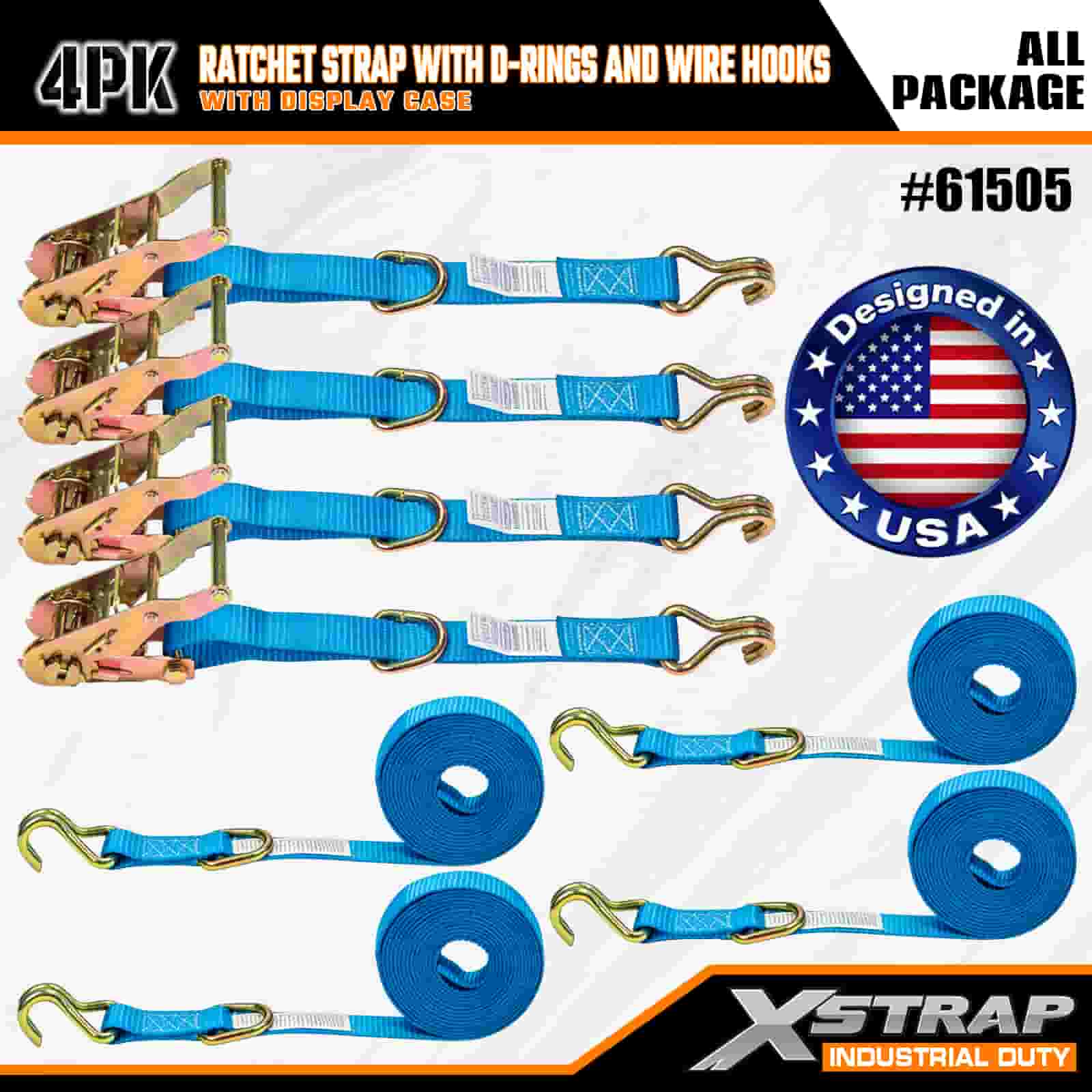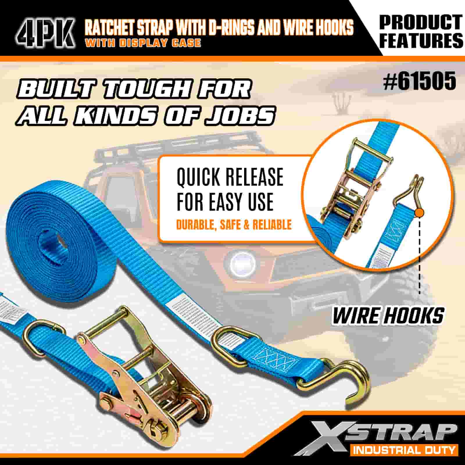 Xstrap 4-paks kamspenne feste ned med D-ring og wirekroker, 1" x 15" polyester festestrop Trekksperrestropp, 400lbs Kapasitet Cargo Surring Sikringsstropper med wirekroker for den seriøse profesjonelle for å sikre lastehenger, flathenger, skibåt, liten bil.