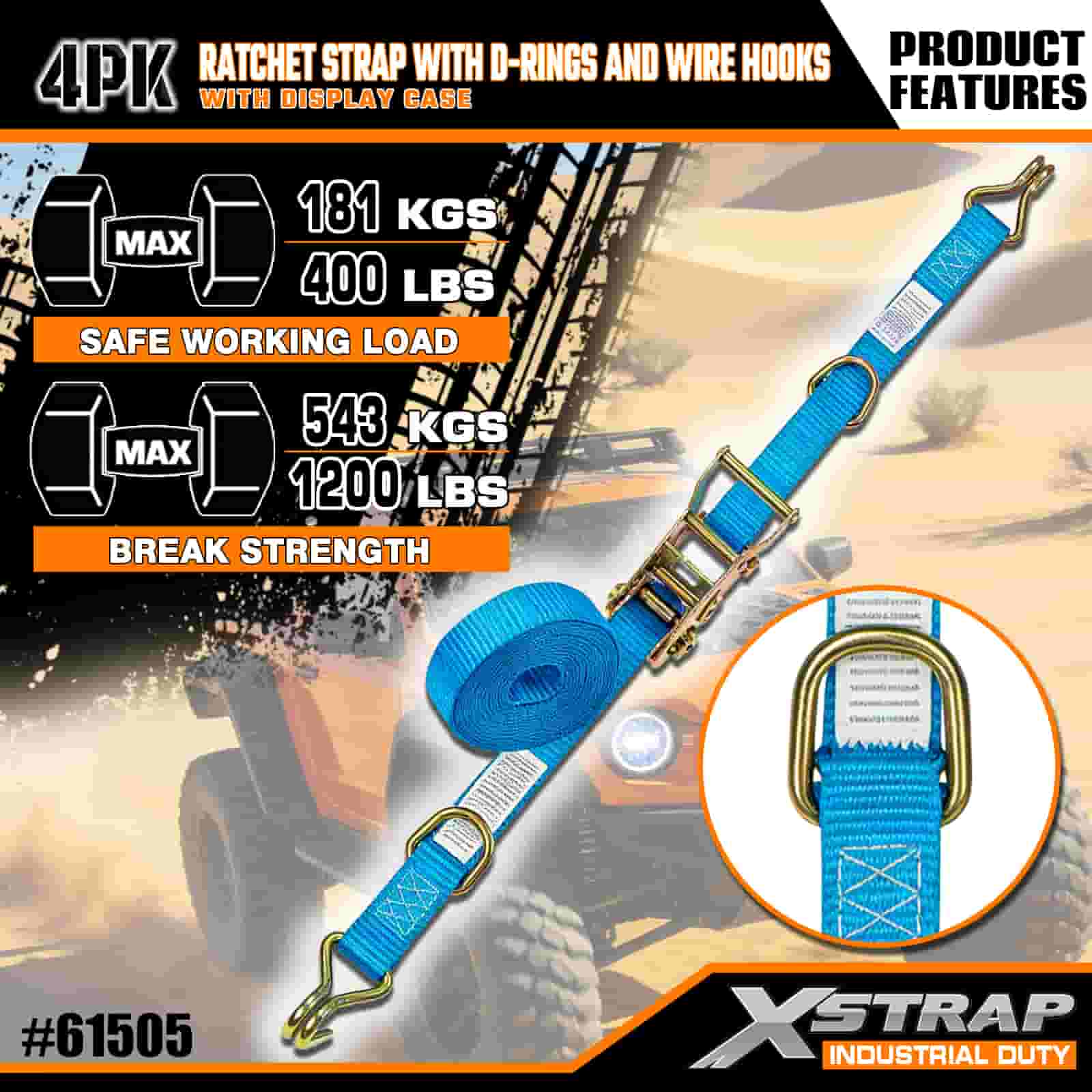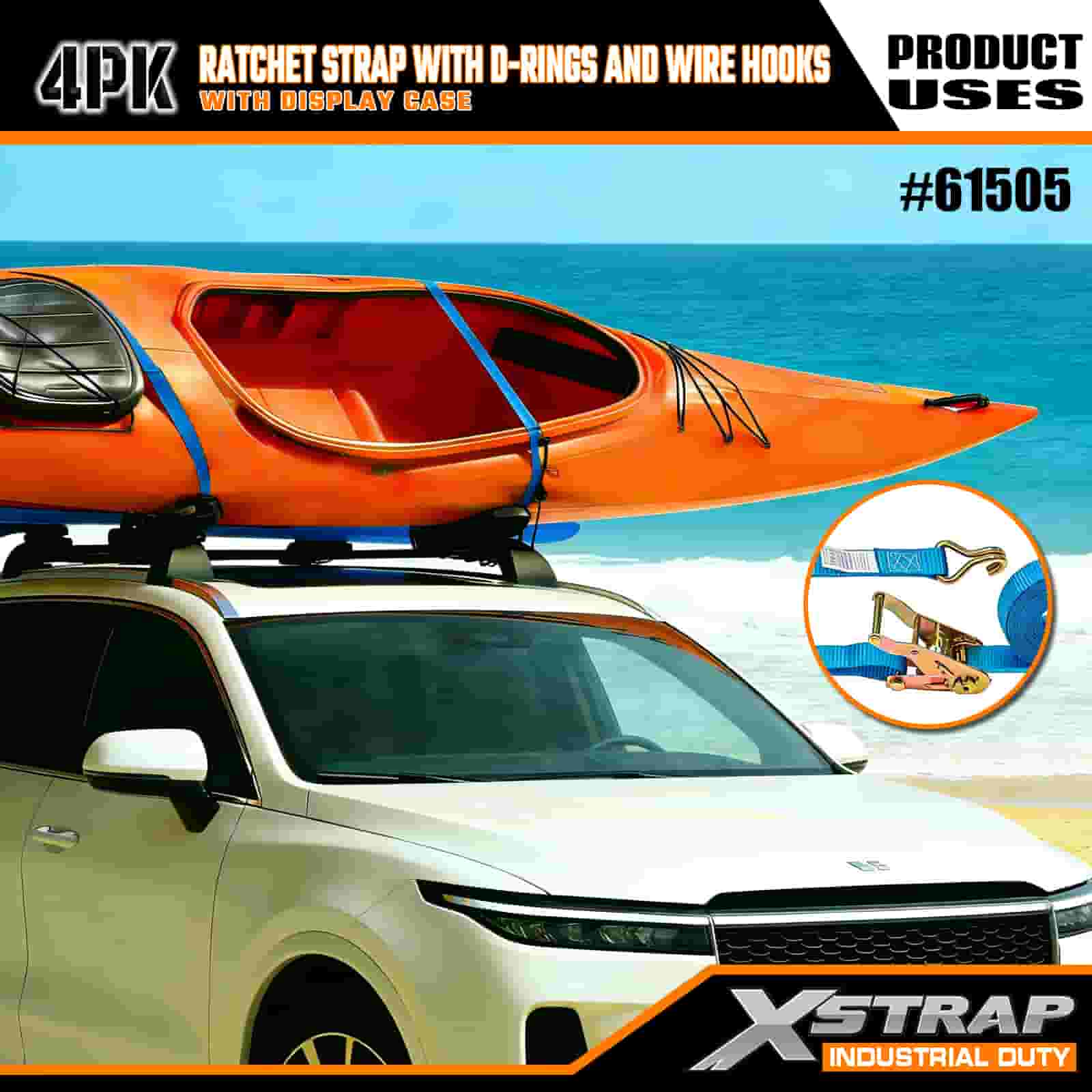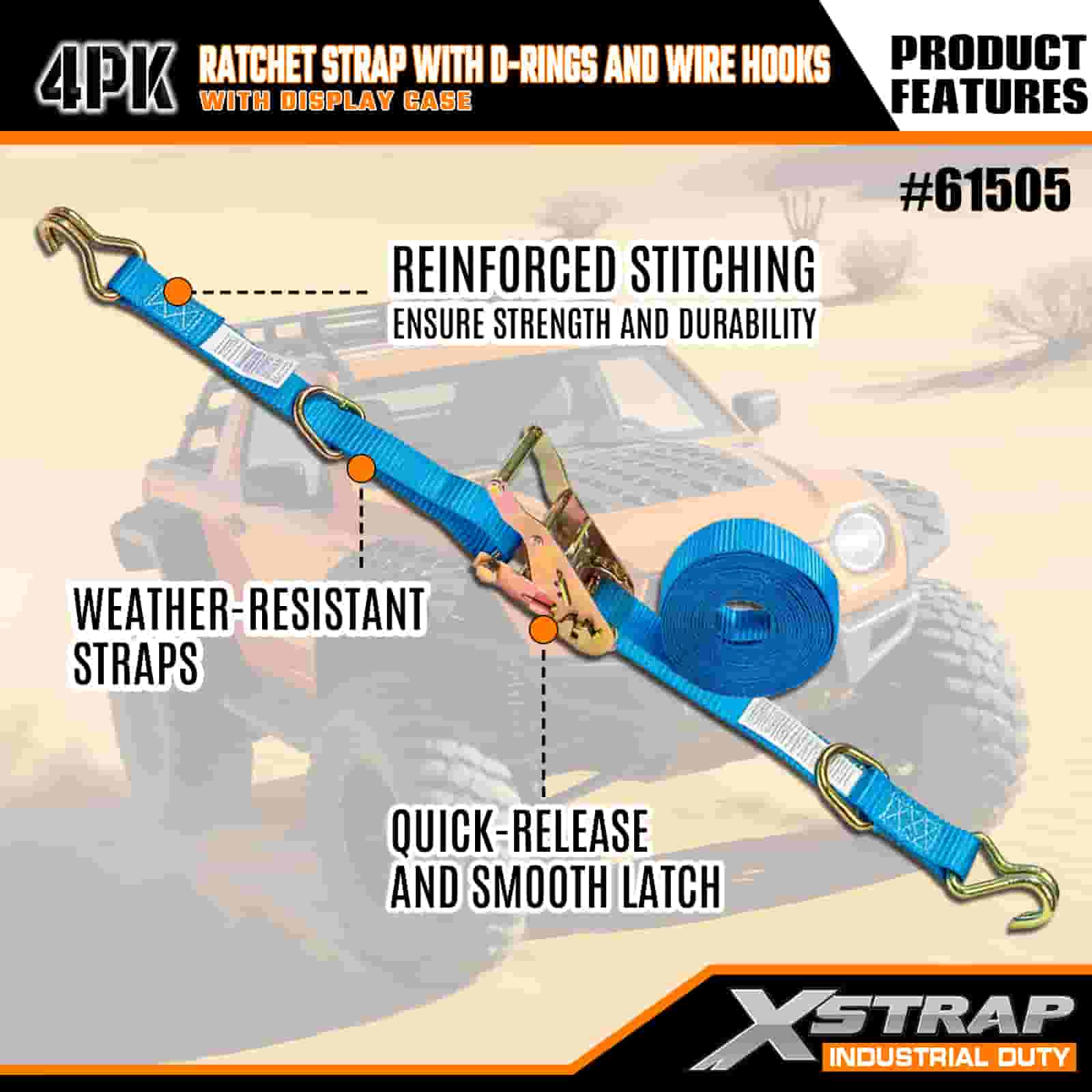 Xstrap 4-paks kamspenne feste ned med D-ring og wirekroker, 1" x 15" polyester festestrop Trekksperrestropp, 400lbs Kapasitet Cargo Surring Sikringsstropper med wirekroker for den seriøse profesjonelle for å sikre lastehenger, flathenger, skibåt, liten bil.