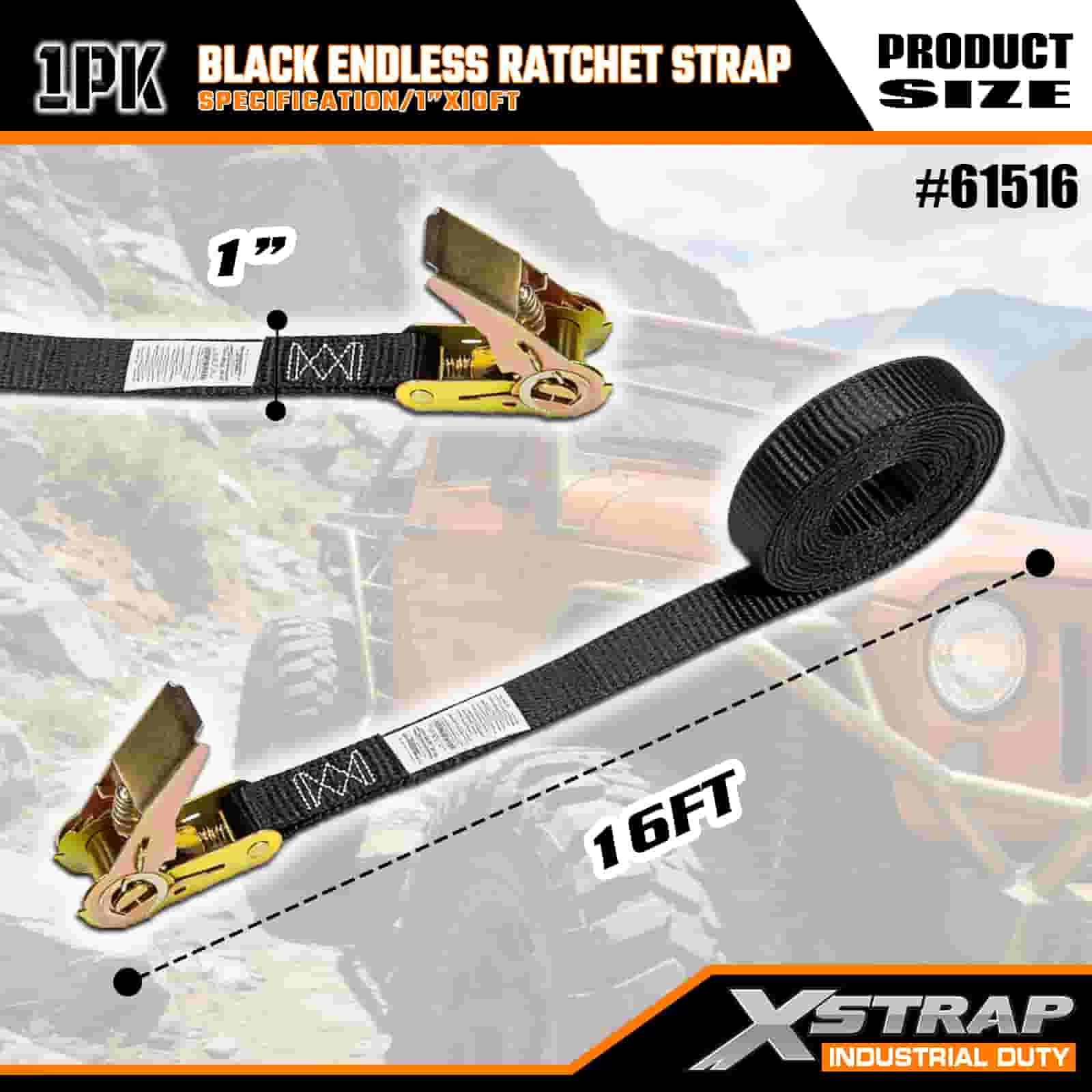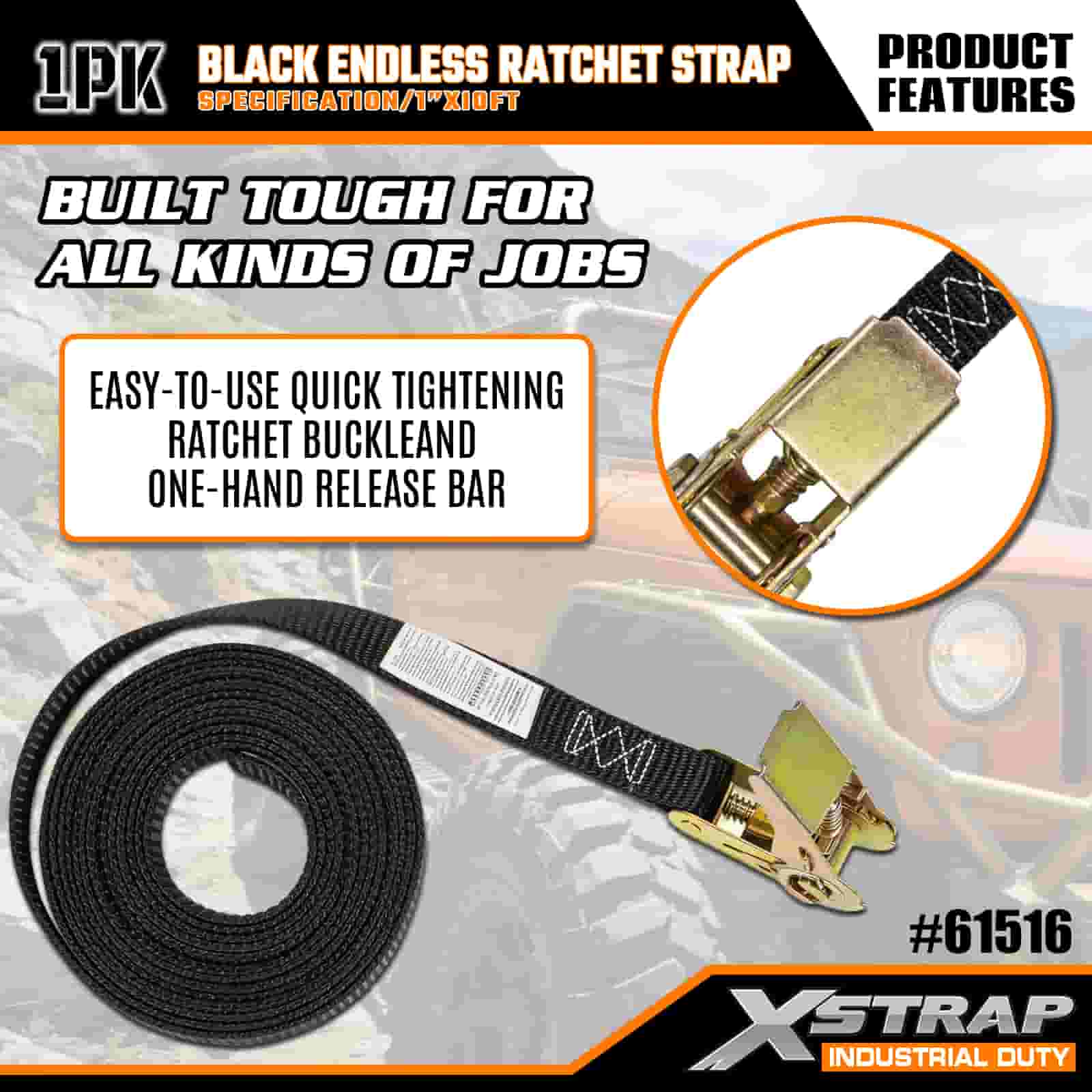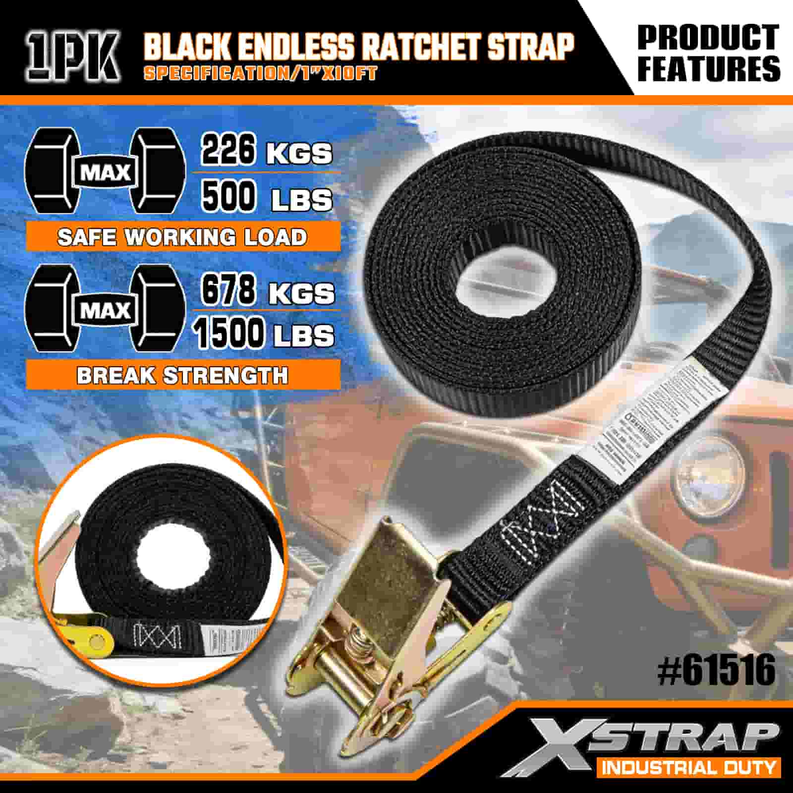 Xstrap Svart Endeløs skrallestropp, 1" x 10" Polyester Tie Down Strap Pull Ratchet Strap, 500lbs Kapasitet Cargo Surring Sikringsstropper for den seriøse profesjonelle for å sikre lasthenger, flathenger, skibåt, liten bil.