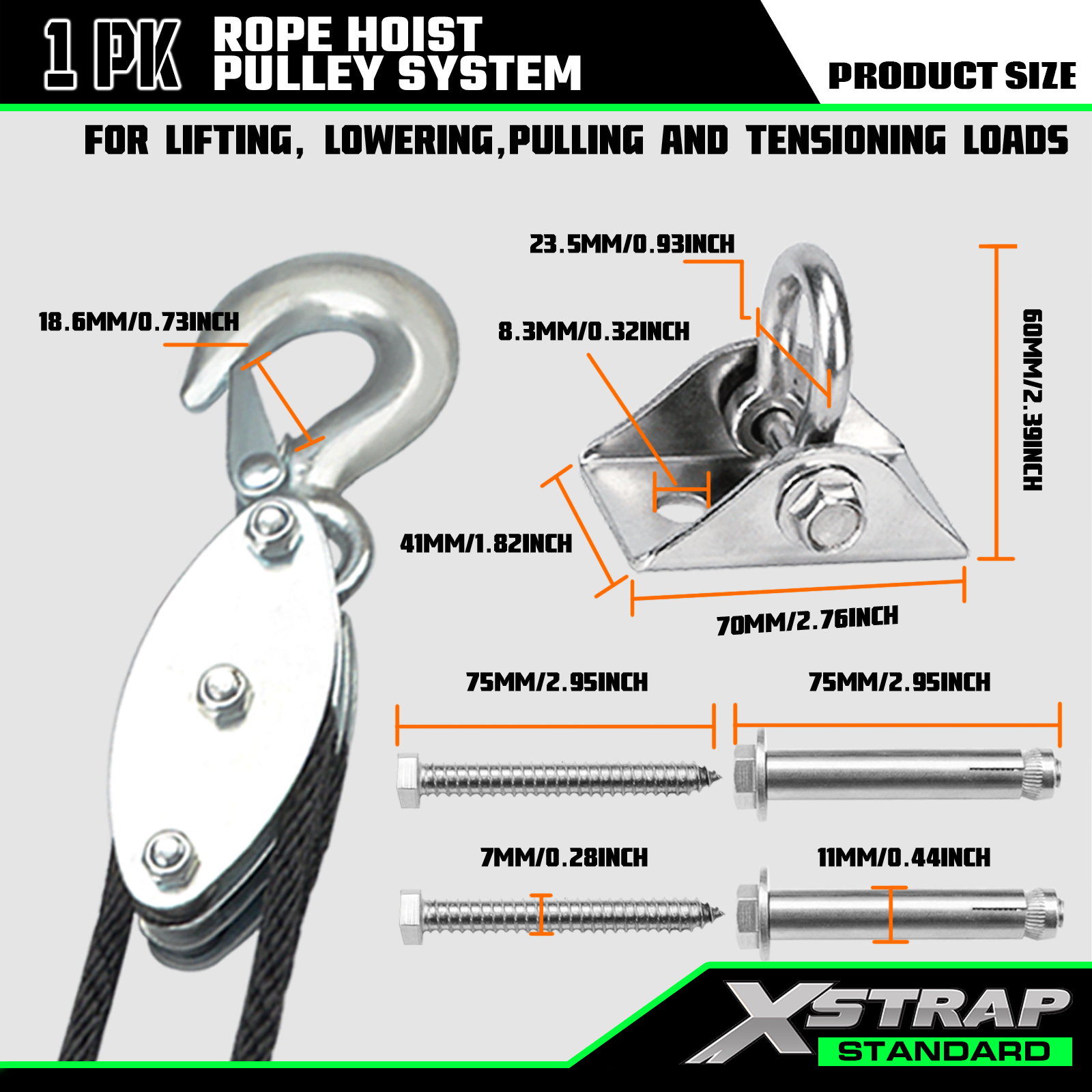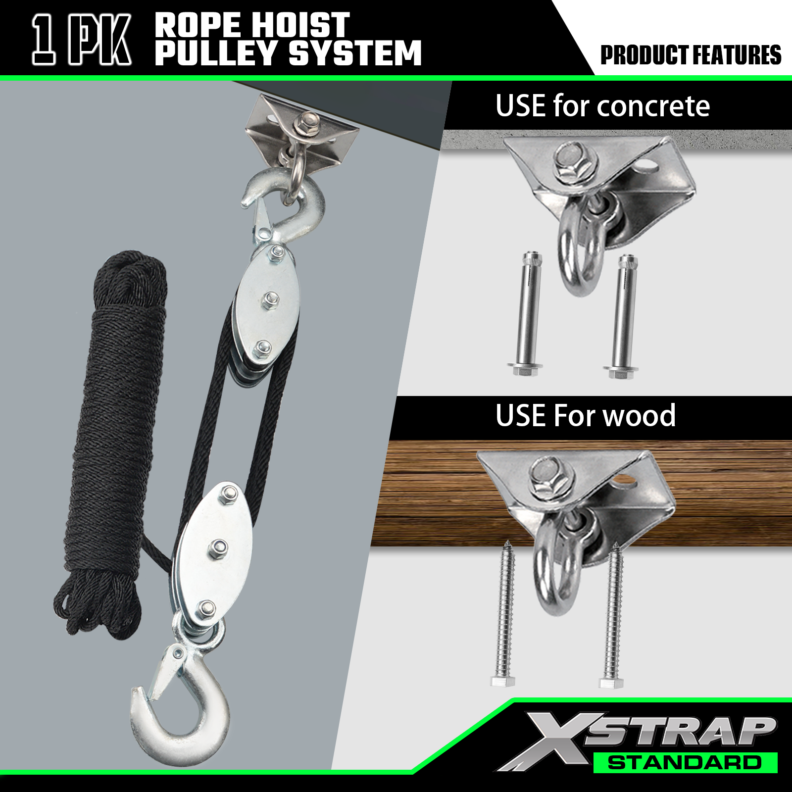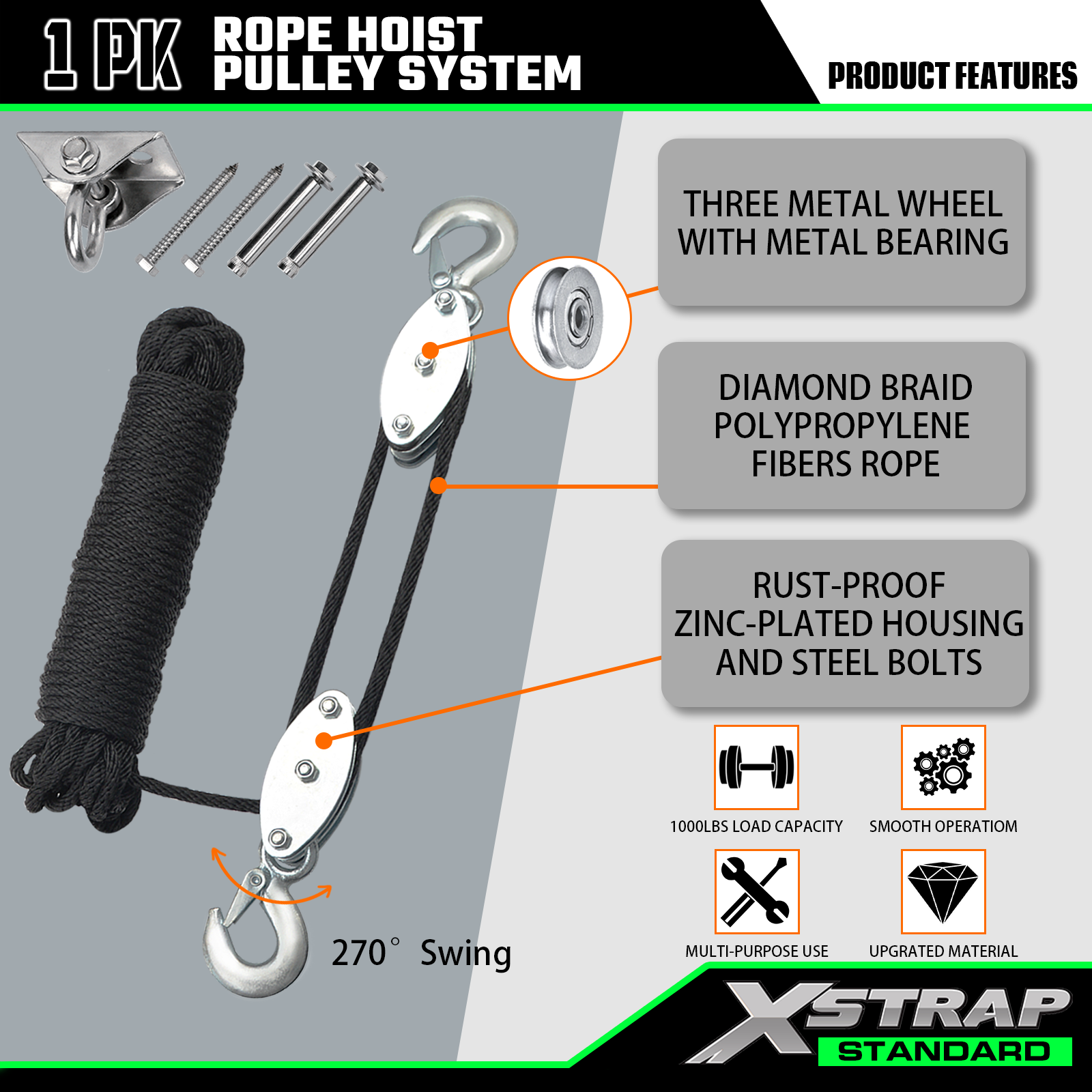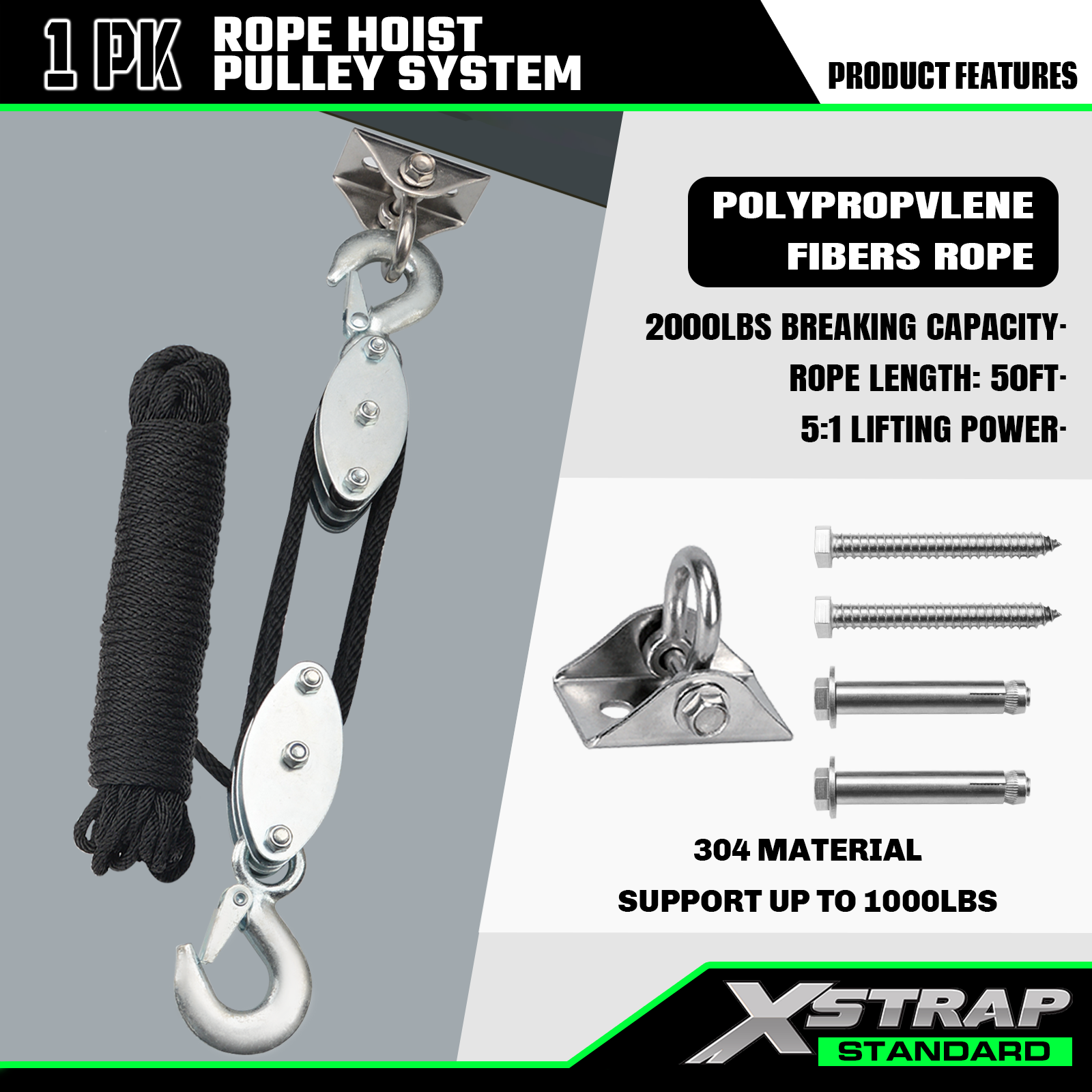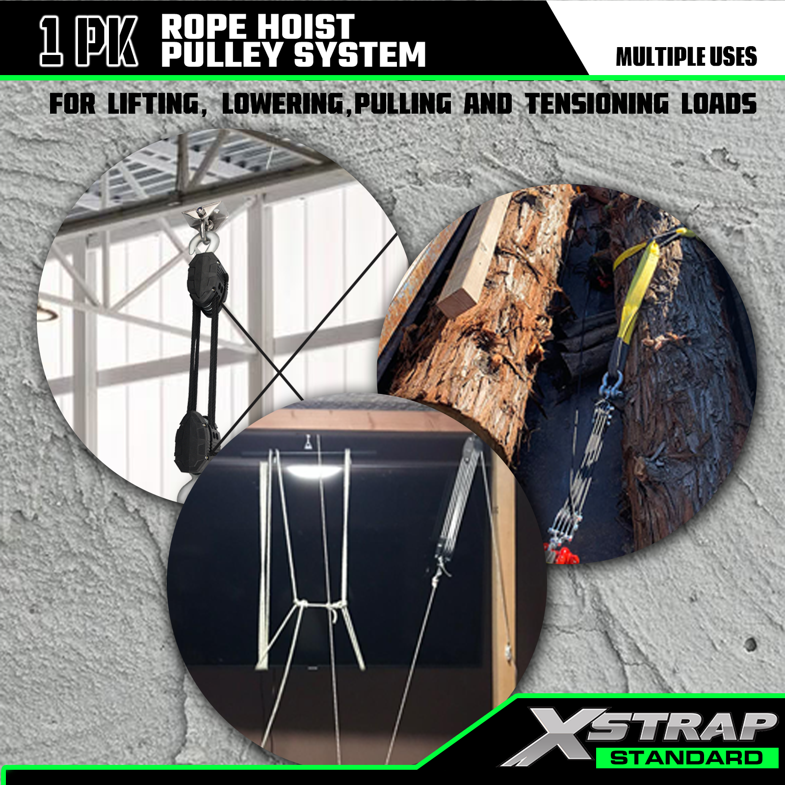 Dette er vårt XSTRAP STANDARD 50 fots tauløfter, kraftig 2000LB hjulblokk og taklehjulsystem for løfting av tunge gjenstander med arbeidshansker, 2 stk myke løkker, 1 svinghenger for garasjelager.