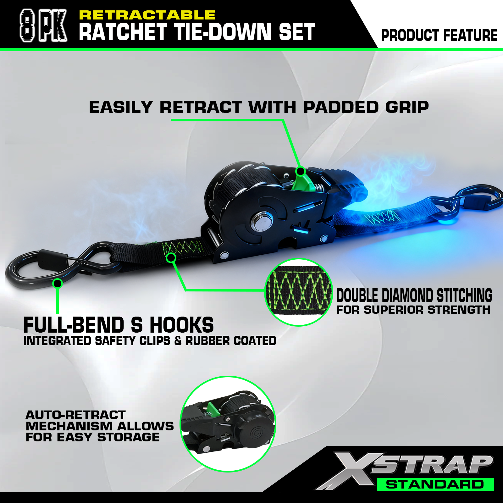 - Høykvalitets uttrekkbare skrallefestestropper - arbeidsbelastningen er 500lbs og den begrensede belastningen er 1500lbs. Stroppene vil bli testet før de sendes ut. Så vi kan sikre at lasten din er sikker under transport.
