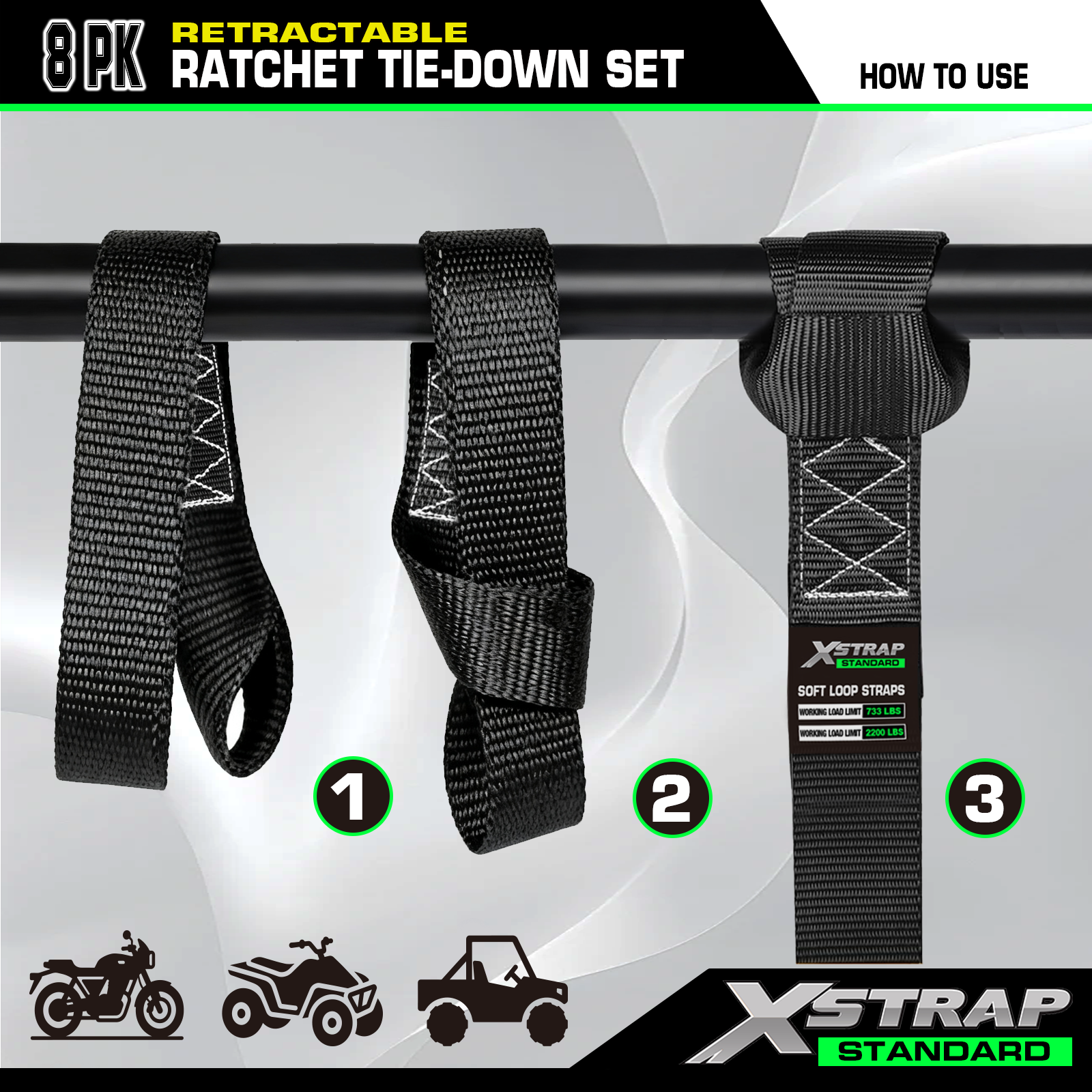 - Inkluderer 4 myke løkker - de myke løkkene kan bidra til å lage ankerpunkter på takstativ, lastebilsenger, styre. Så du kan bruke våre uttrekkbare skrallestropper i mange scenarier.