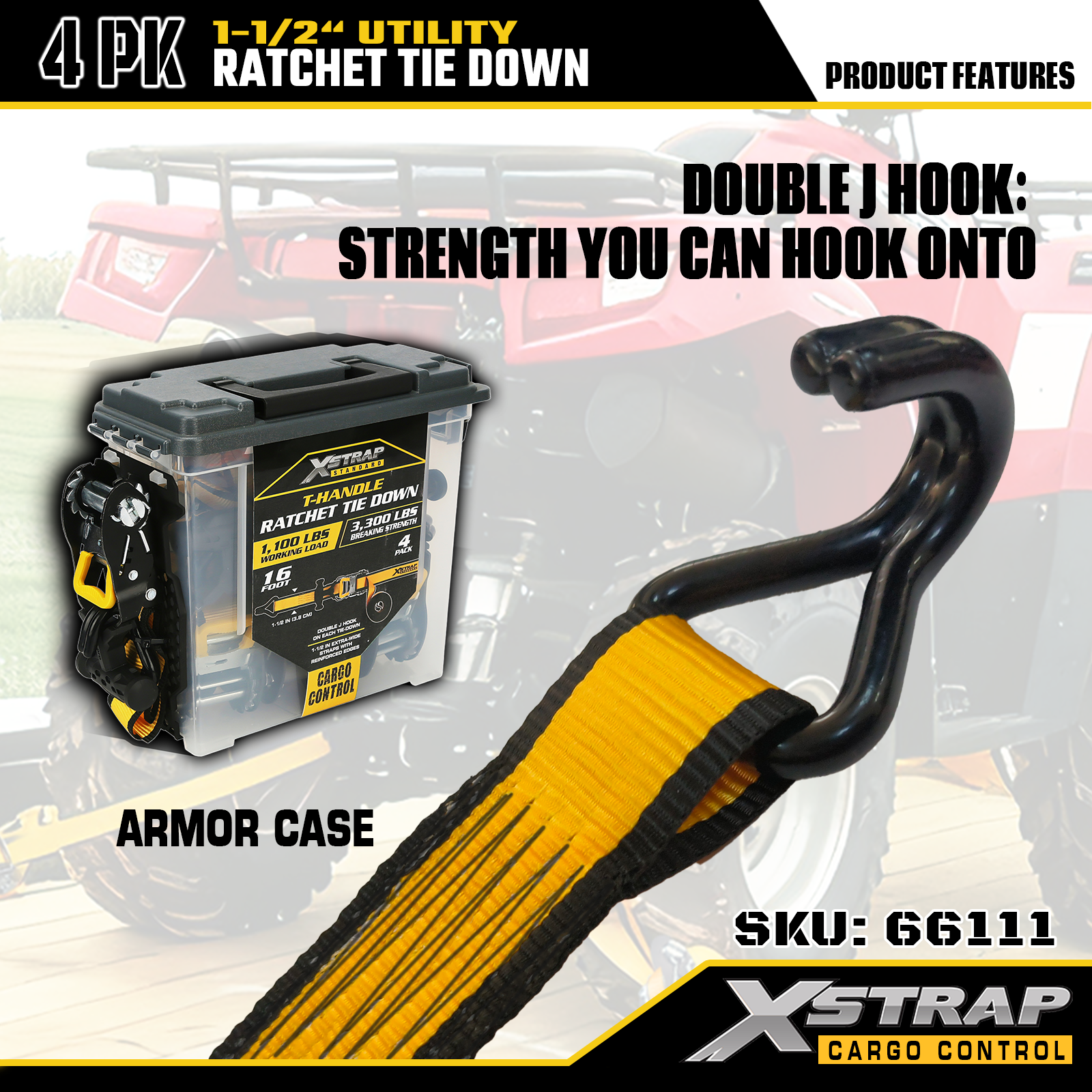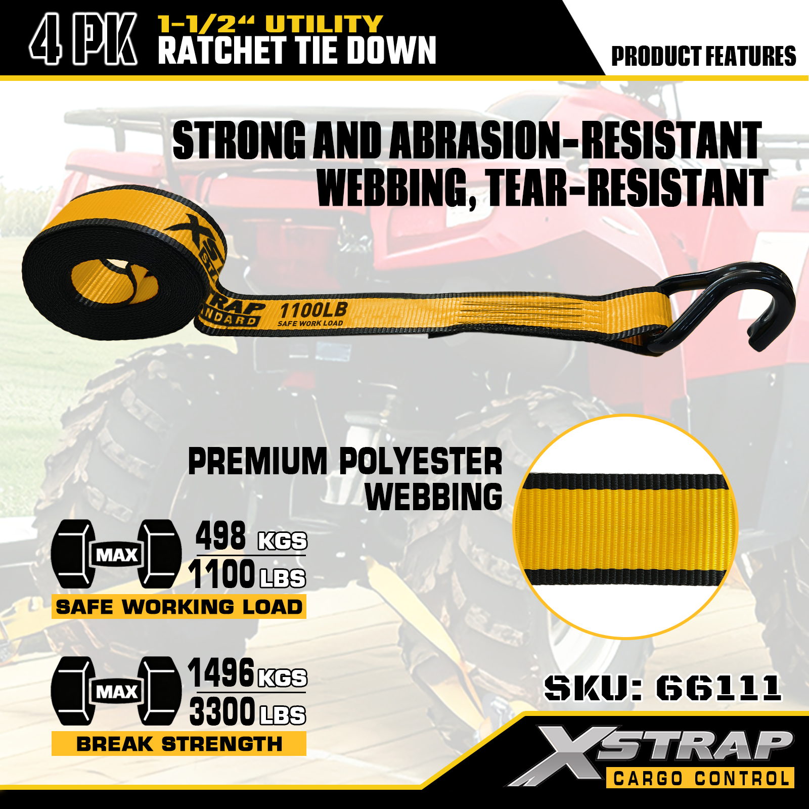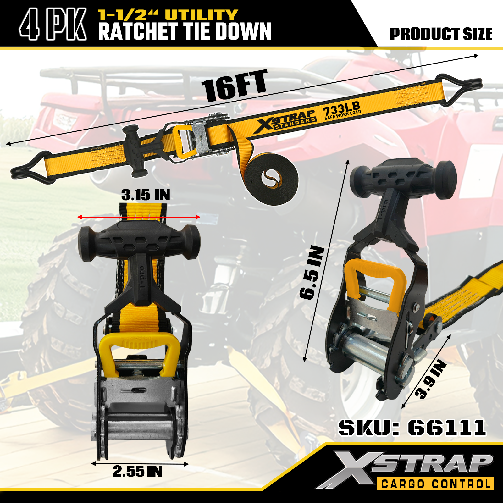 Xstrap T-håndtak Ratchet Tie Down er 1,5 tommer x 16 fot, den sikre arbeidsbelastningen er 1100 pund og bruddstyrken er 3300 pund.