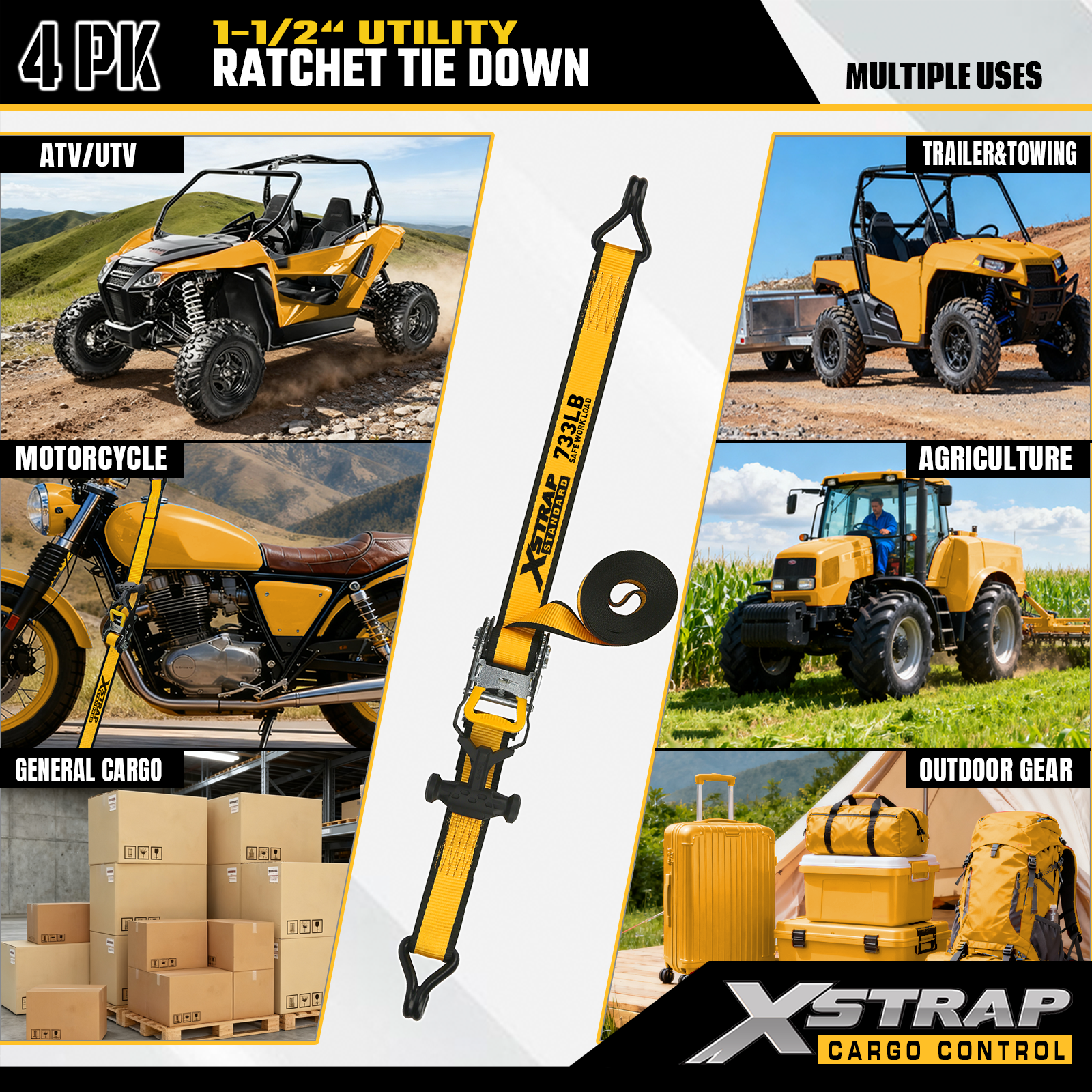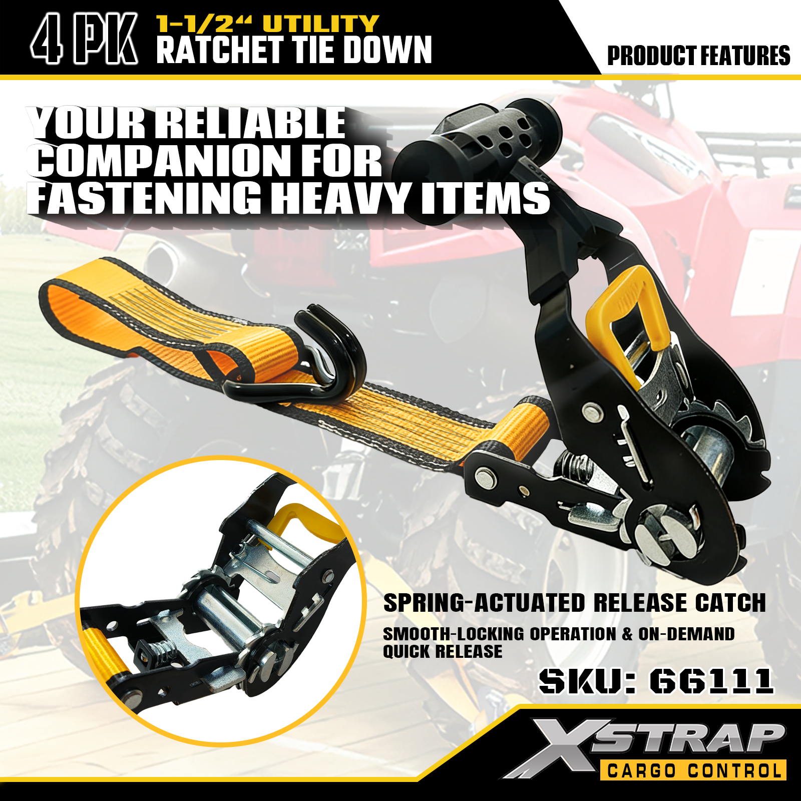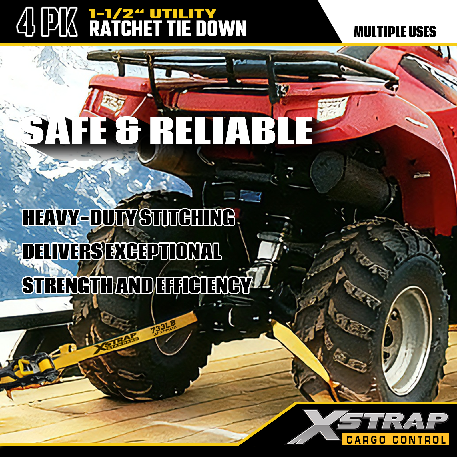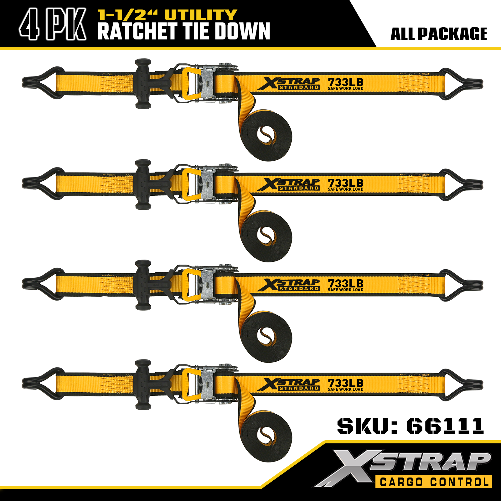 Xstrap T-håndtak Ratchet Tie Down er 1,5 tommer x 16 fot, den sikre arbeidsbelastningen er 1100 pund og bruddstyrken er 3300 pund.
