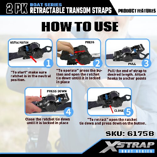 Dette er Xstrap uttrekkbare akterspeilfestestropper med Safety S-kroker. Den sikre arbeidsbelastningen er 1000 pund, og bruddstyrken er 3000 pund.