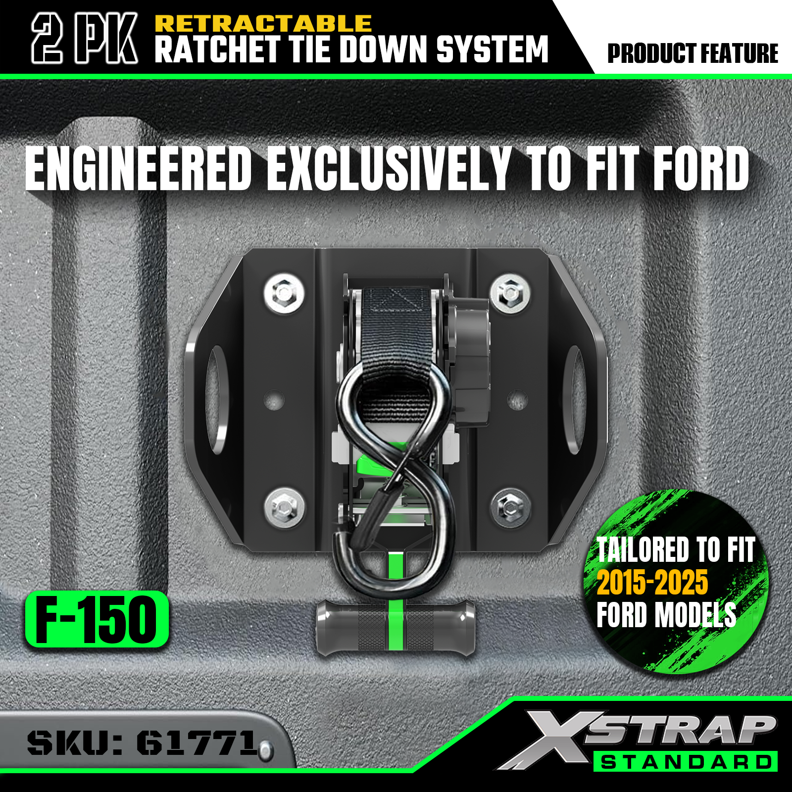 Dette er Xstrap uttrekkbare festestropper Passer til F150 2015-2026 Ford med Safety S-kroker. Den sikre arbeidsbelastningen er 500 lbs, og bruddstyrken er 1500 lbs.