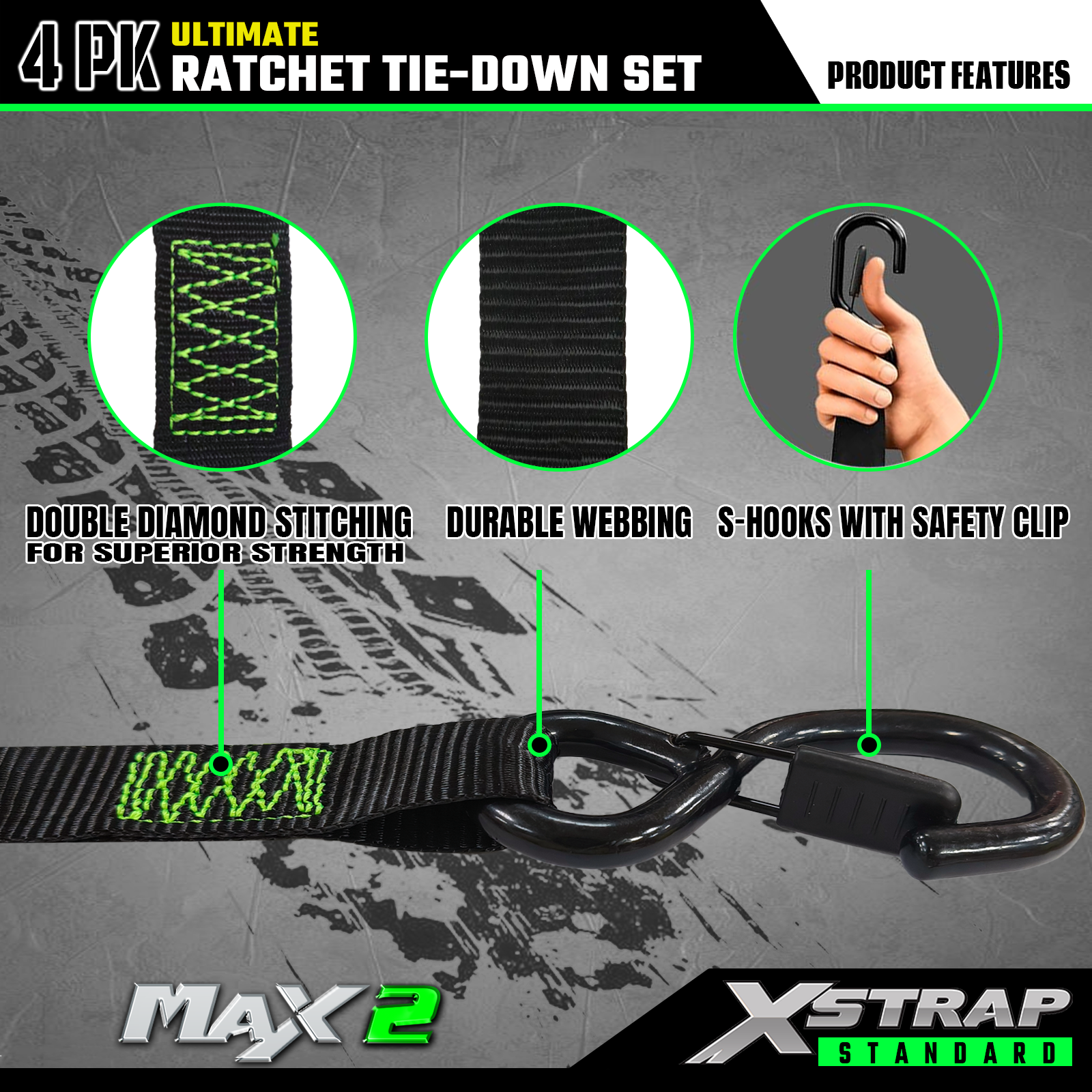Dette er vår 1 tommers 15ft 4pk motorsykkelfestestropper med sikkerhetskroker. Bruddstyrken er 2200 lbs. Det er også 4 stk myke løkker i dette settet.