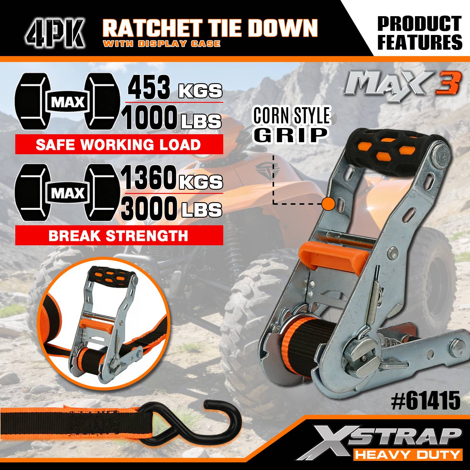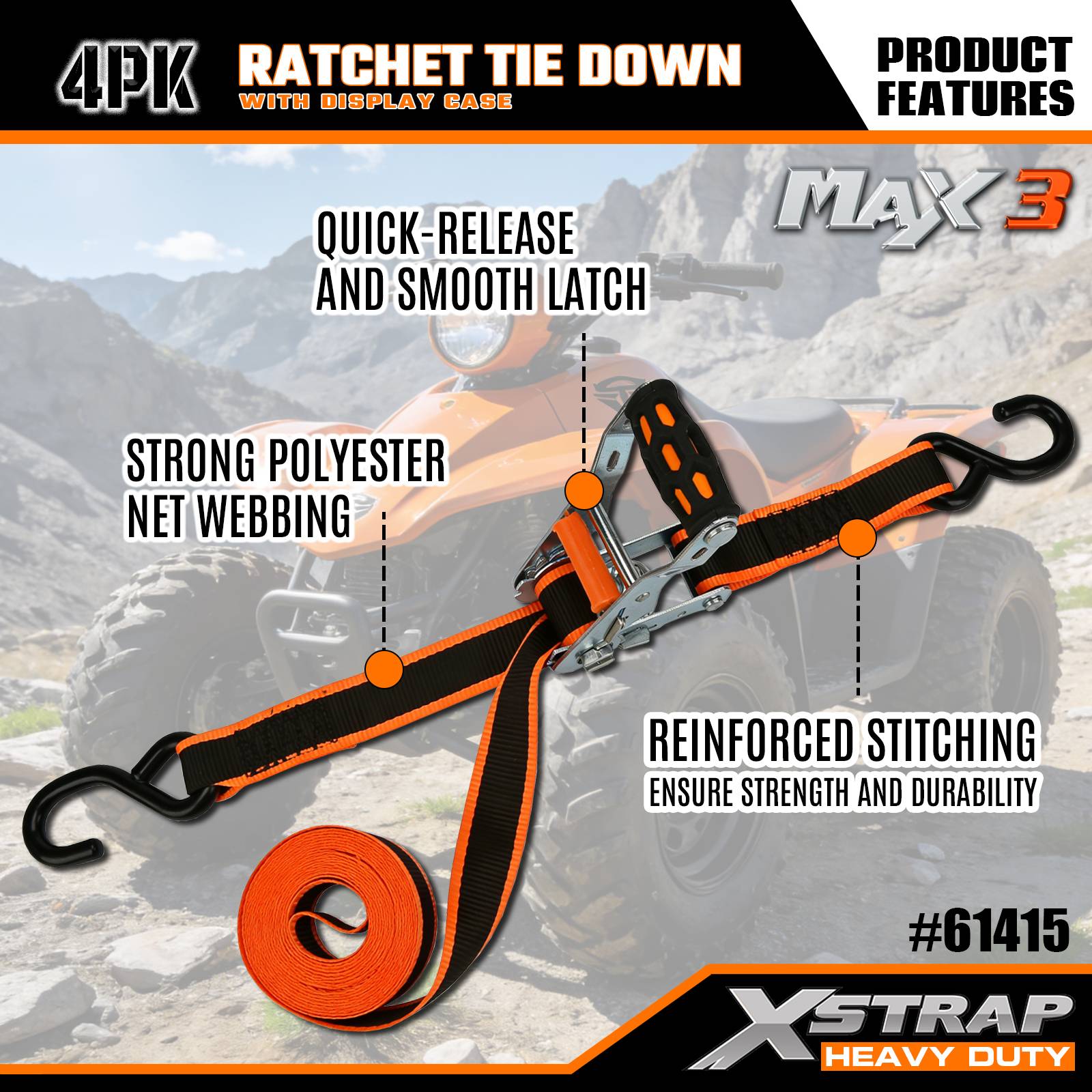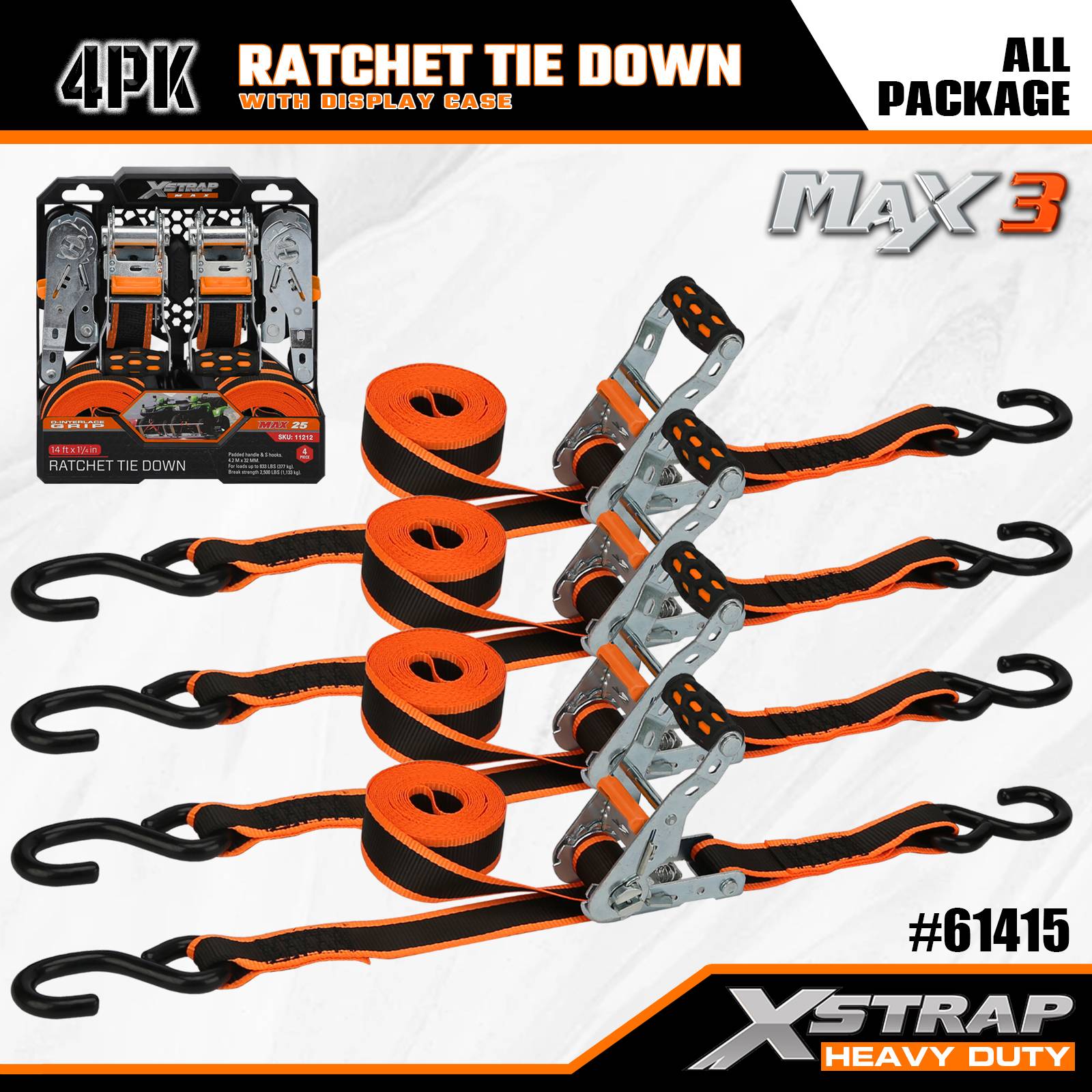 Xstrap 4 Pack Ratchet Tie Down, 1-1/4” x 14″ Polyester Tie Down Strap Trekk Ratchet Strap, 1000 lbs Kapasitet Laste surring sikringsstropper med S kroker for lastebil, SUV, bil topp stativer motorsykkel.